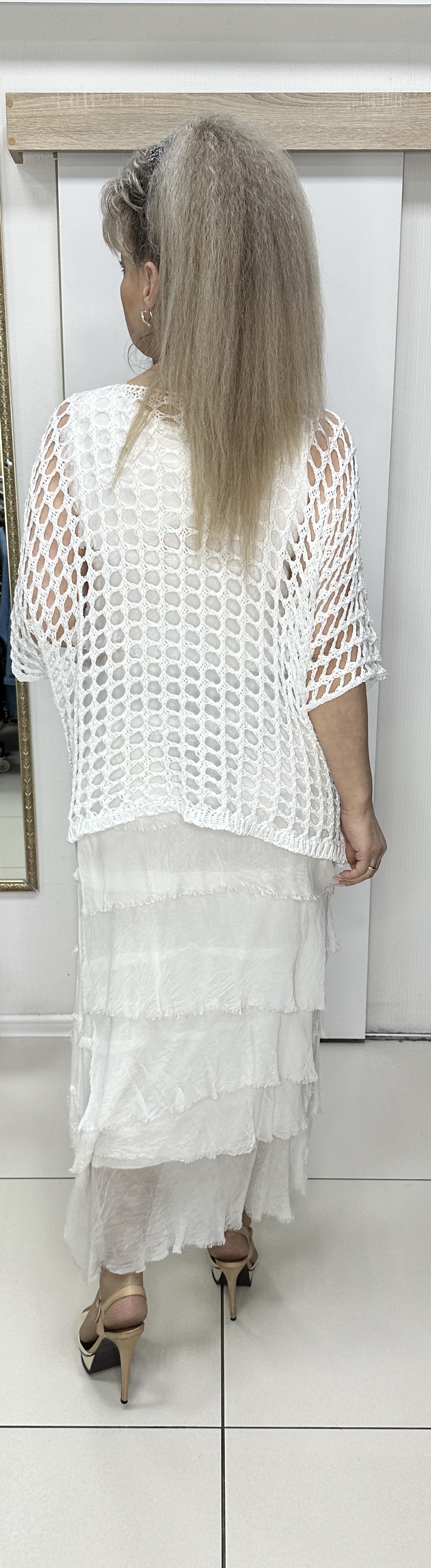 Этот блузон входит в Топ современных блузонов-партнеров. Итальянский блузон-сетка с V образным вырезом декольте модель 9200 может быть вторым слоем одежды на топик, маечку или сарафан (смотрите фото). Самый современный стильный блузон-сетка. В наличии: голубой, черный и белый цвета.