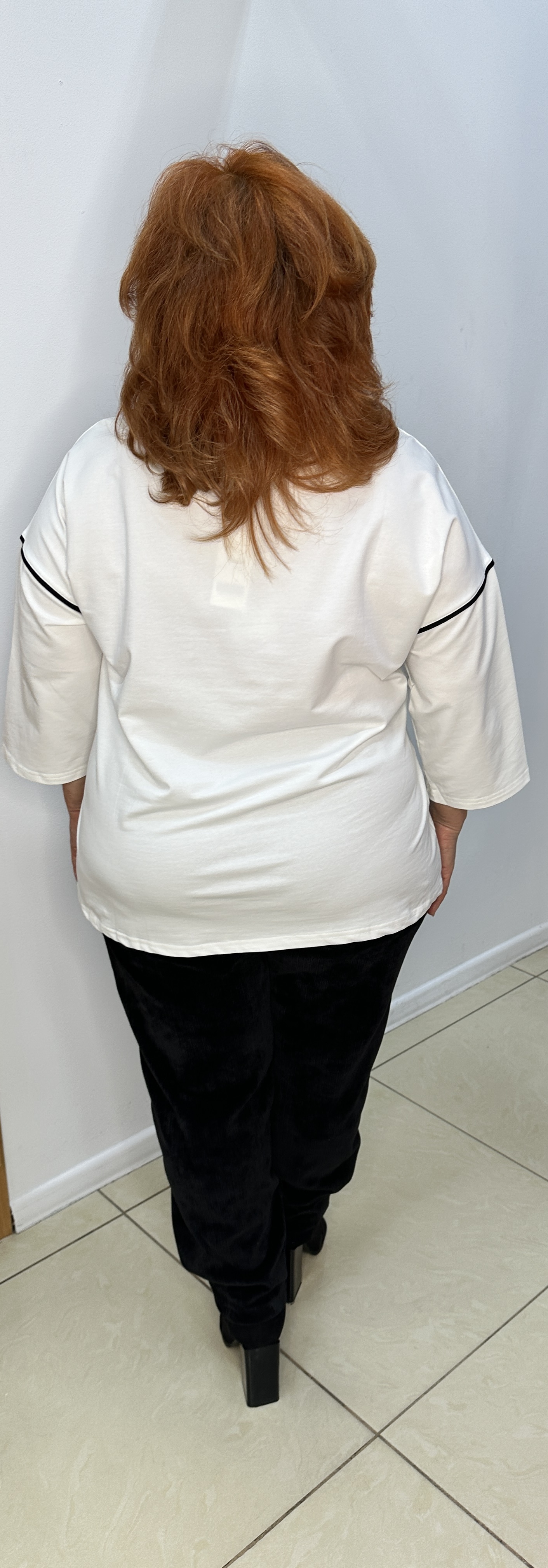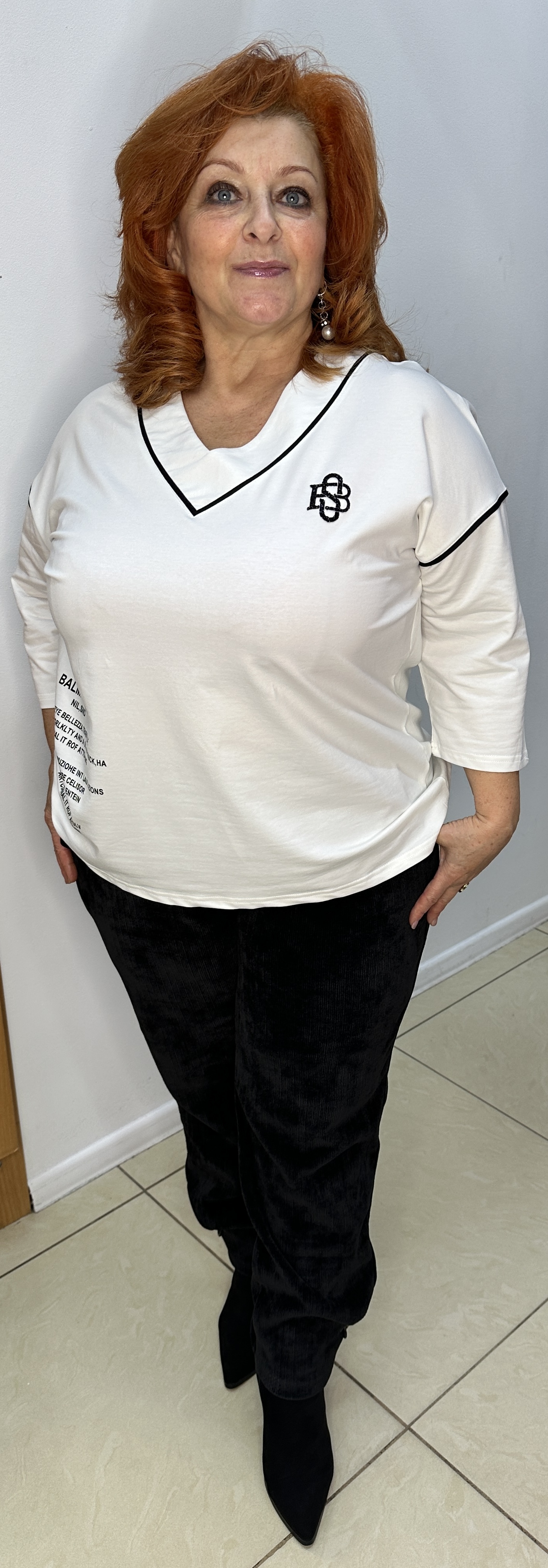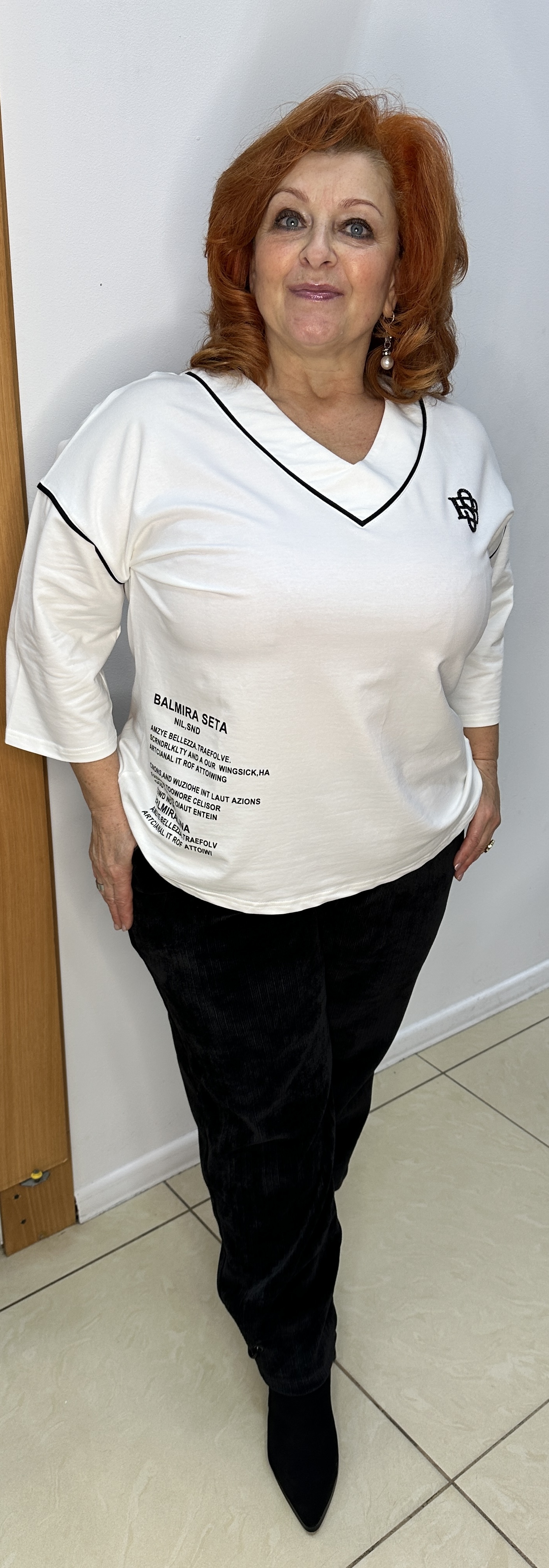 Белый трикотажный блузон с V-образным вырезом декольте модель 2564, хороший выбор для стильной женщины. Прямой фасон, длинный рукав и черный кант, а также черные надписи и эмблема. Достойный вариант повседневной одежды. Хорошо смотрится с любым низом.