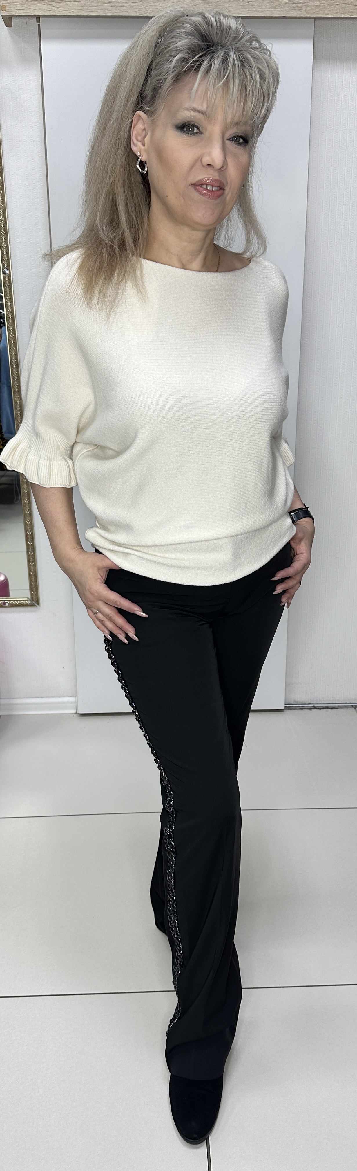 Красивый молочный(белый) цвет! Подыскиваете себе такой светлый джемпер, модель 20971 именно то, что вам нужно! С закрытым декольте и фасоном "летучая мышь", с укороченными рукавами и изюминкой рюшей по ним. Материал блузона очень приятен тактильно и вам будет всегда комфортно. Рекомендуем стильным девушкам.