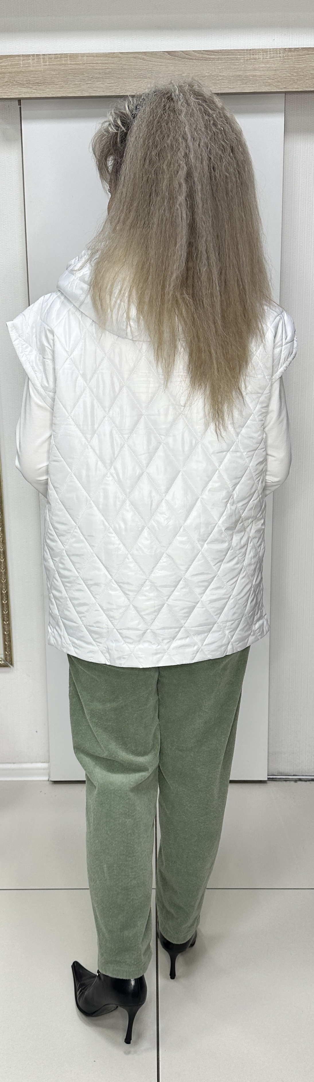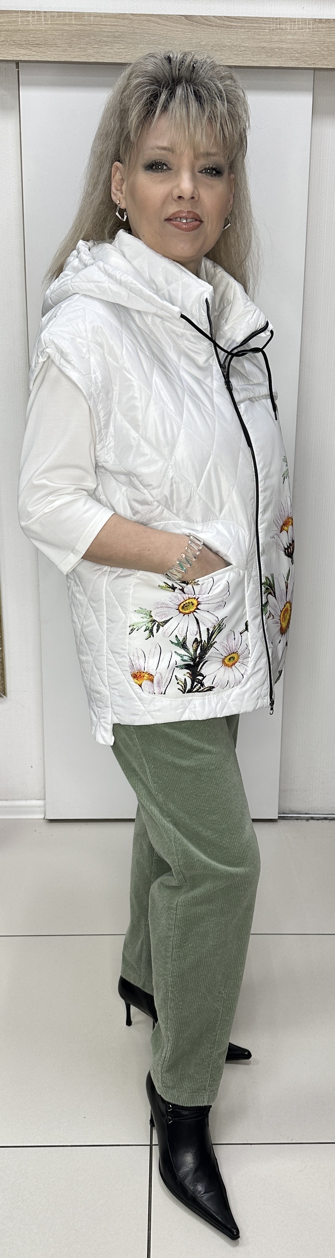 Белый, легкий и в то же время не продуваемый стеганный жилет, с кармашками и цветным принтом из ромашек, модель 2889 на каждый прохладный день. Именно этот принт - добавляют жилету шик. Один кармашек врезной, другой карман накладной, застежка на молнии, съёмный капюшон и стеганный фасон. Отлично смотрится с толстовками, блузами или джемперами различных цветов. Тепло и стильно!