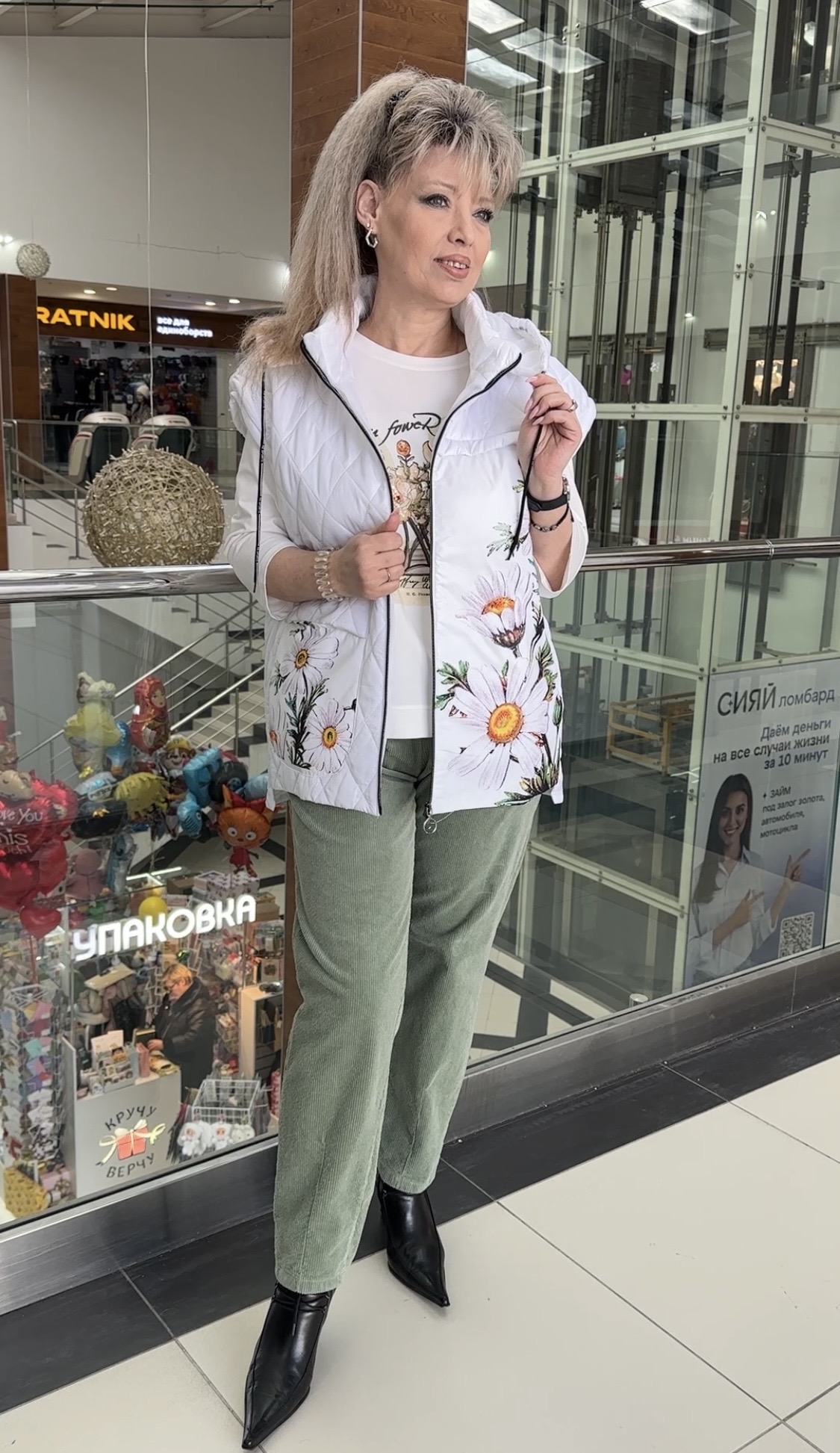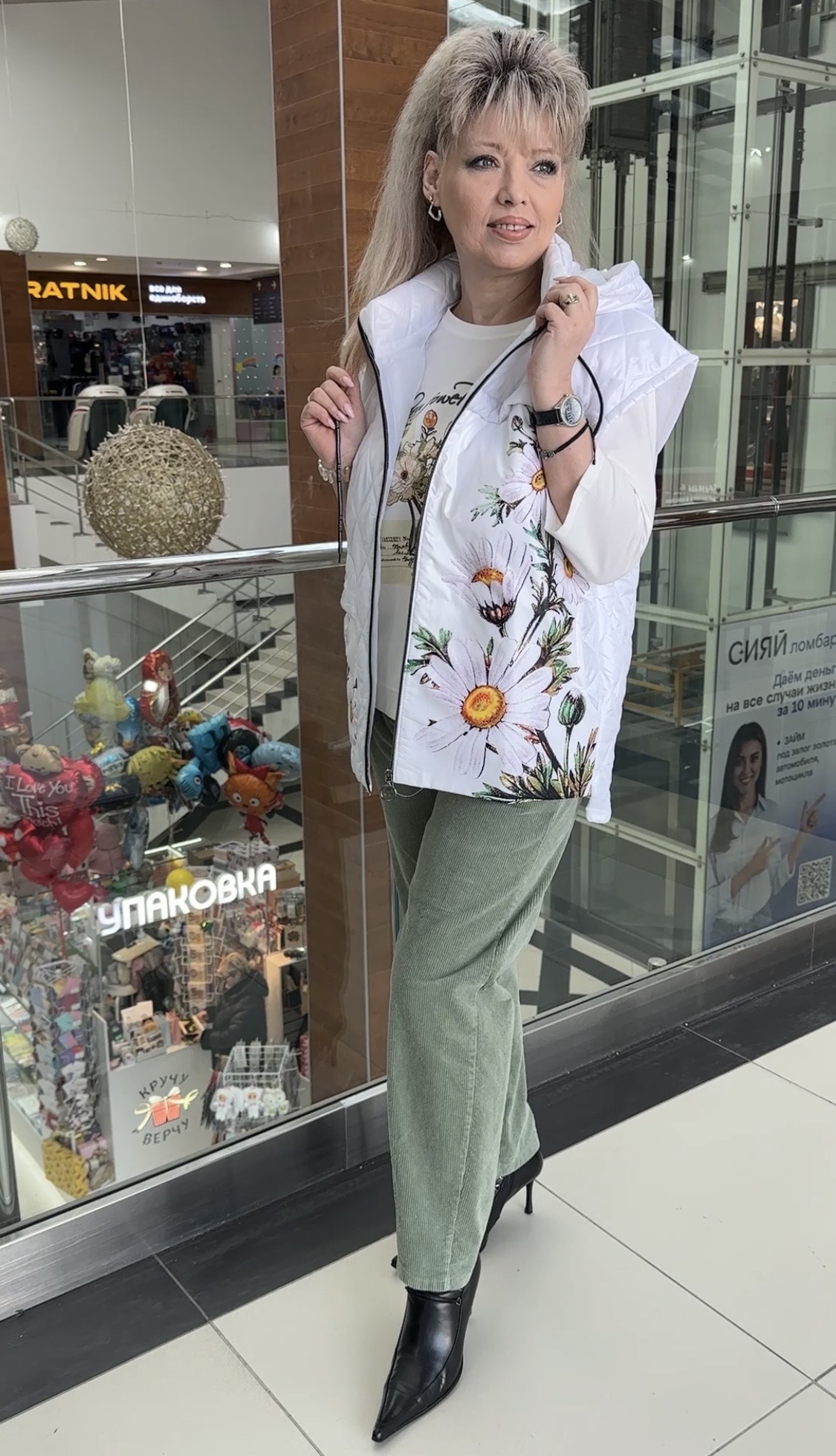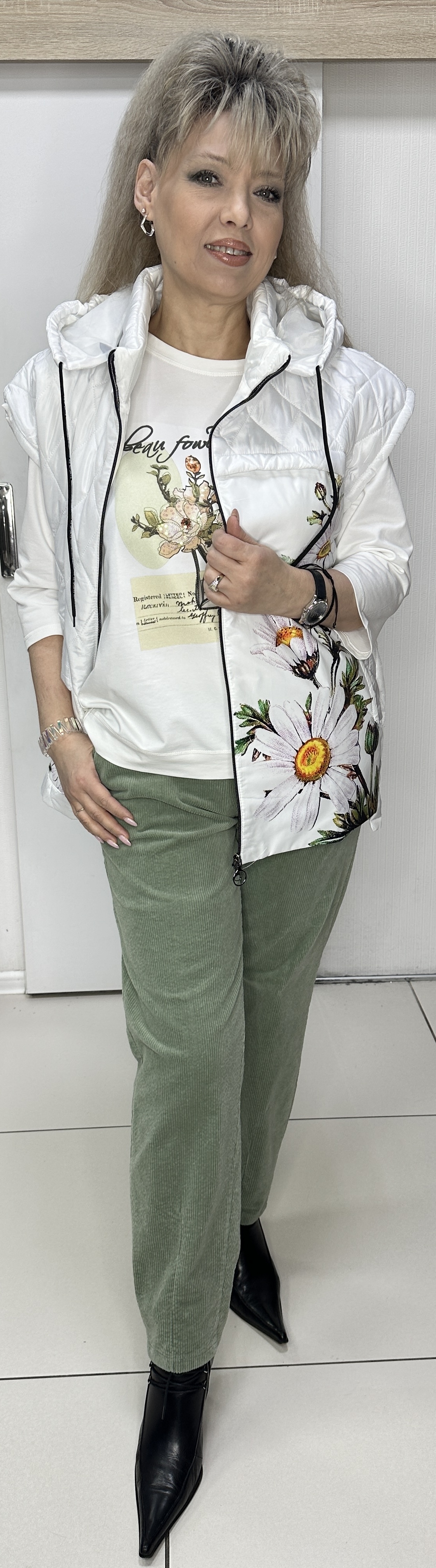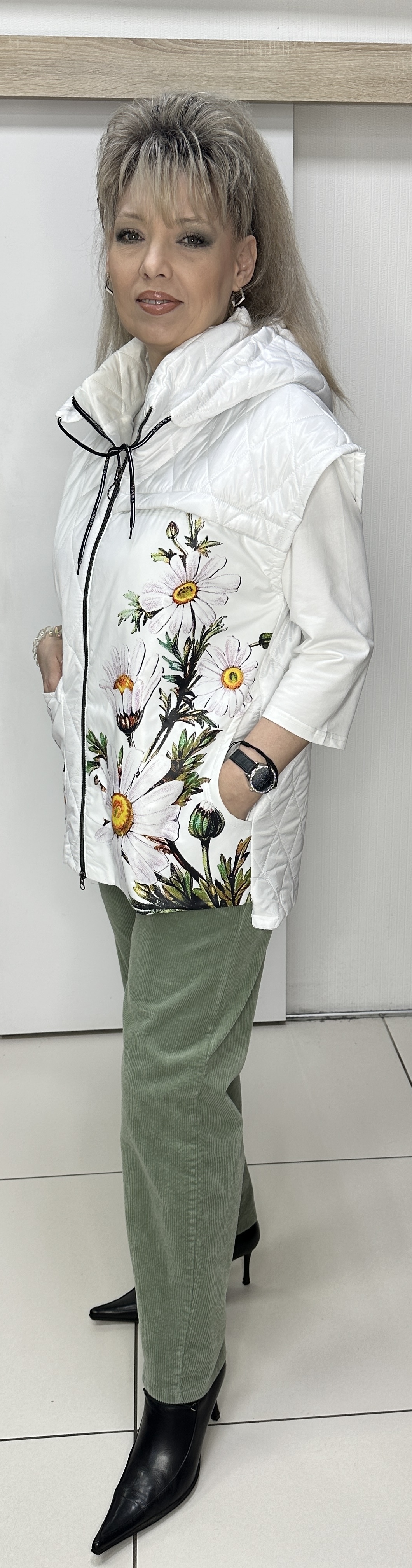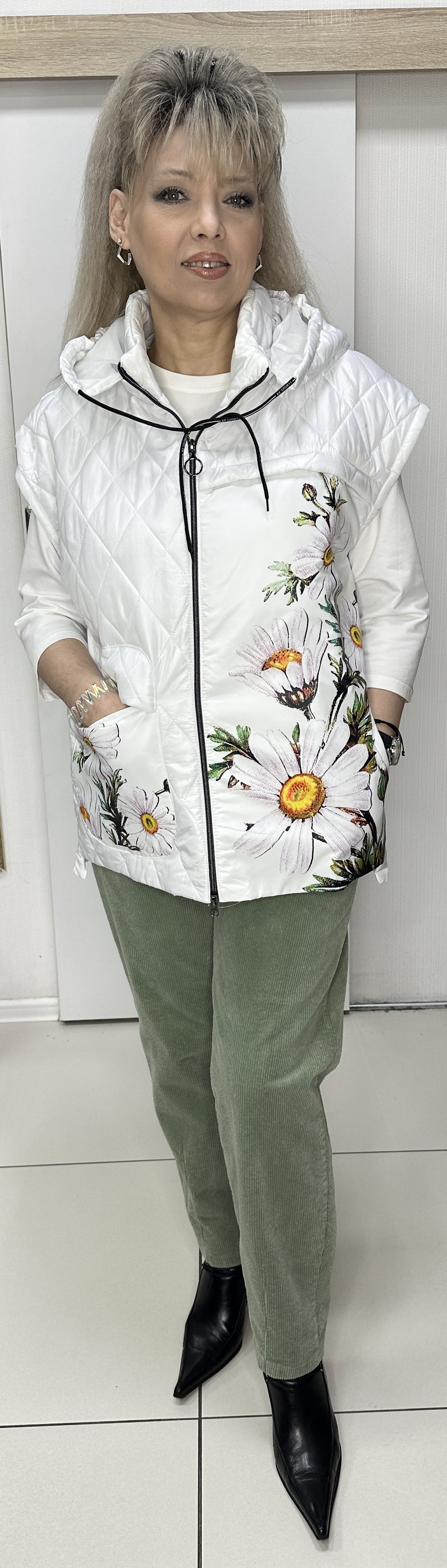 Вы можете купить белый стеганный жилет с принтом из цветных ромашек 2889 в магазинах У Стаса по доступной цене. Модель 2889: описание, фото, состав, производитель.