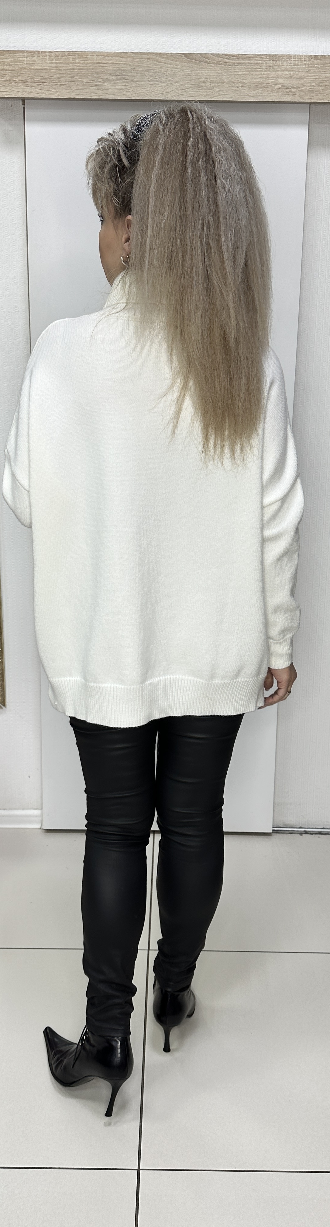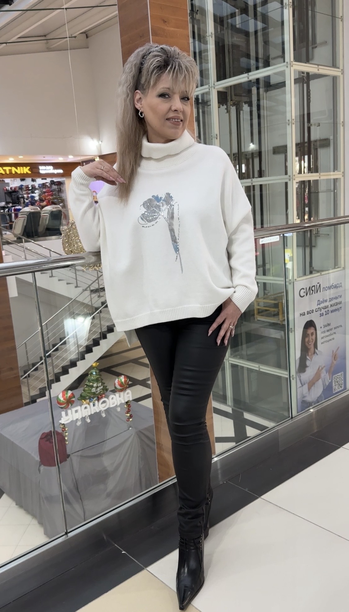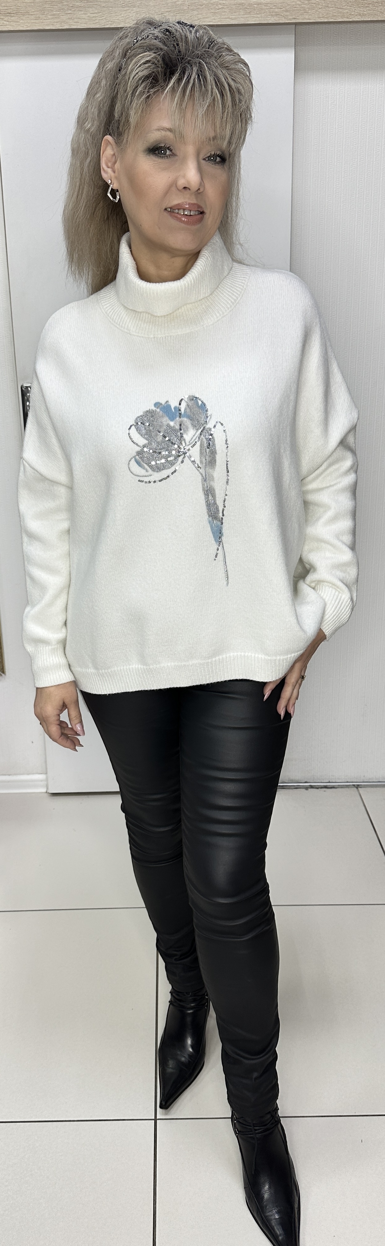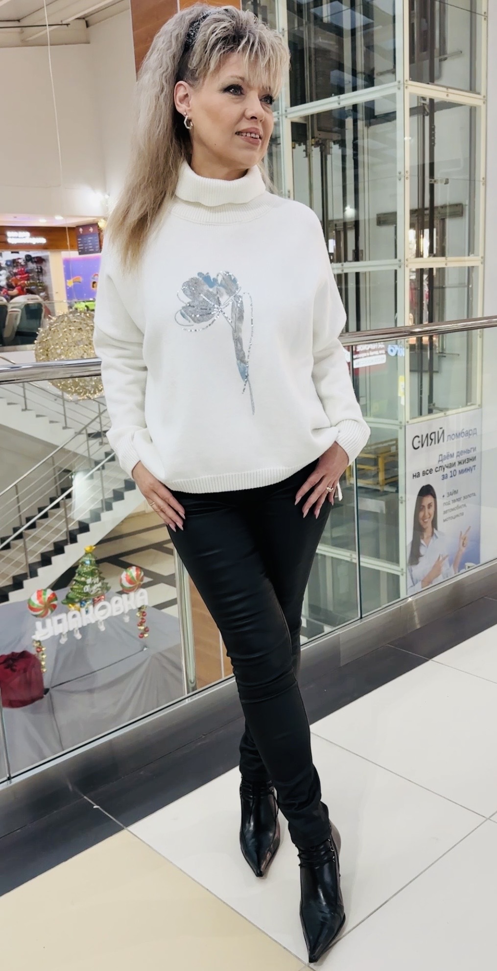 Этот белый свитер красив не только внешне, но и тактильно - он сама нежность модель 15798, будет Вашим любимым свитером не только в этом сезоне! У свитера свободный фасон с удлинением по спине, спущенное плечо и горло-водолазка с отворотом. Изюминка: цветочный принт с пайетками по лицевой стороне, который придает свитеру оригинальность. В нем Вам будет очень комфортно в любой обстановке. Отличный вариант одежды для прохладного сезона.