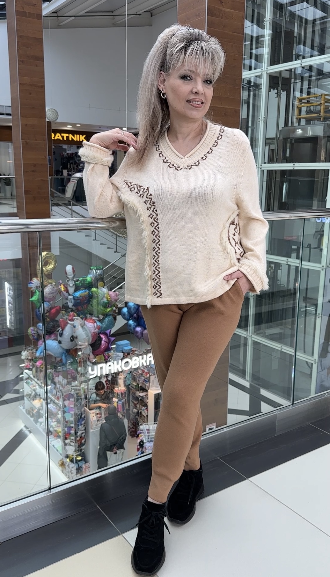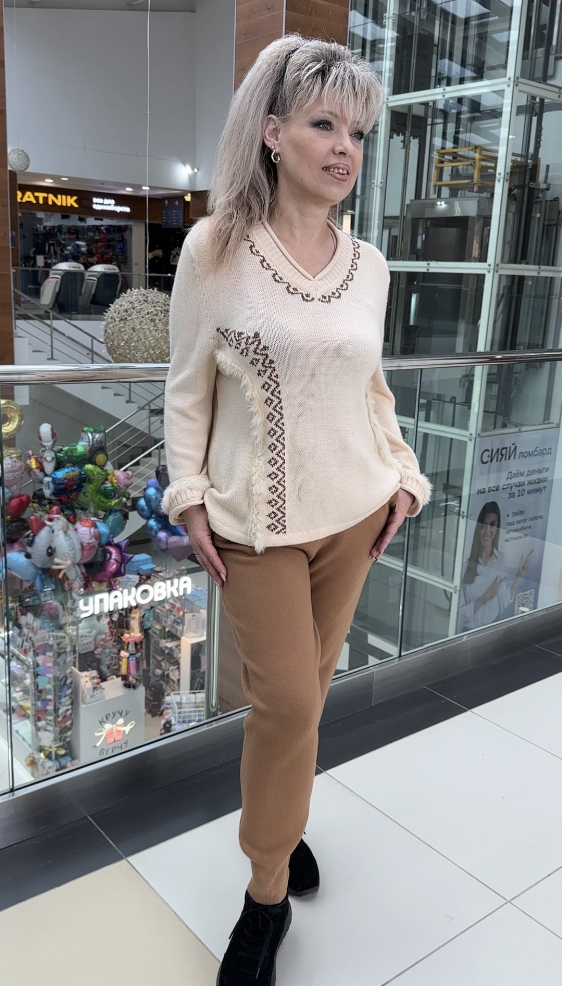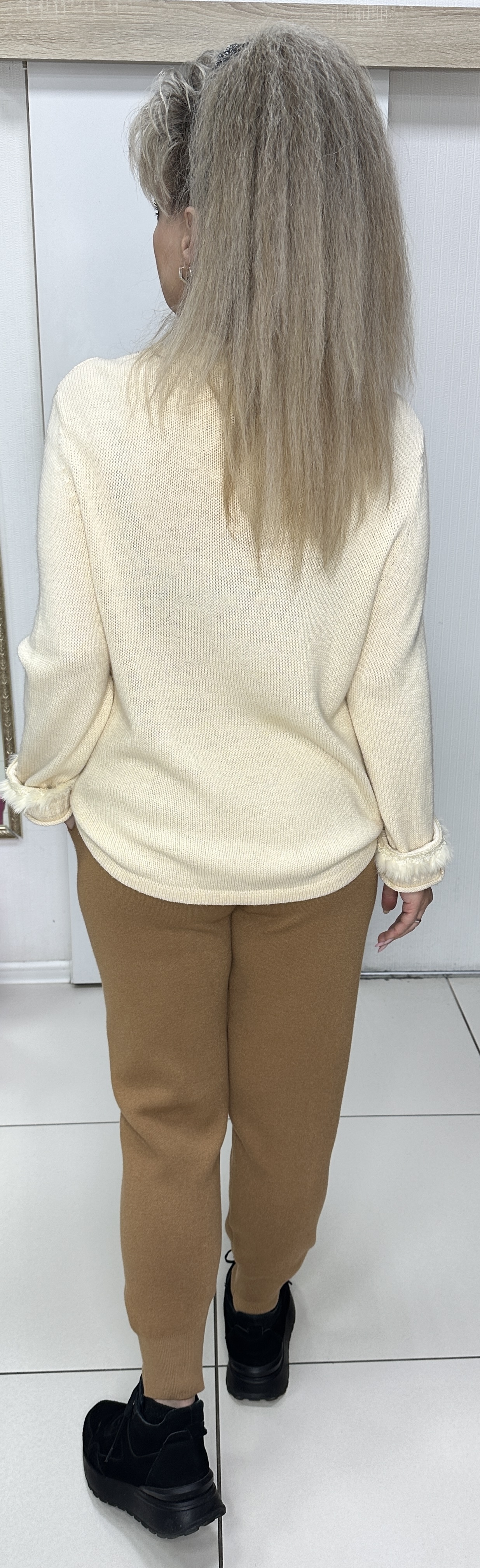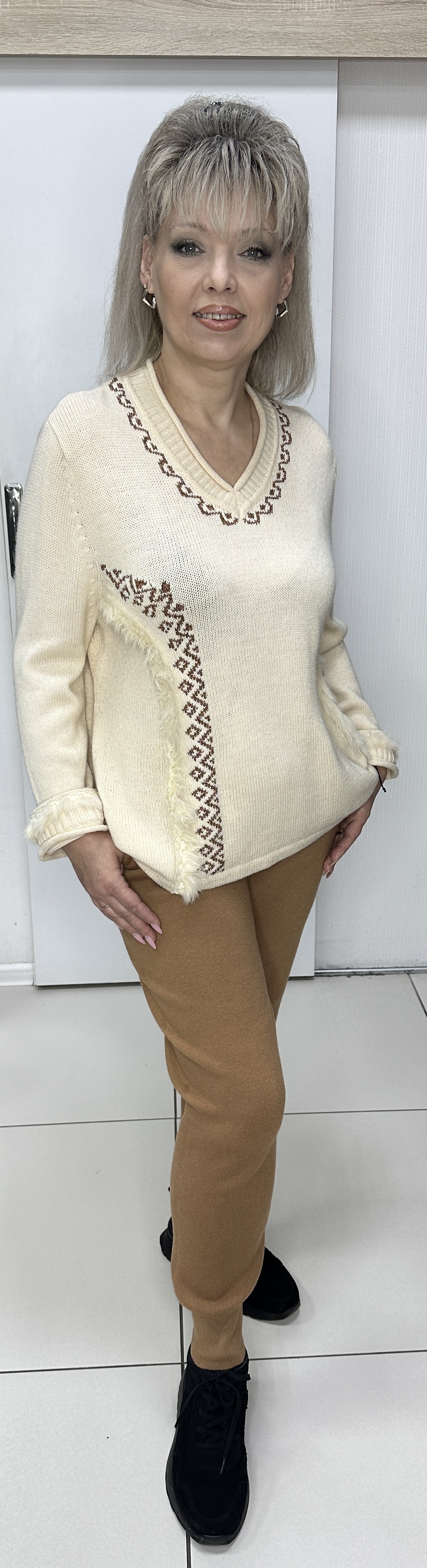 И визуально и по тактильности этот светлый джемпер занимает первое место в нашем рейтинге. Джемпер с V-образным вырезом, коричневой отделкой и меховой оторочкой модель 817036 на каждый прохладный день. Фасон свободный, прямой. Самый востребованный фасон. Остался последний размер!