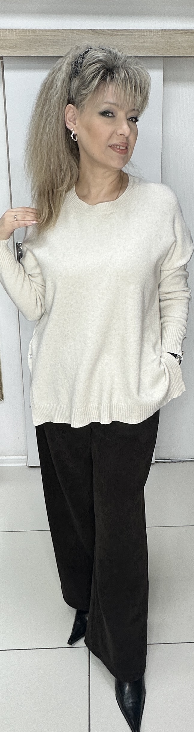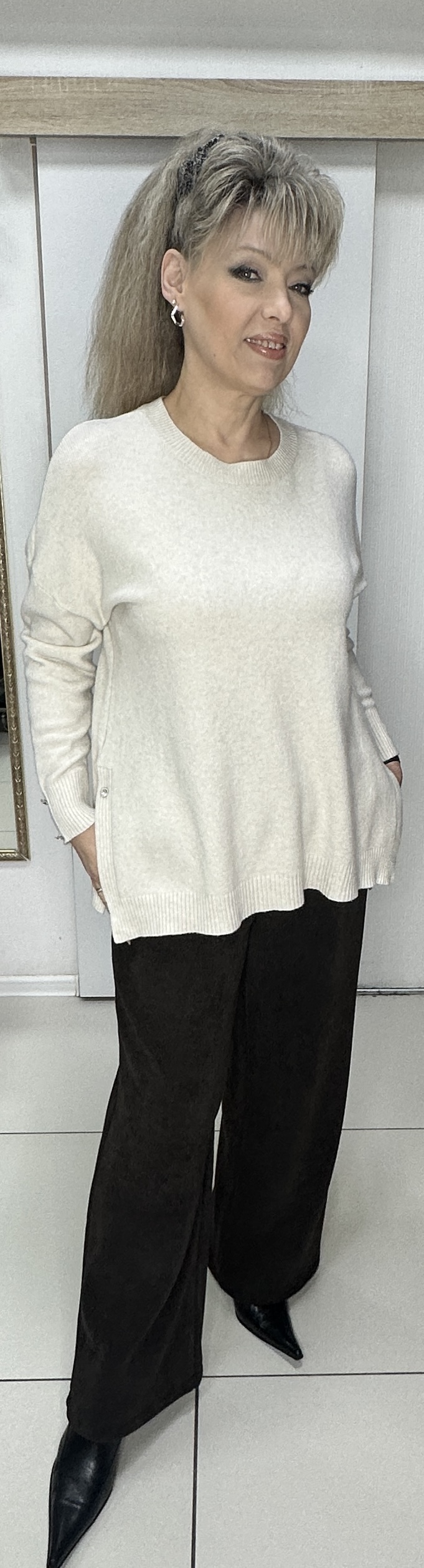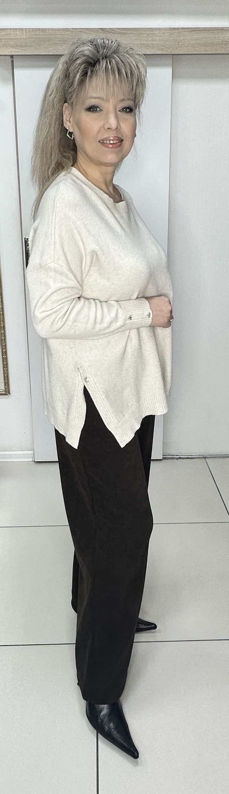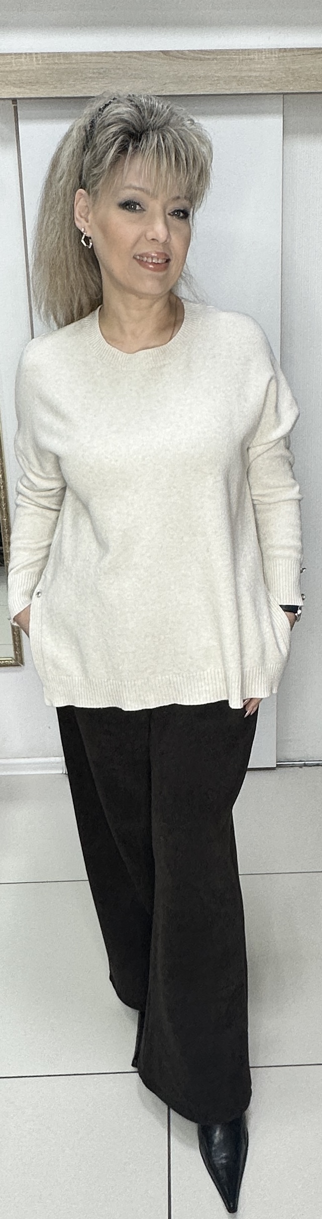 Шикарный джемпер с разрезами. Предлагаем этот тонкий бежевый джемпер с разрезами по бокам и пуговкой с блеском модель 8735. Такие же пуговки по 2 шт. и на рукавах. Отличный вариант одежды для прохладного сезона. В наличии один размер и бежевый цвет.