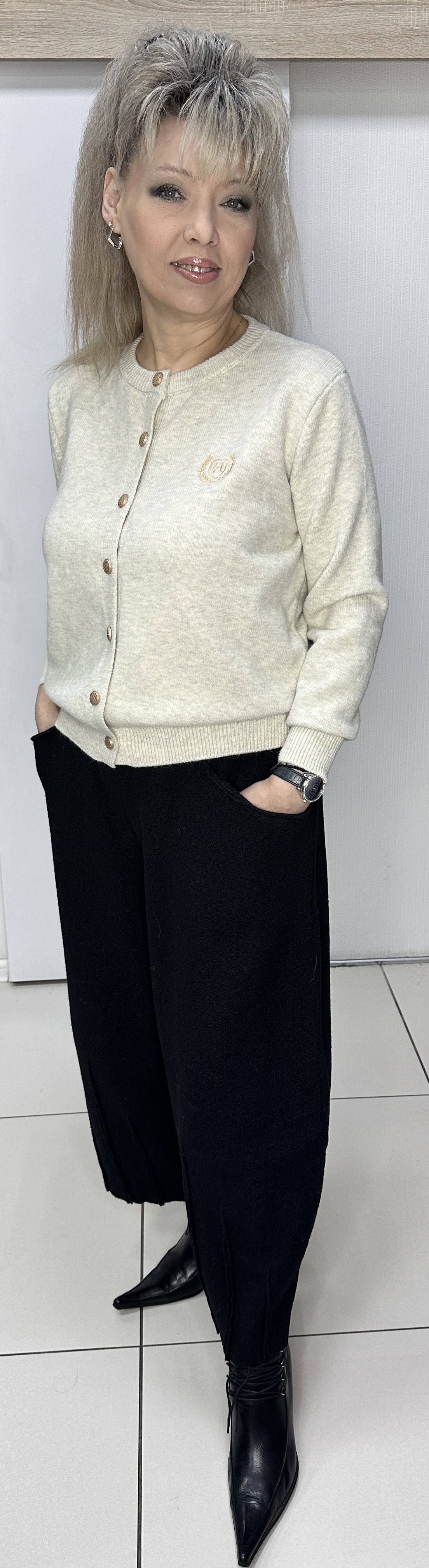 Жакет на круглый год! И теплый и красивый с меланжевой нитью. Бежевый трикотажный жакет-кофта на пуговицах, с эмблемой модель 725 отличный вариант повседневной одежды. Красивая вязка, без воротника тепленький жакет всегда займет достойное место в вашем гардеробе. Рекомендуем всем женщинам(девушкам).
