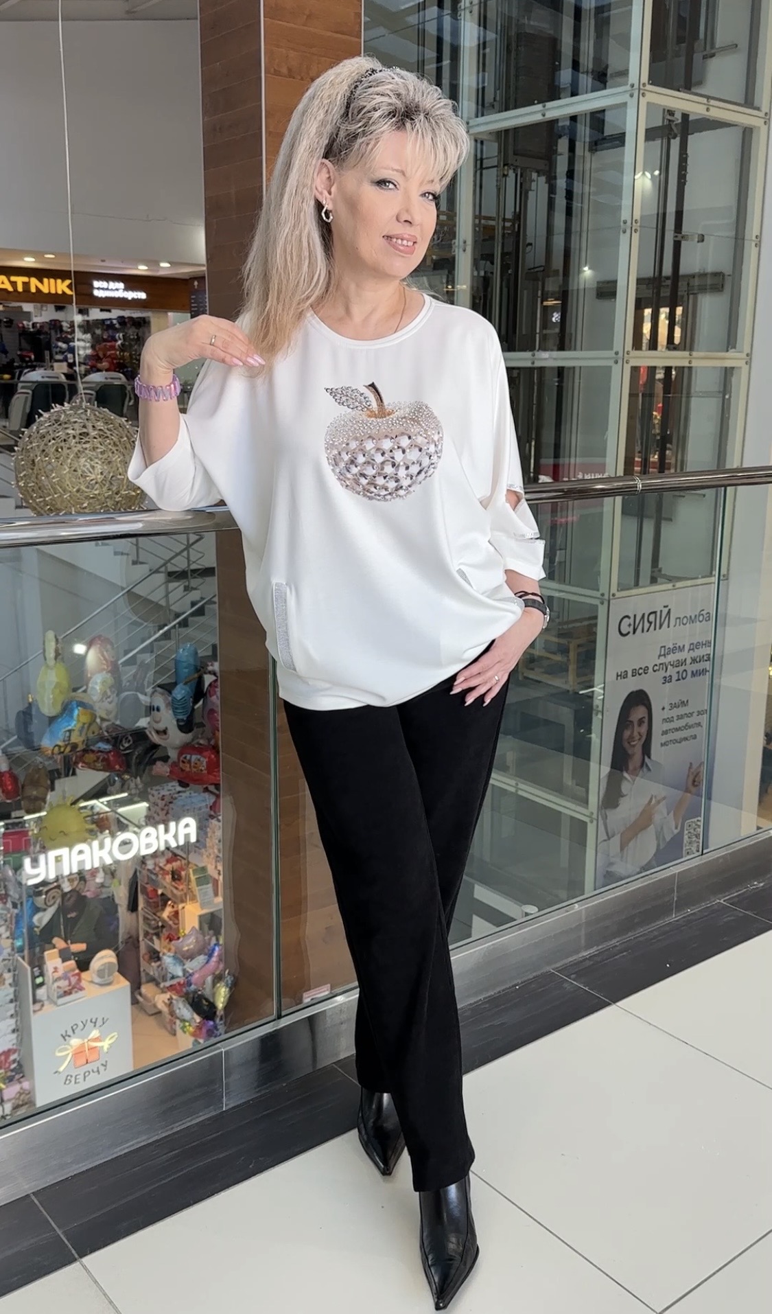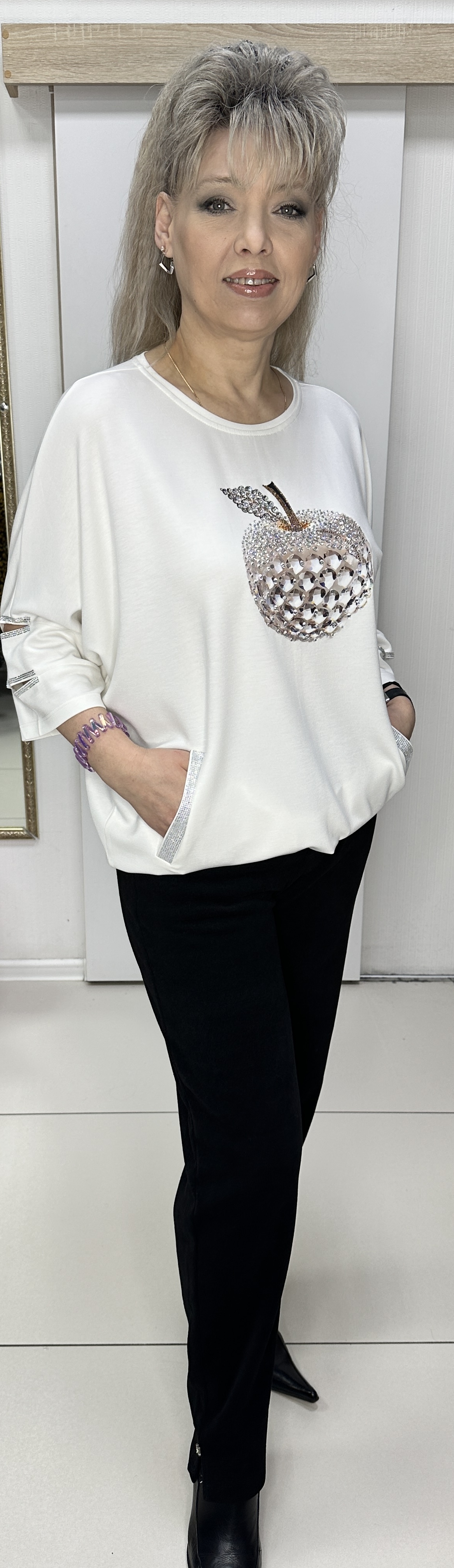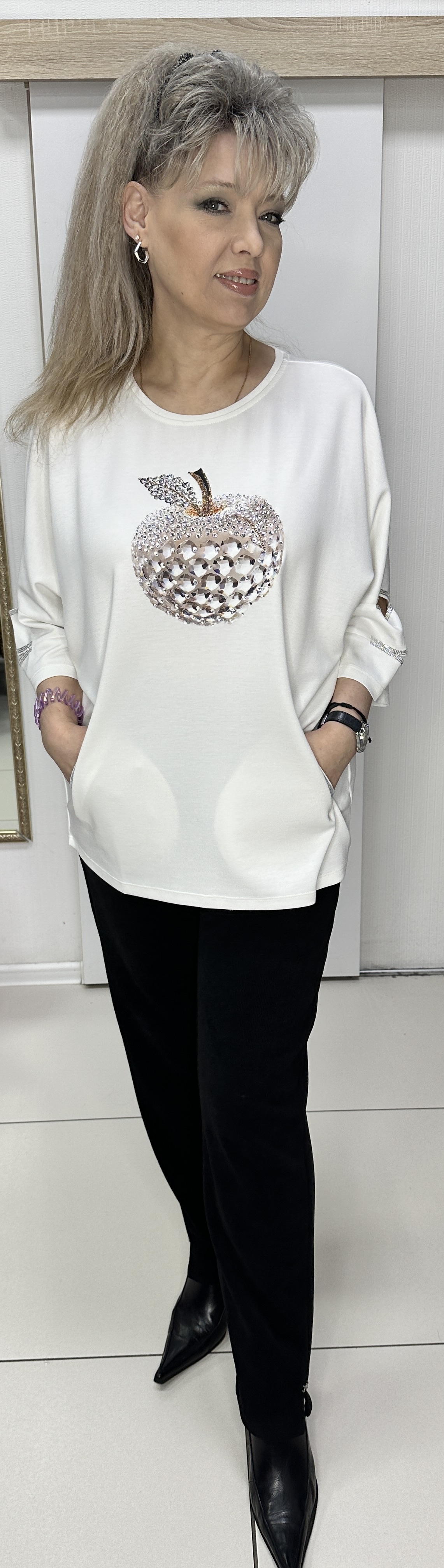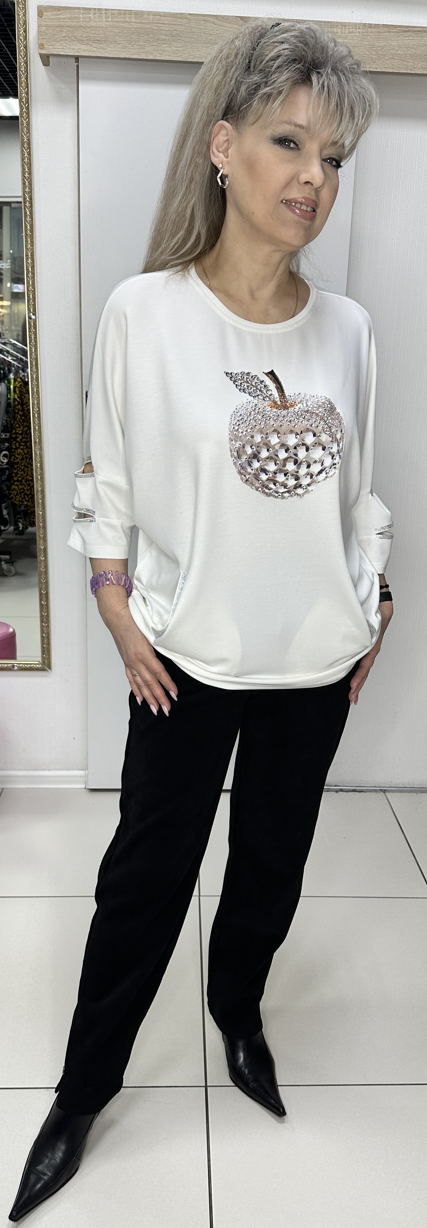 Самый модный, самый стильный блузон-джемпер со стразовыми кармашками модель 7667, который должна иметь каждая модница! Бело-золотое яблочко в обрамлении страз в виде принта по лицевой стороне, это тренд! Изюминка или завлекалочка это разрезы по рукавам в стразовом обрамлении. Материал блузона очень приятен на ощупь и вам будет всегда комфортно. В наличии: белый, черный и красный цвета. Рекомендуем стильным девушкам(женщинам).