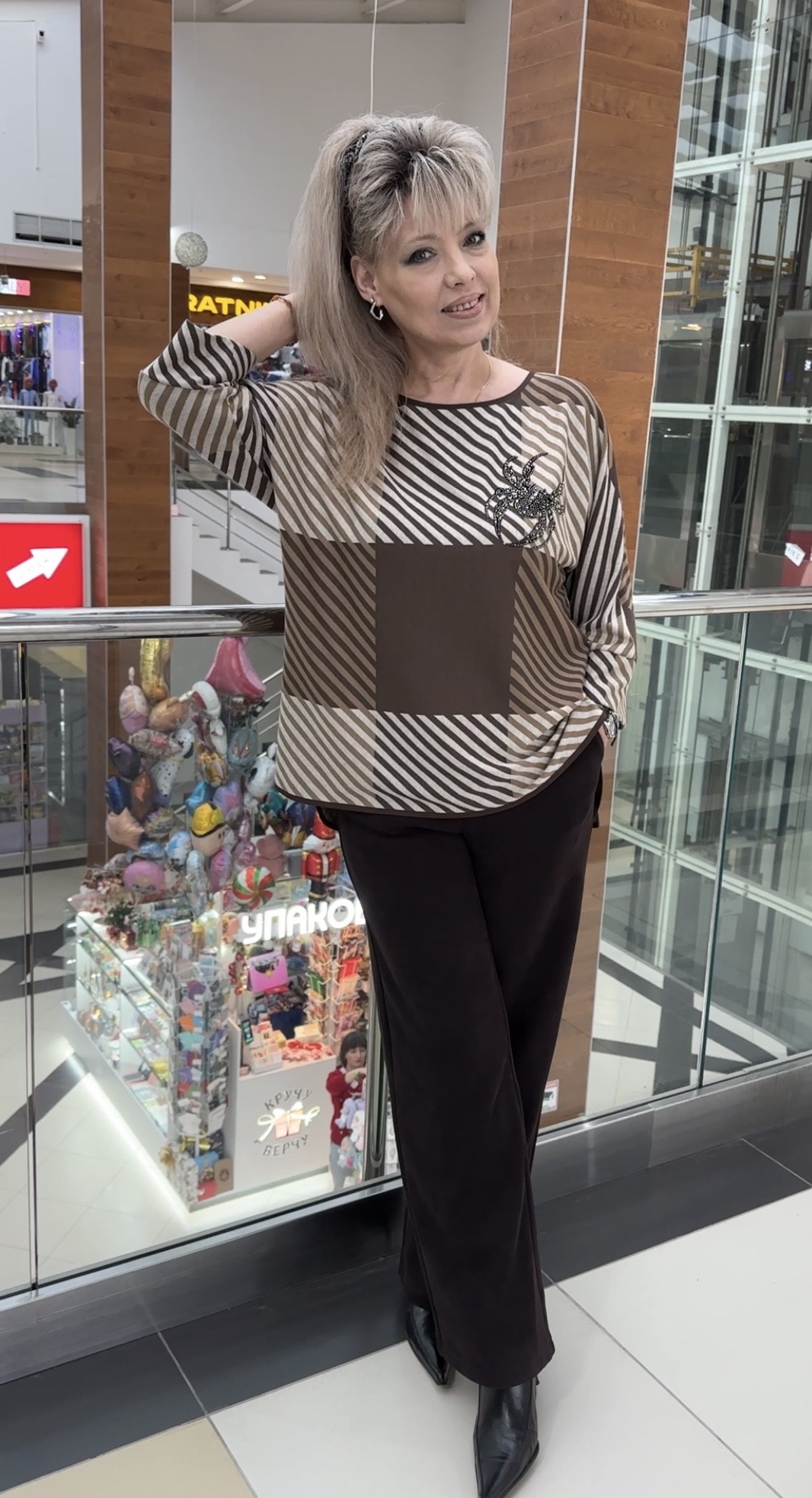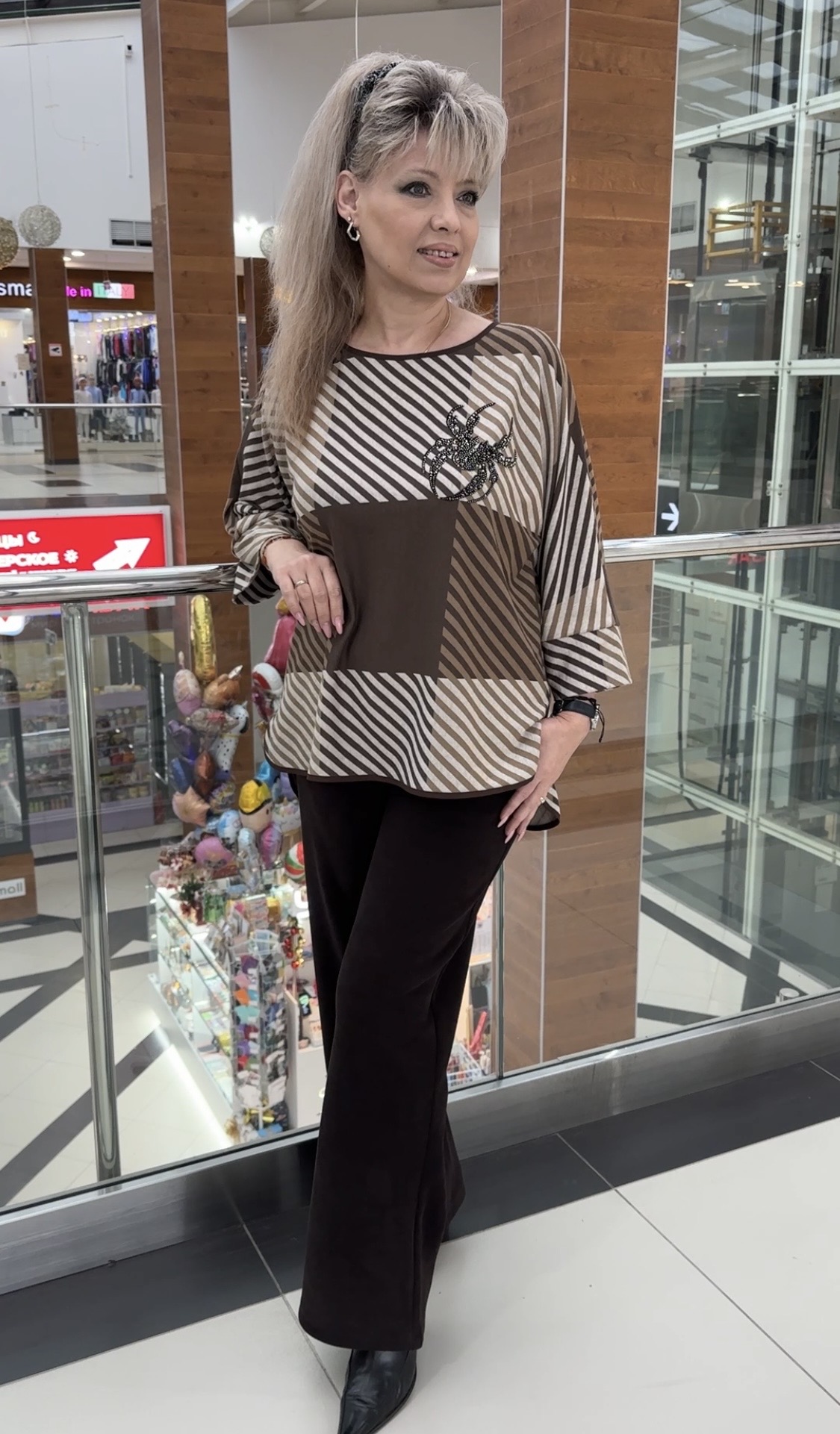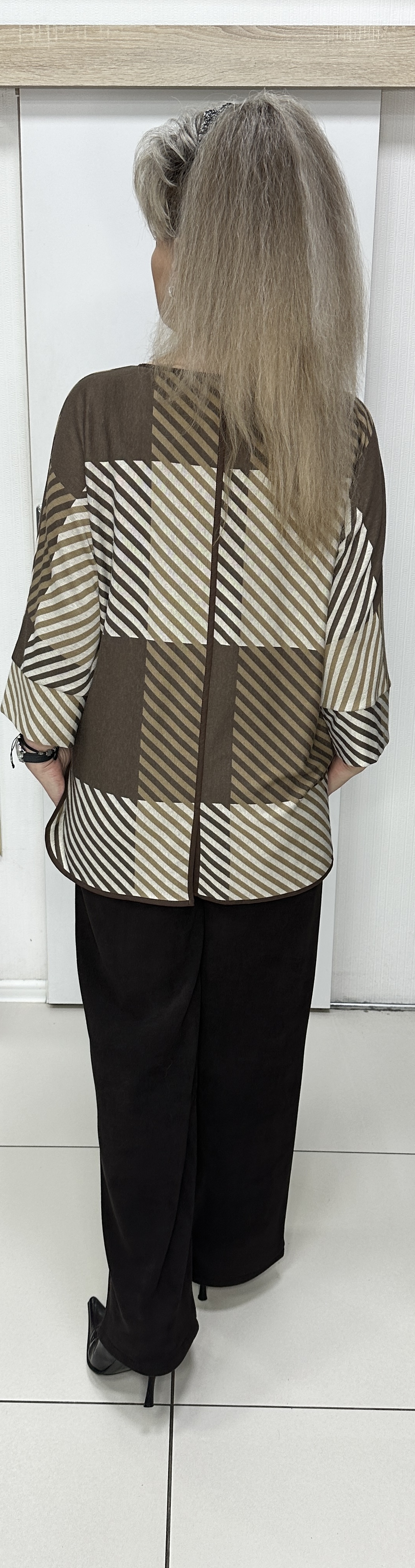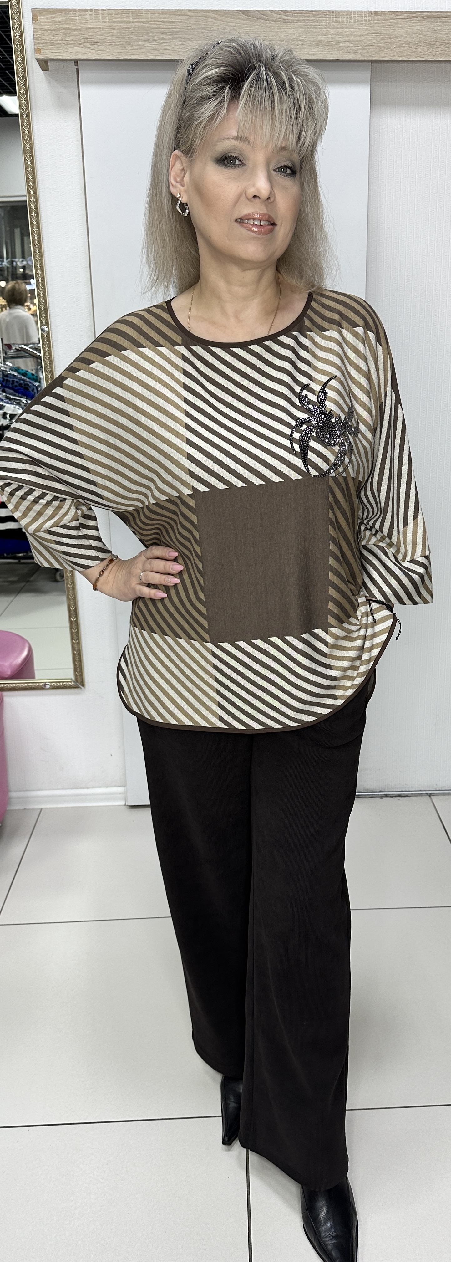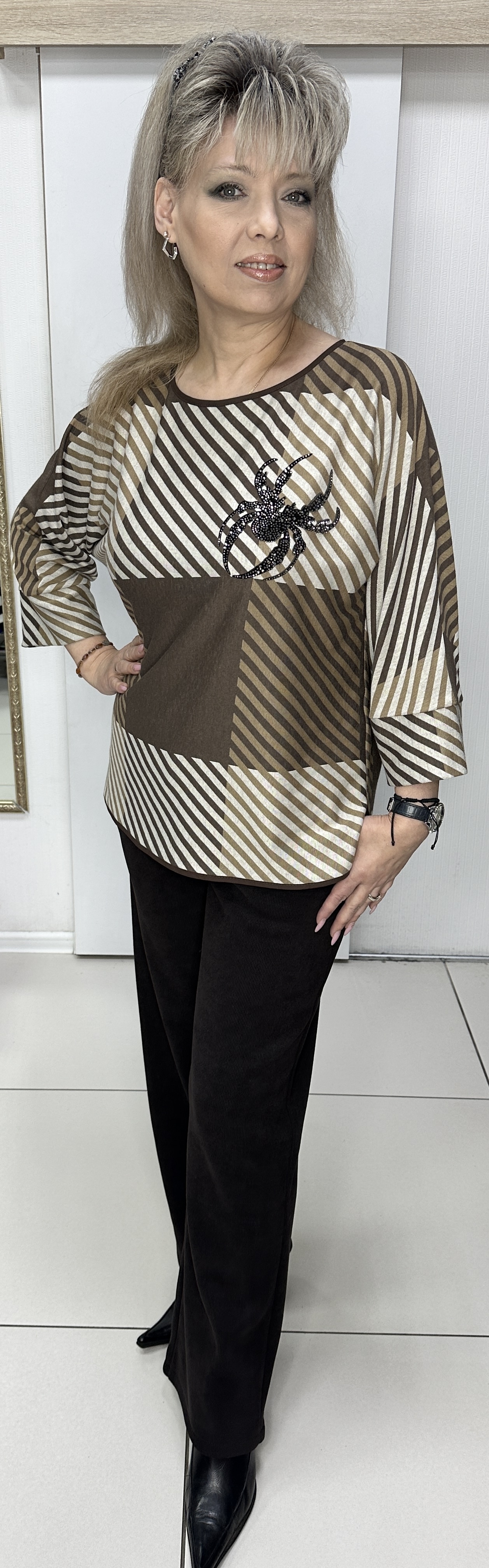 Тонкий, трикотажный и невероятно нежный тактильно блузон с оригинальным изображением квадратов и полоски модель 13357, который сделает ваш образ неотразимым. Изюминка: принт из стразового краба по левому плечу и прямой фасон блузона. По лицевой стороне блузон корче, чем по спине, разрезы по бокам и по спине. В нем Вам будет одинаково комфортно как на праздничном мероприятии, так и в повседневной жизни.