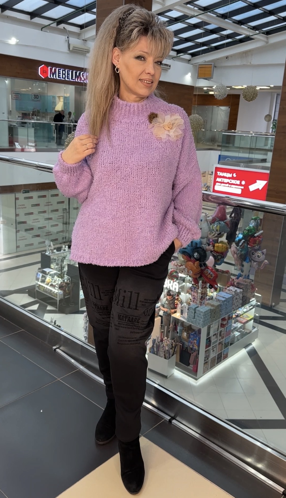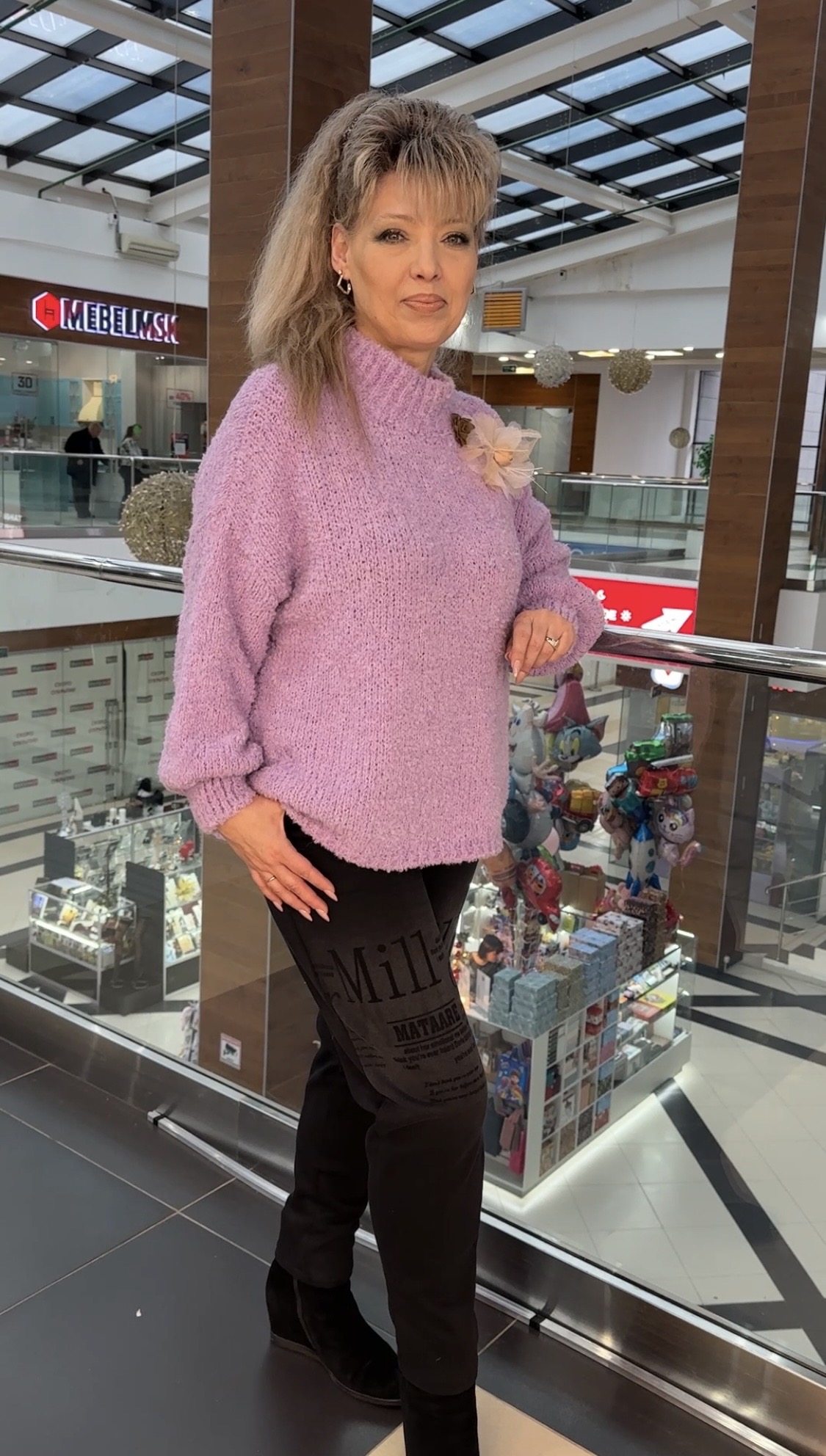 И тактильно очень приятный джемпер и визуально, тоже отличная модель. У джемпера горловина - стойка, которая не давит и съёмными розочками/ брошками, модель 87878, будет удачным приобретением для зимнего периода времени. Фасон прямой, свободный, спущенные рукава и красивая вязка. В наличии белый и лавандовый цвета.