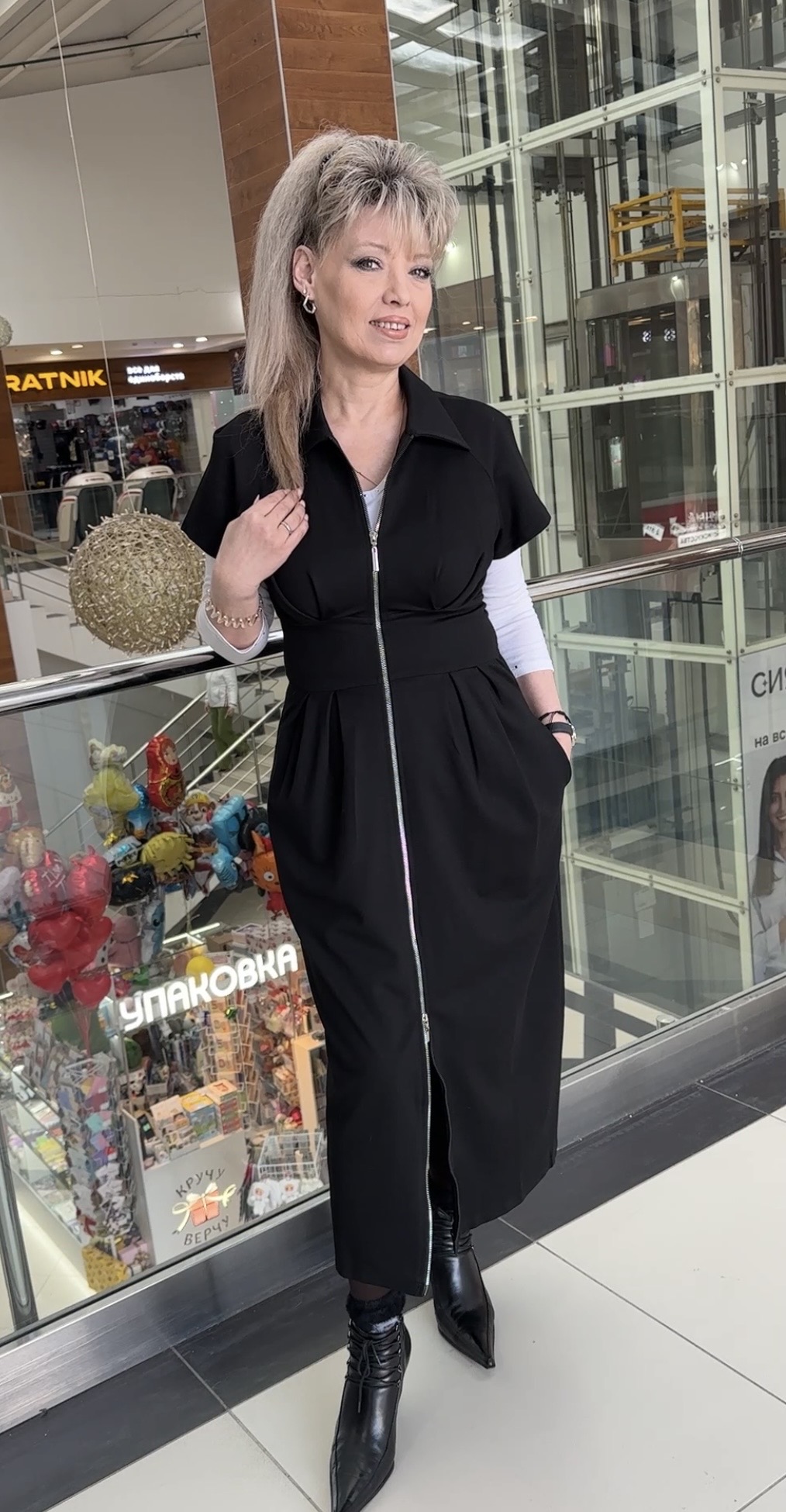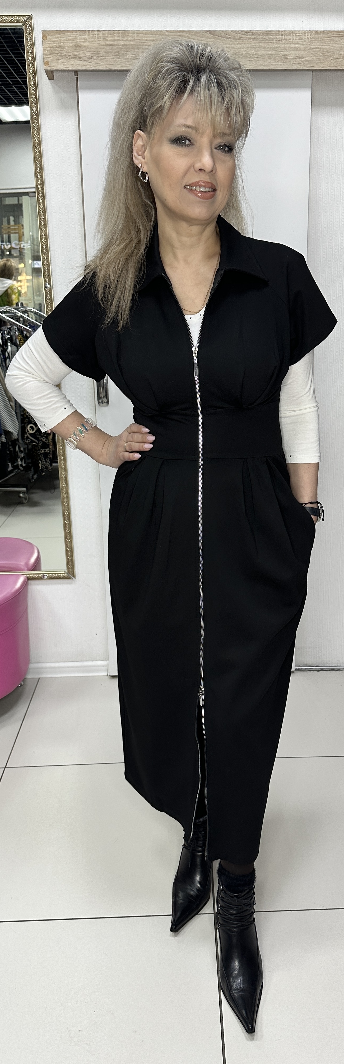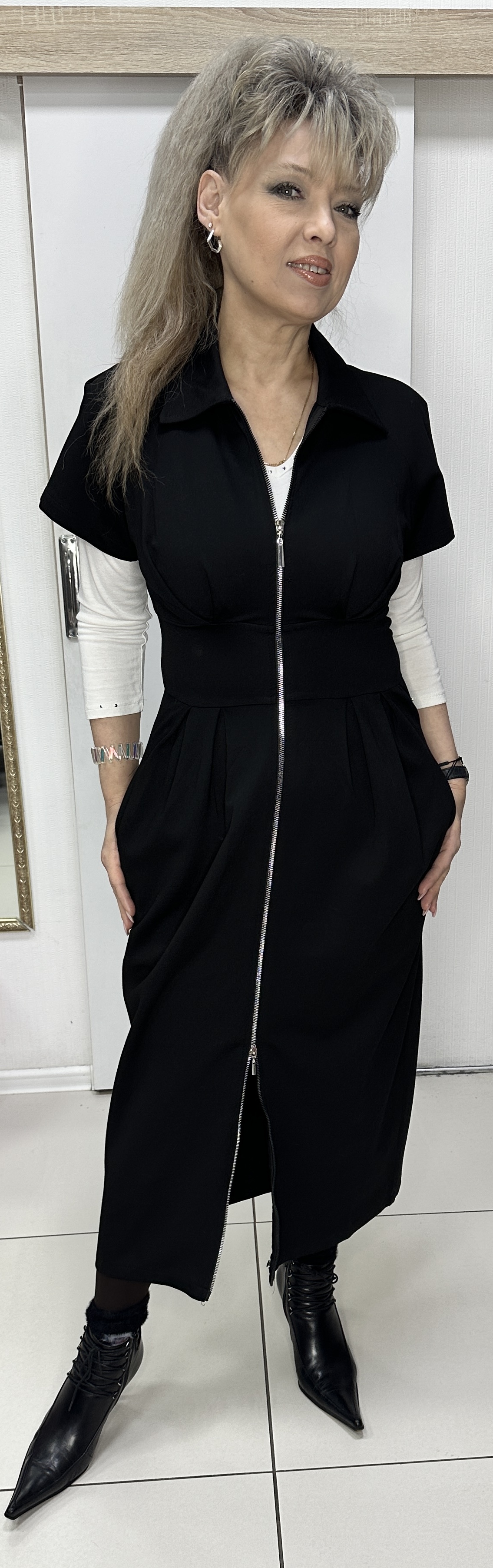 Про эту модель платья хочется сказать : Очень просто и стильно! Черное длинное платье с короткими рукавами, отрезной талией и кармашками на молнии модель 2899 подойдет на каждый день и на торжественный случай. Фасон платья на молнии с "мягкими" заложенными складками и "баллончиком" к низу. Возраст в этой модели стремительно убывает, делая свою обладательницу молодой, эффектной!