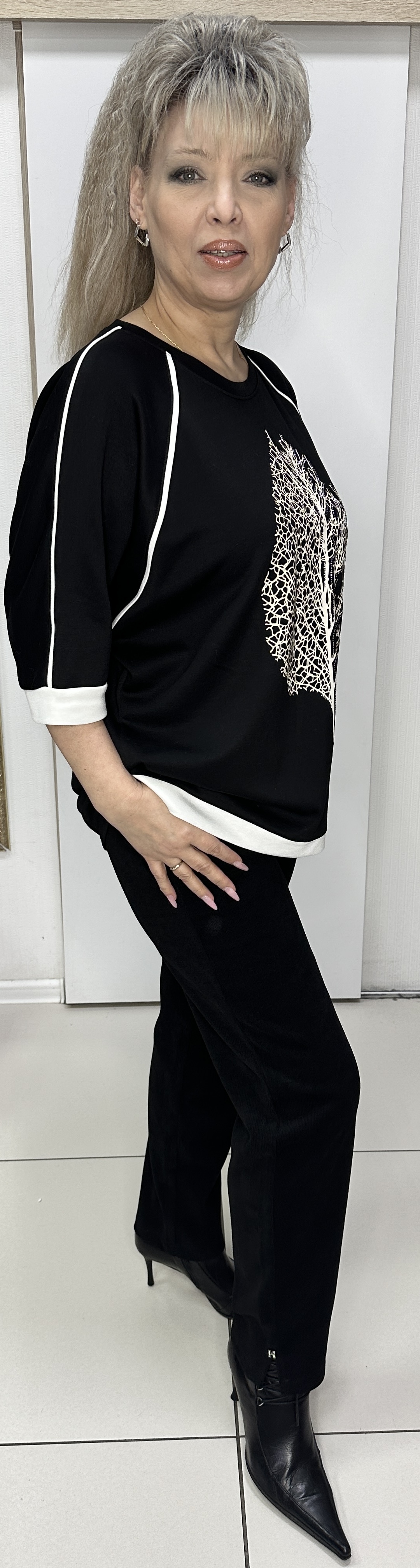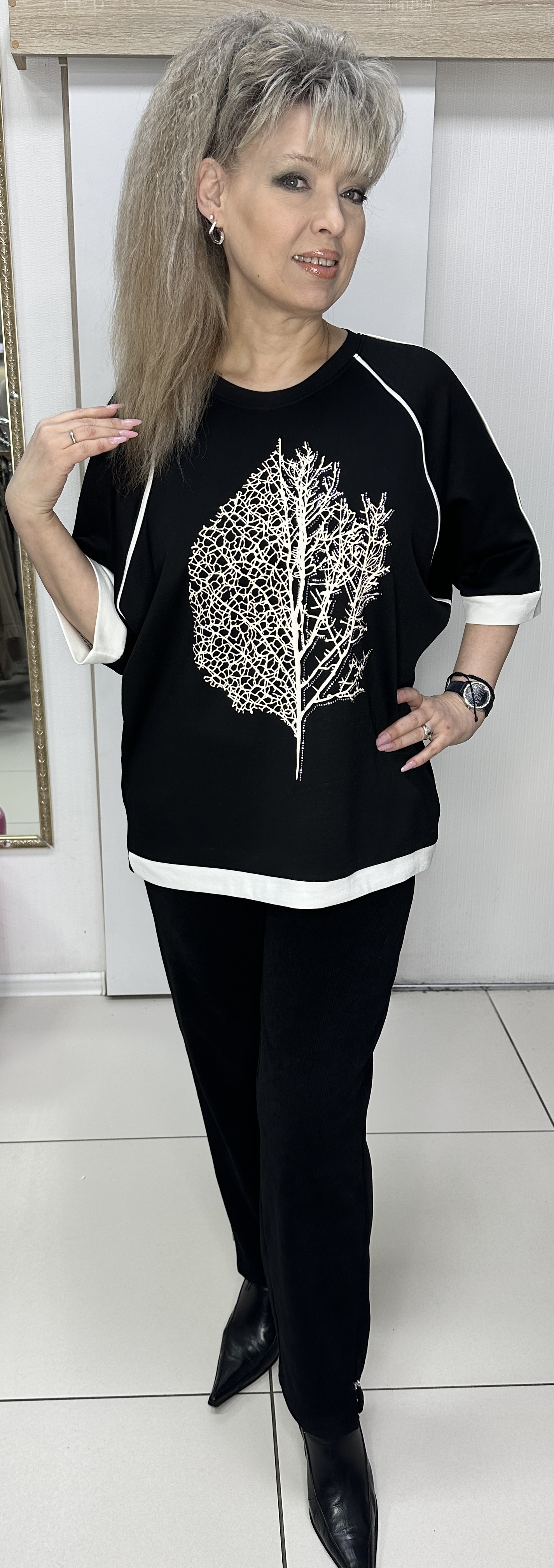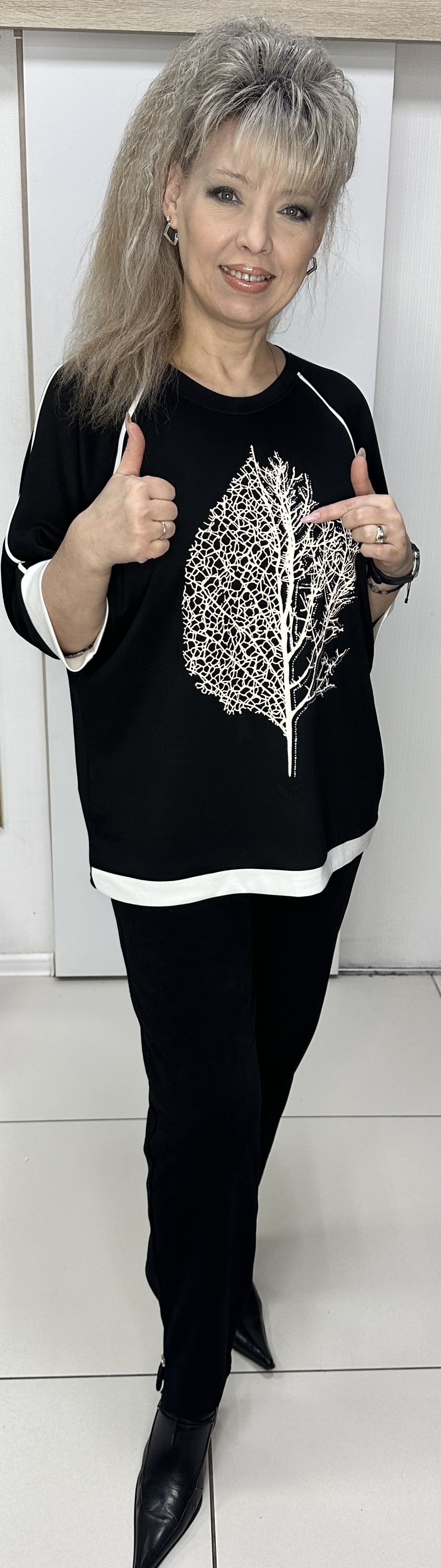 И внешне очень красивый блузон и тактильно тоже. Черный лонг слив с бело-бежевым стразовым принтом в виде листа, модель 3228 на каждый день. Очень стильный и приятный на ощупь свитшот из неопрена. Лицевая сторона короче с белой окантовкой.