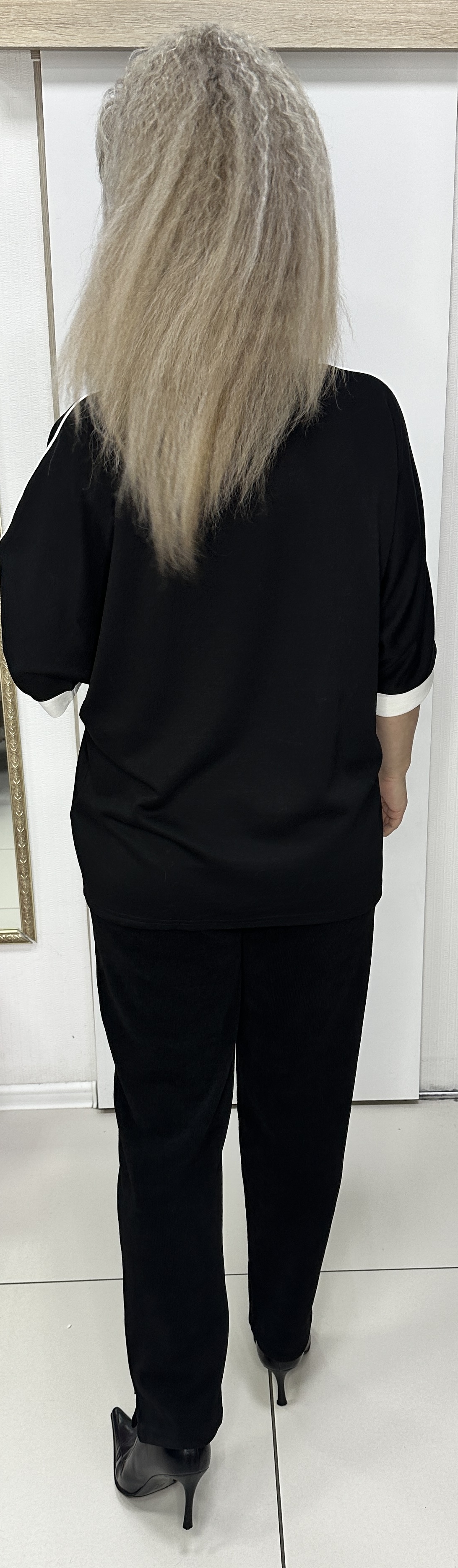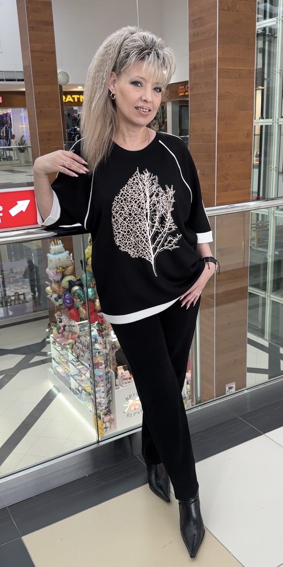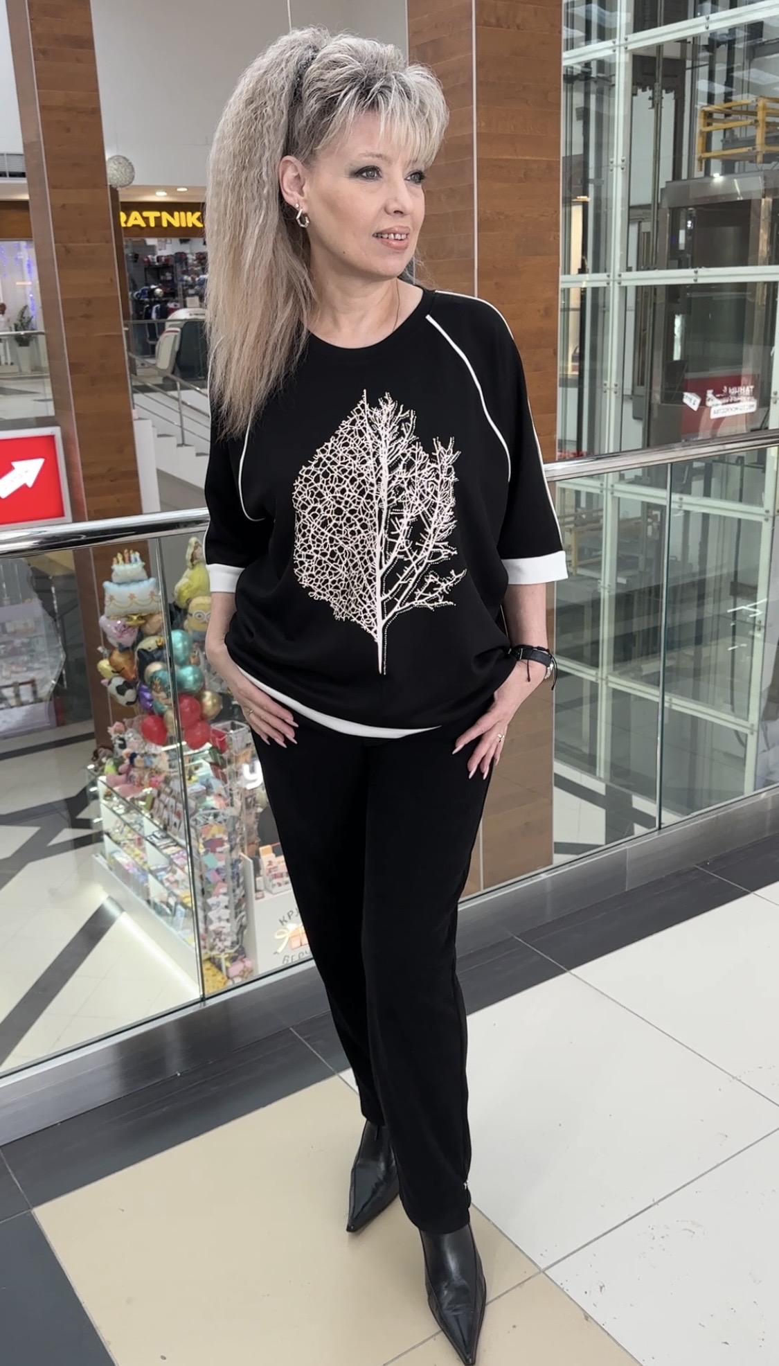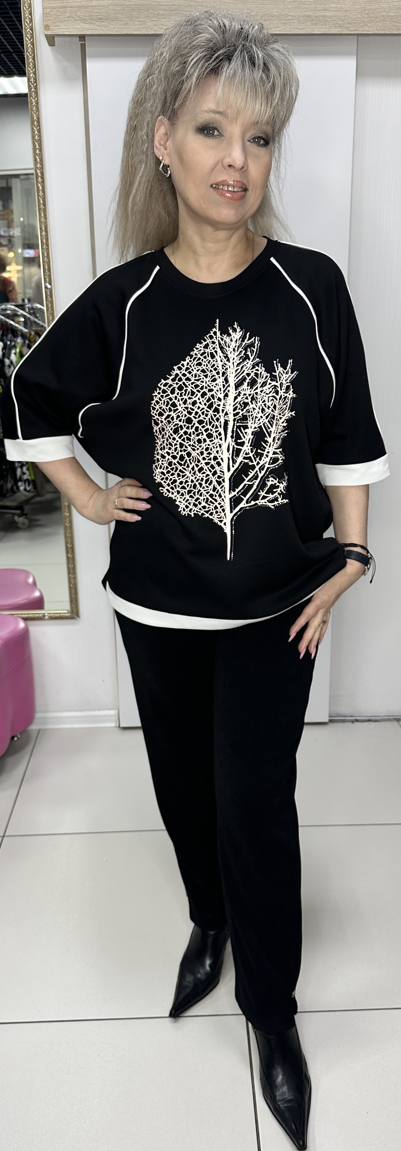 И внешне очень красивый блузон и тактильно тоже. Черный лонг слив с бело-бежевым стразовым принтом в виде листа, модель 3228 на каждый день. Очень стильный и приятный на ощупь свитшот из неопрена. Лицевая сторона короче с белой окантовкой.