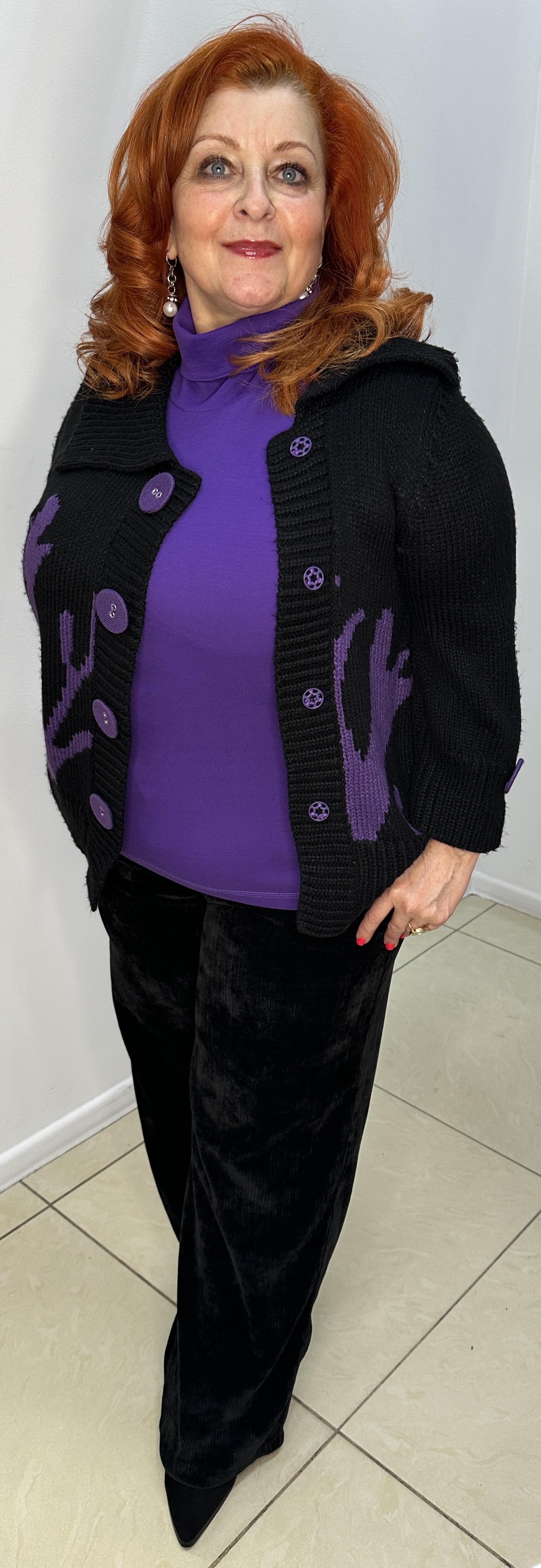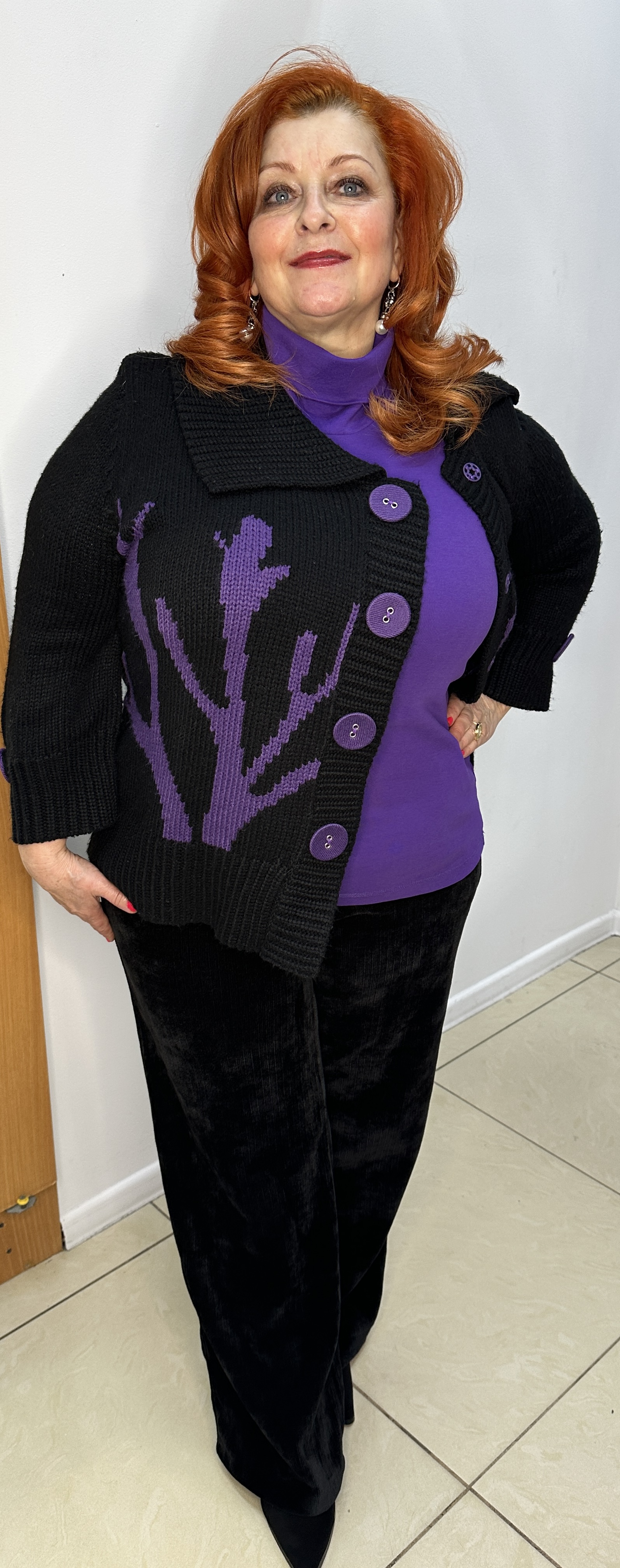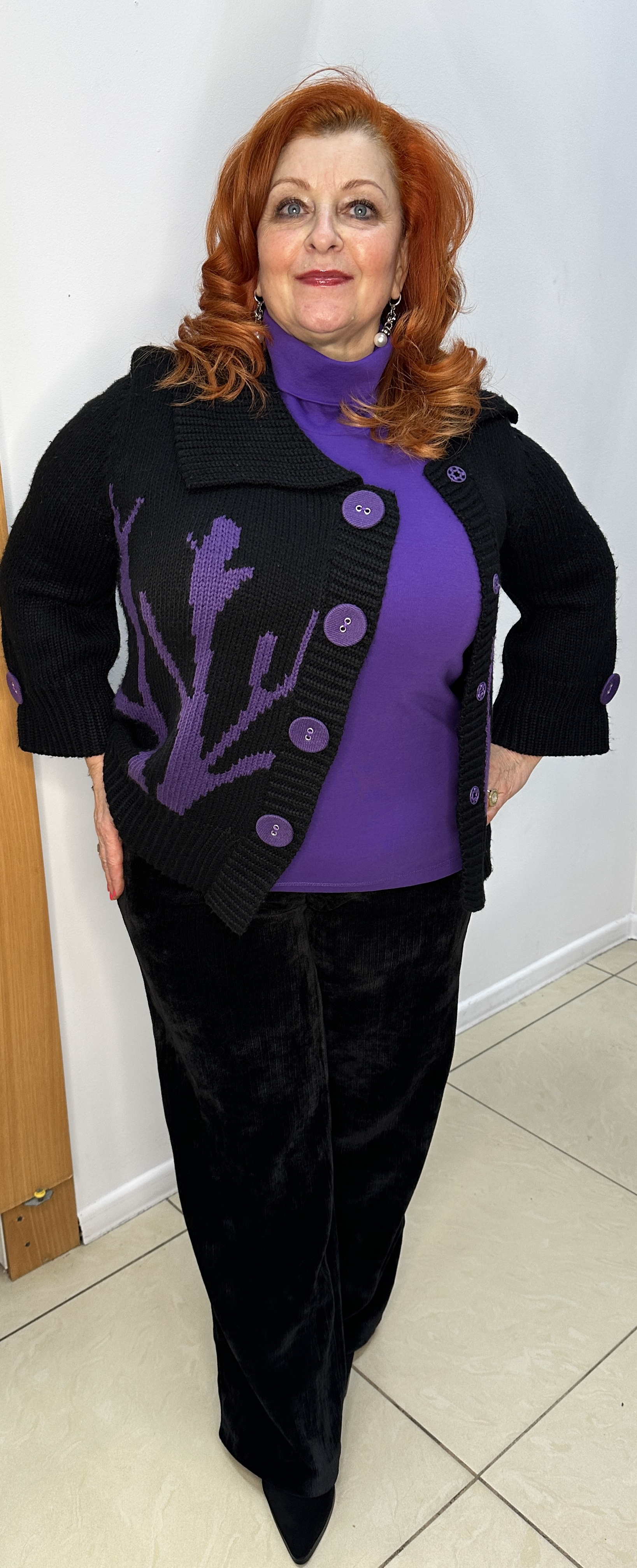 Теплый, черный жакет-кофта на ассиметричной застежке пуговицах-кнопках - модель 100666 от немецкого бренда CPM способна украсить любую женщину и любой ее образ сделать еще привлекательнее! Короткий жакет с рукавом 7/8 украшен фиолетовой пуговкой в тон фиолетового принта. Изделие сшито из эластичных нитей, что придется по вкусу ценительницам комфорта и удобства.
