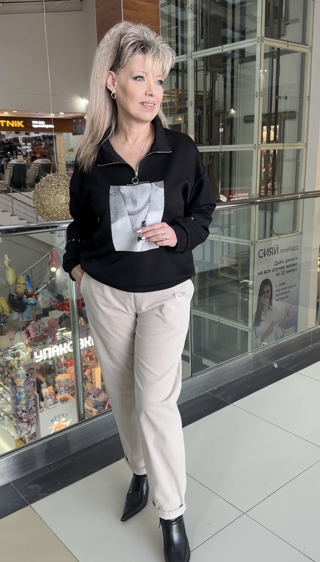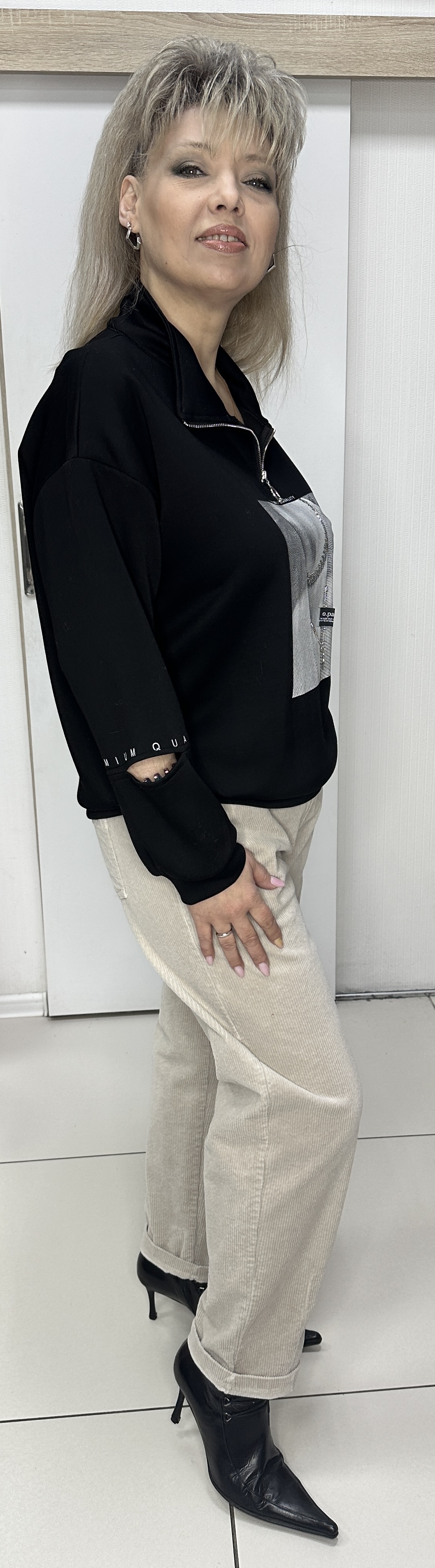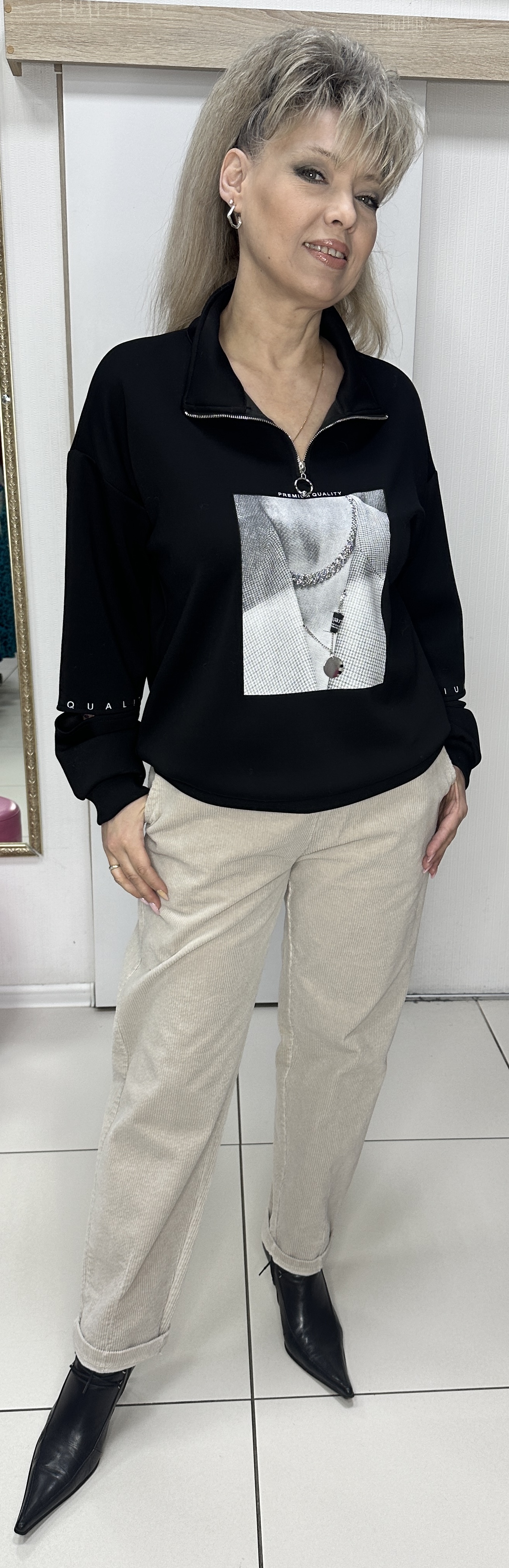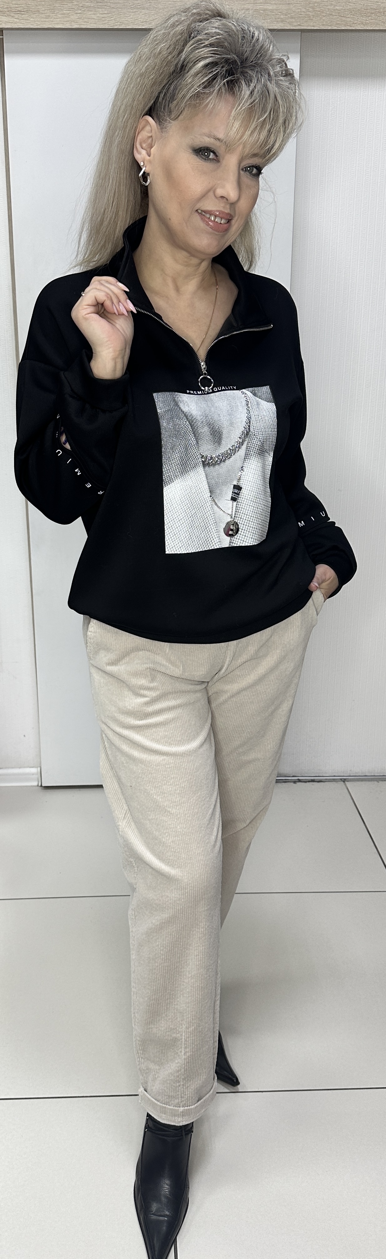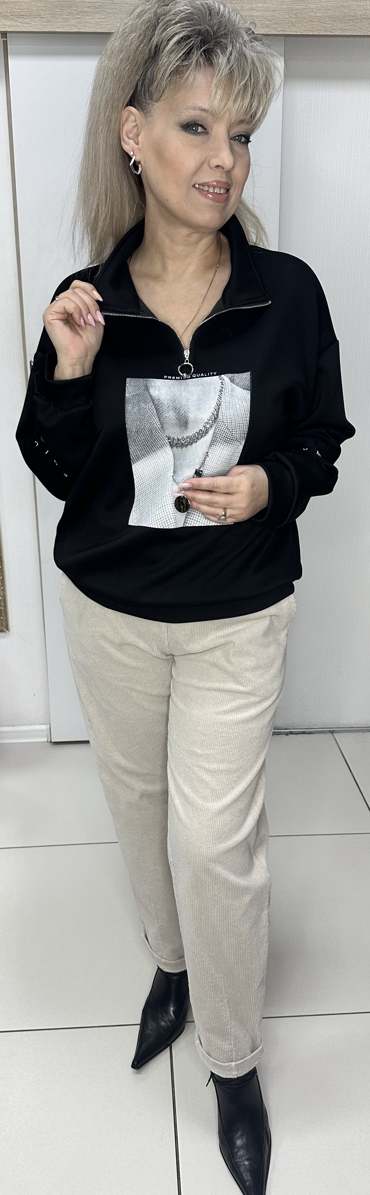 ВАУ! Шикарный и принтовый блузон-свитшот модель 6107 для встреч с друзьями или просто прогулок подойдет. Он и тактильно очень приятный. Поло застежка с воротником, спущенное плечо и по рукавам есть прорези с белым латинским принтом. Изюминка: хочется выделить экран с изображением и пришитым колье и кулоном, что добавляет шик изделию. Очень стильный и приятный на ощупь блузон из неопрена.