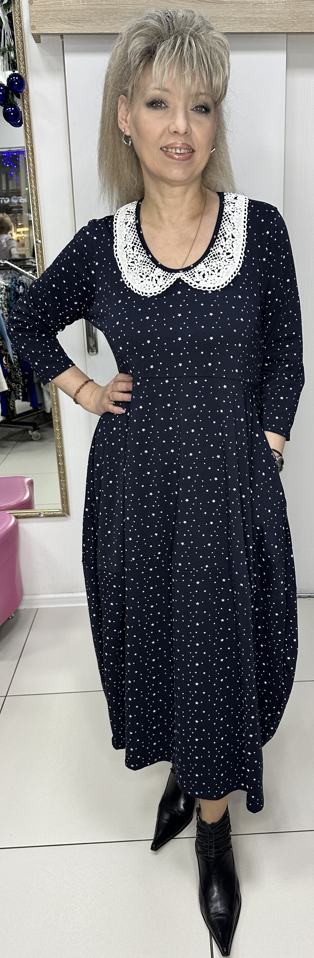 Стильное итальянское платье, оригинального дизайна с белым кружевным воротничком, модель 86051 на каждый день и для торжественных случаев. Это креативное платье с кармашками оригинального покроя в стиле Бохо, отличный вариант для женщин предпочитающих достойное качества и доступную цену. Белый ажурный воротничок придает платью особый шарм. Рукав 7/8. В наличии изделия больших размеров. Длина изделия по спине 130 см.