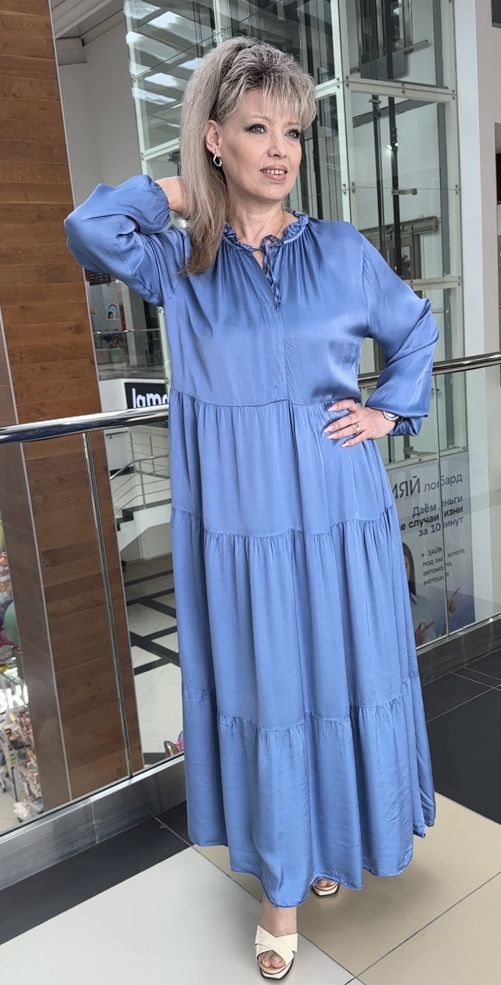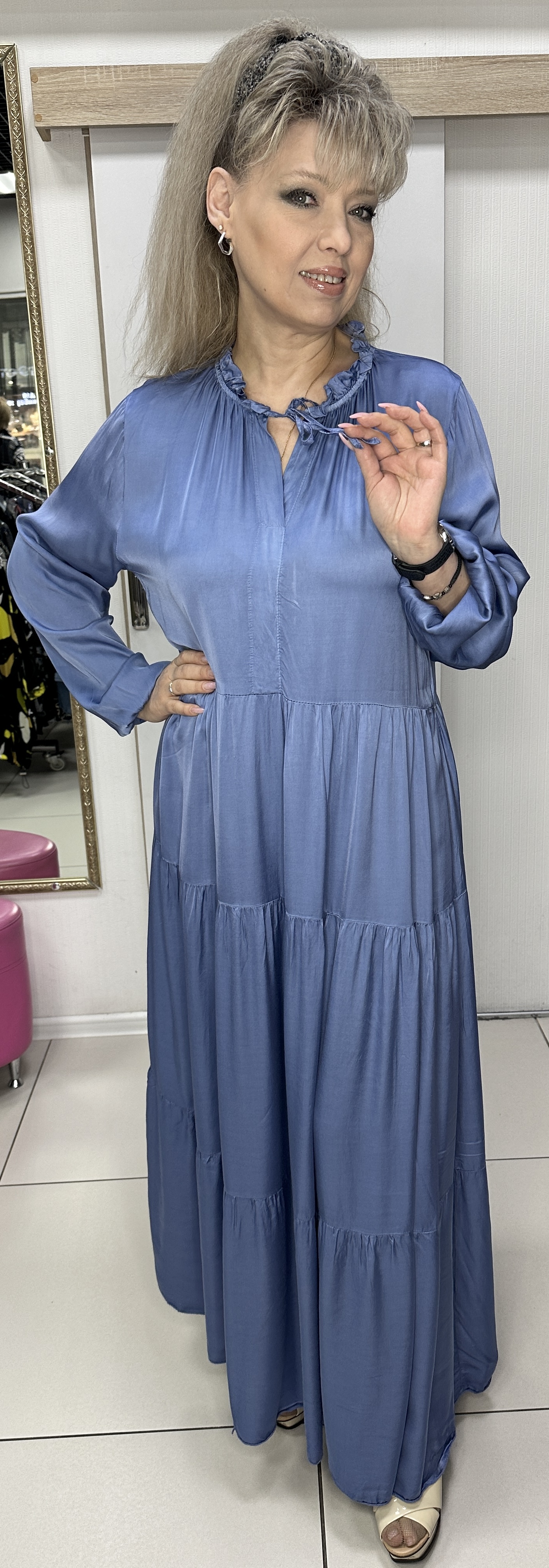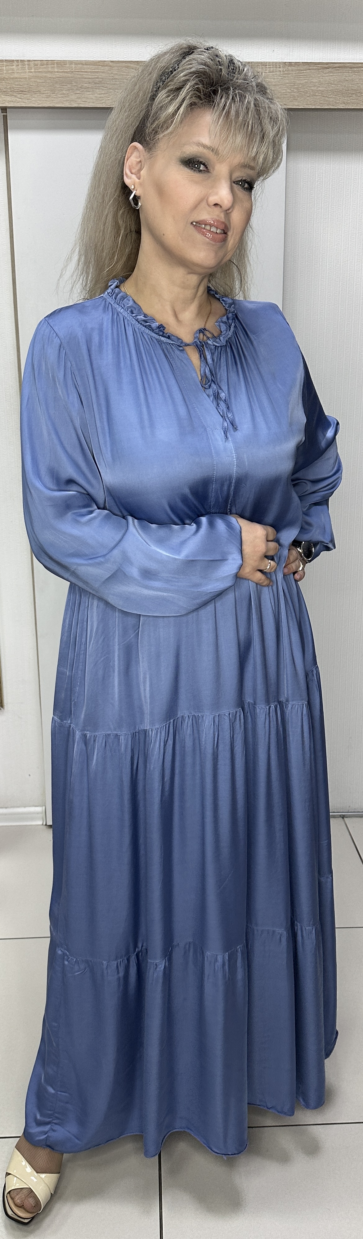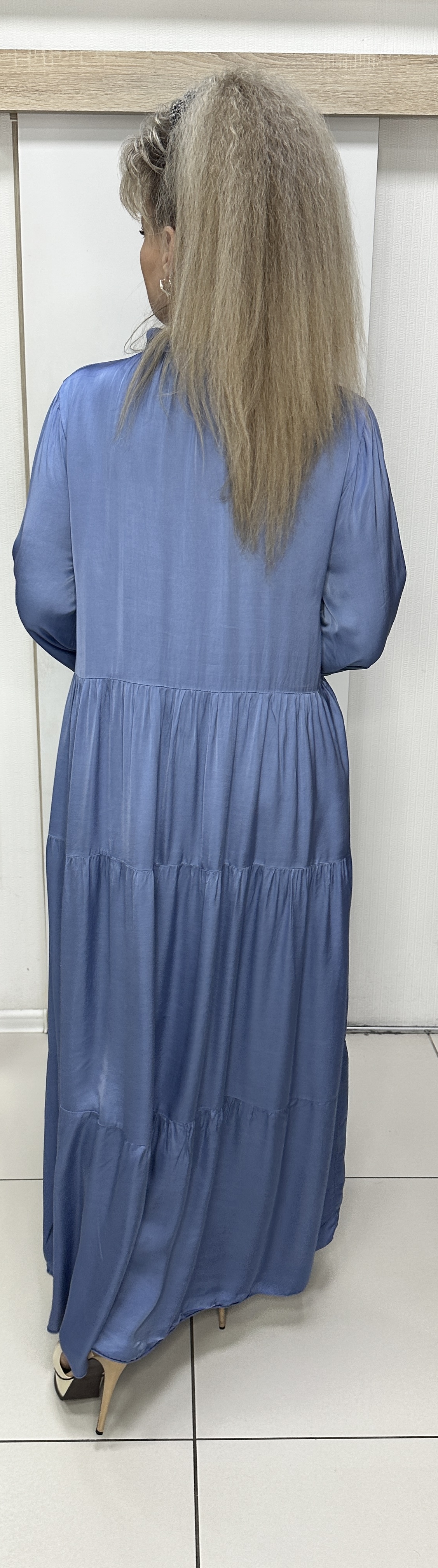 Нарядное, праздничное, атласное платье в джинсовом цвете. Предлагаем остановить свой выбор на этой модели. Длинное, красивое, ярусное, итальянское платье модель 5532 подойдет на любое торжественное мероприятие. Это длинное платье отличный вариант для женщин, предпочитающих достойное качество и доступную цену.