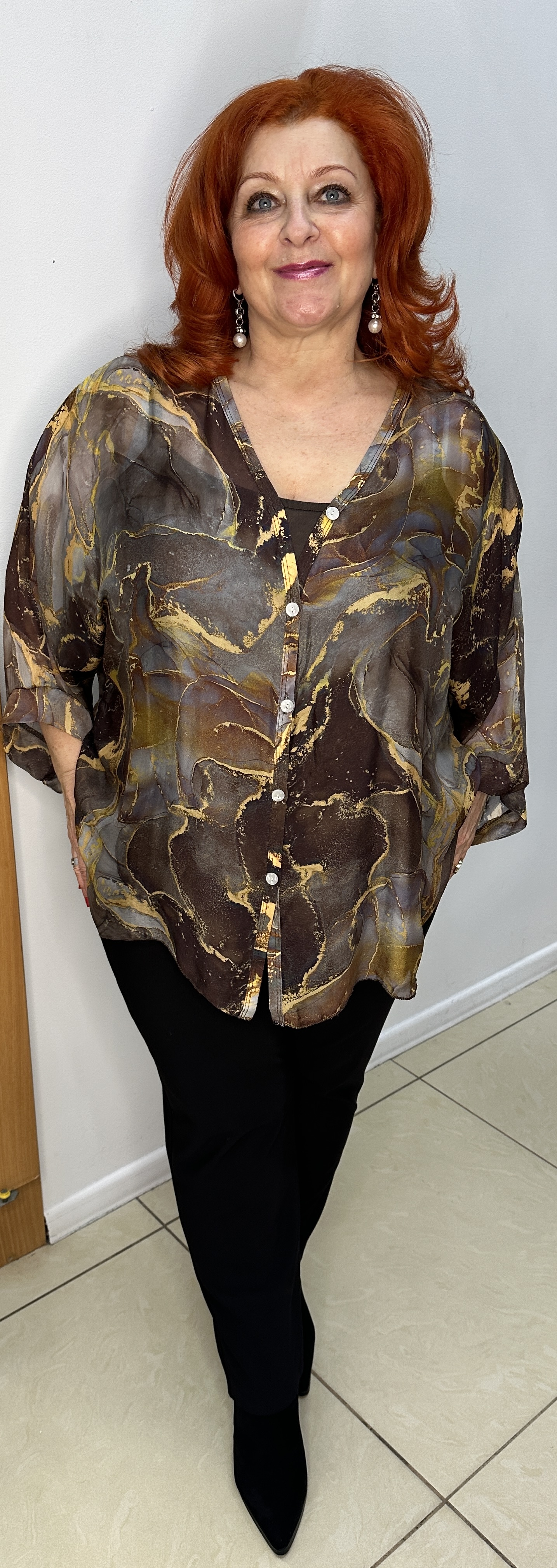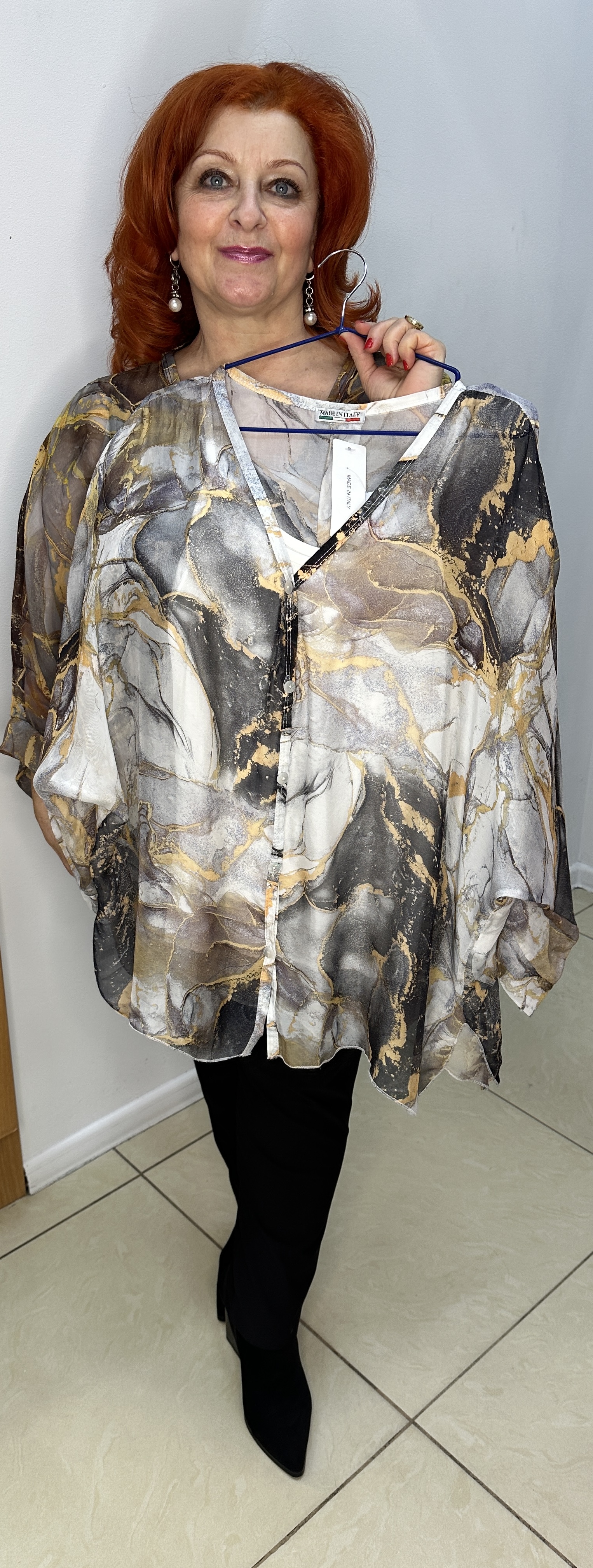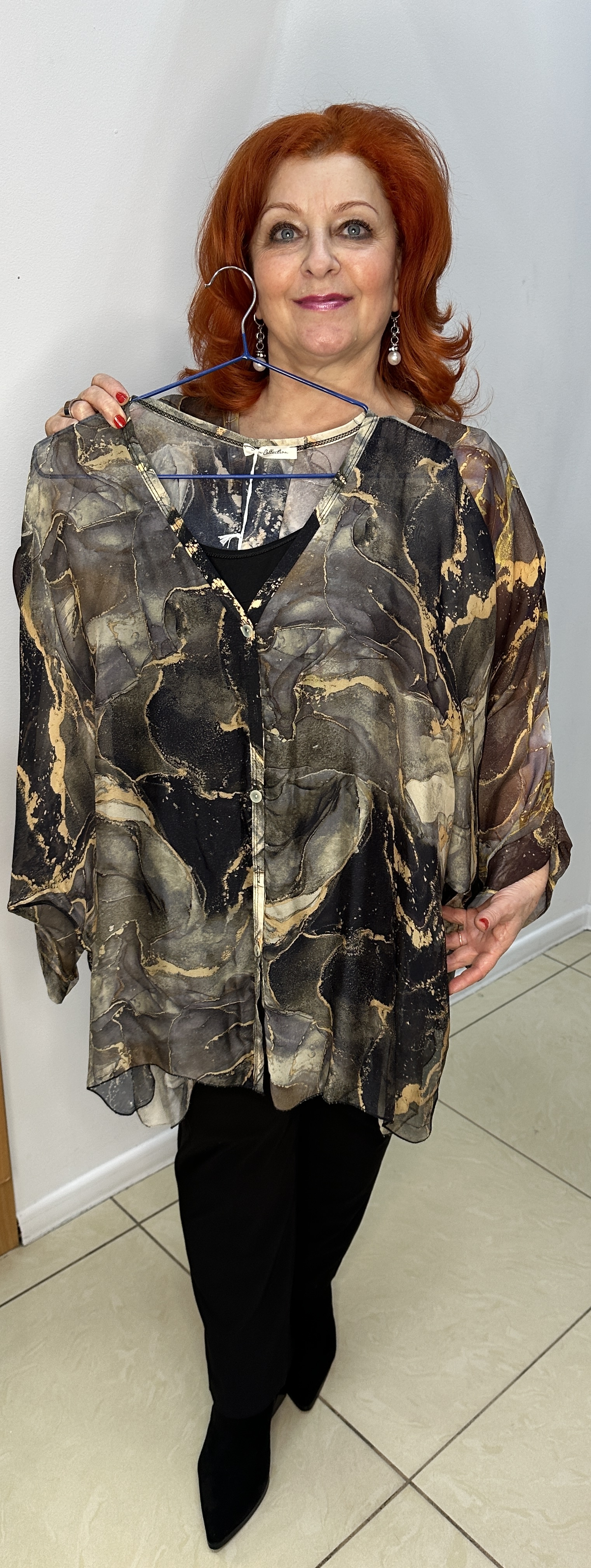 Любая женщина(девушка) будет выглядеть в этой двойке шикарно! Двойной итальянский блузон: трикотажная маечка на тонких бретельках и шифоновый цветной блузон с рукавом – праздничная модель 3959. Свободный шифоновый блузон с мраморным принтом на пуговках и в тон вискозная маечка на тонких бретельках - смотрится очень воздушно и стильно. В наличии разные расцветки на фото вы видите с белой, коричневой, черной маечкой и есть еще с оранжевой и оливковой.