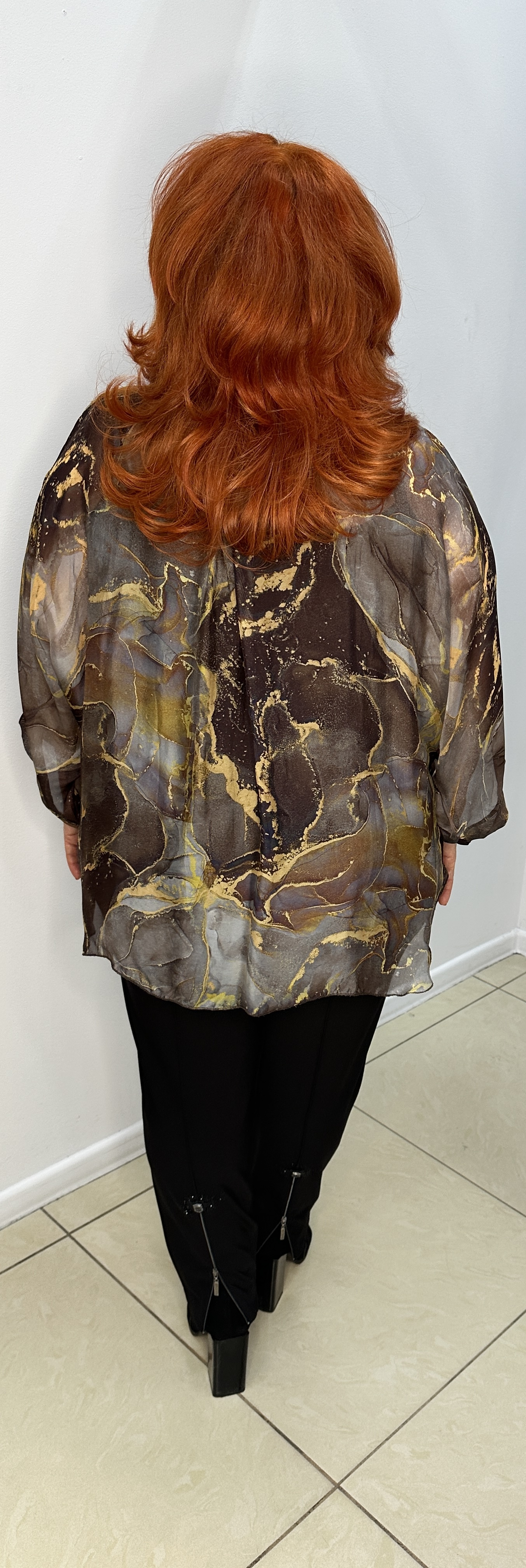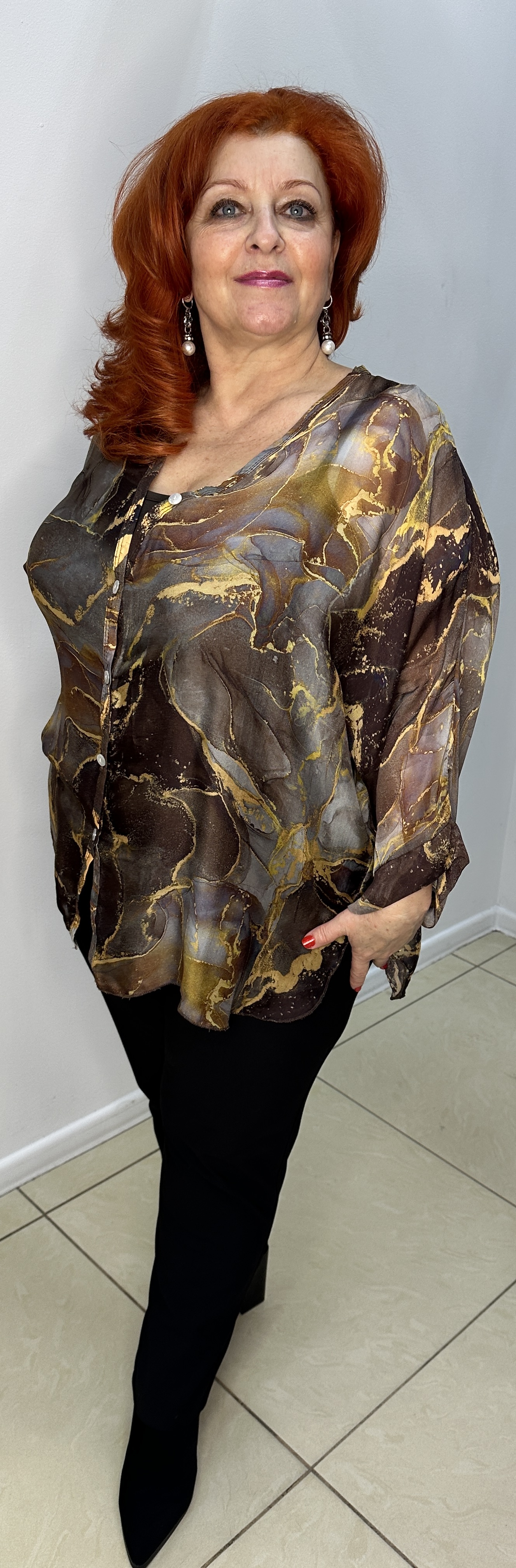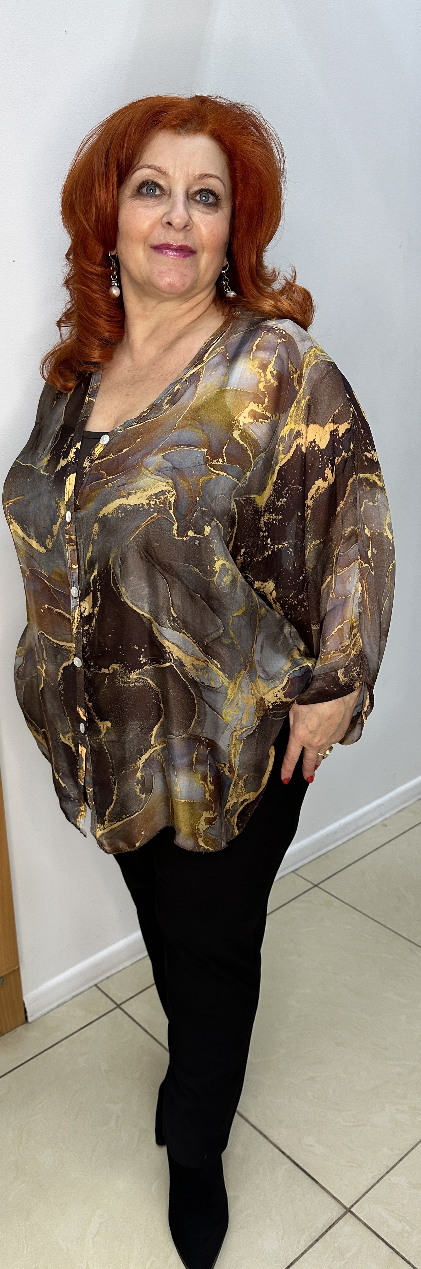 Любая женщина(девушка) будет выглядеть в этой двойке шикарно! Двойной итальянский блузон: трикотажная маечка на тонких бретельках и шифоновый цветной блузон с рукавом – праздничная модель 3959. Свободный шифоновый блузон с мраморным принтом на пуговках и в тон вискозная маечка на тонких бретельках - смотрится очень воздушно и стильно. В наличии разные расцветки на фото вы видите с белой, коричневой, черной маечкой и есть еще с оранжевой и оливковой.