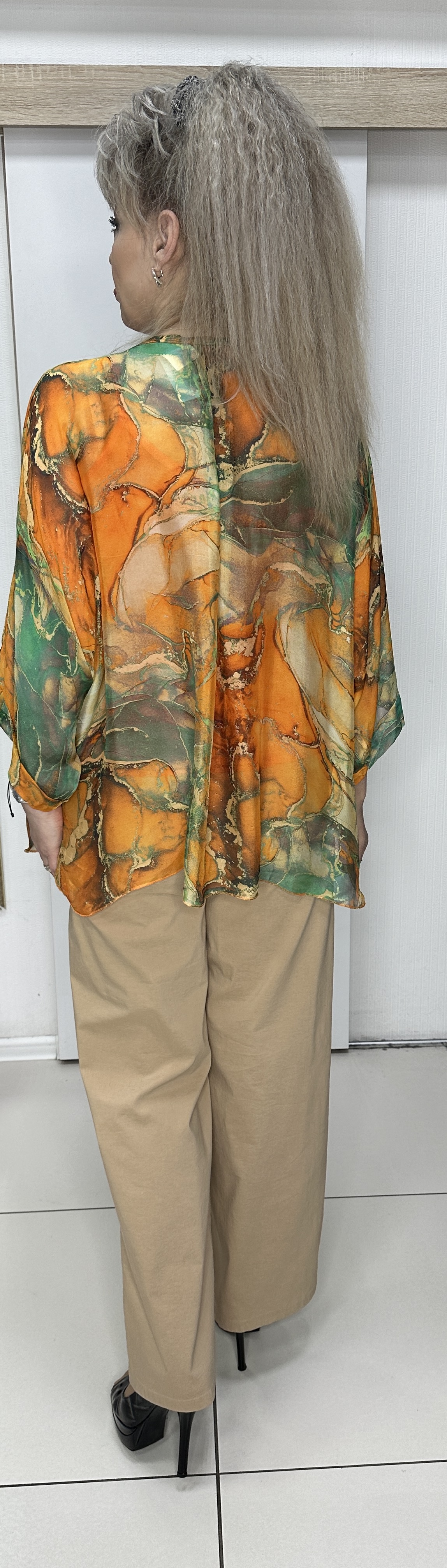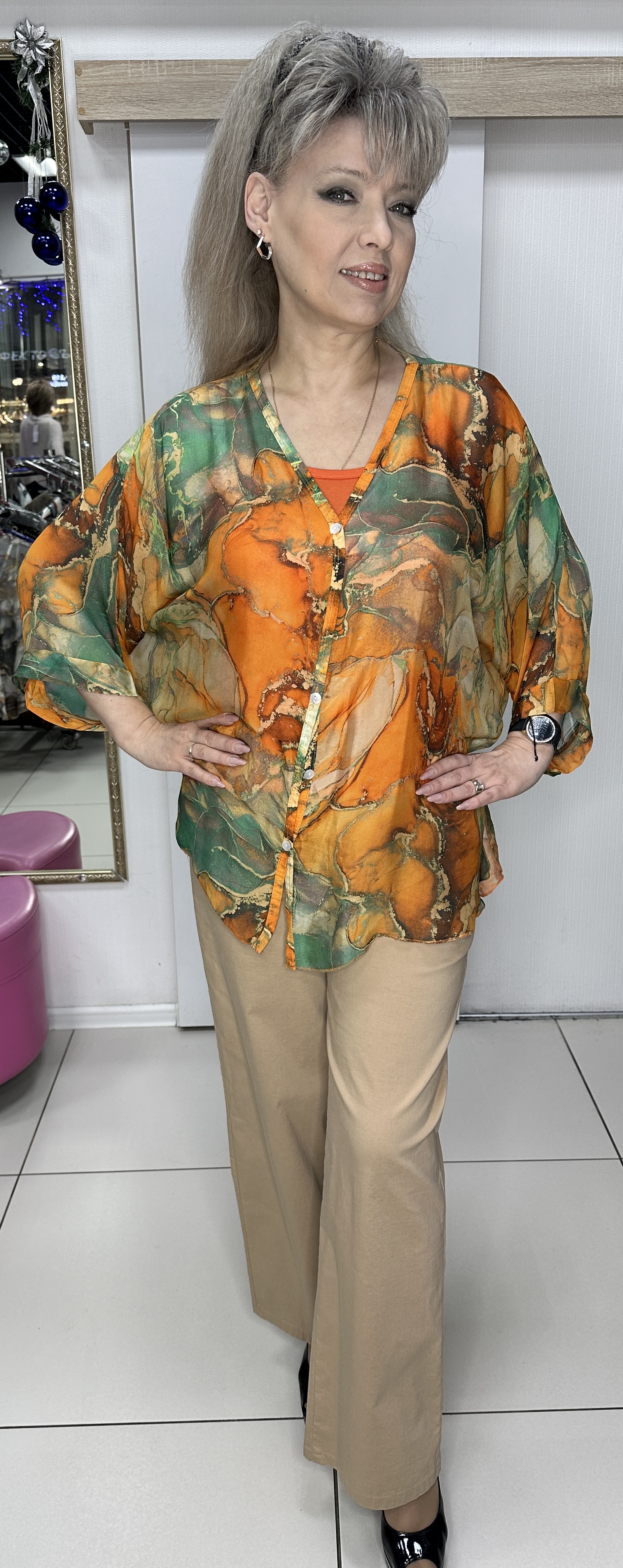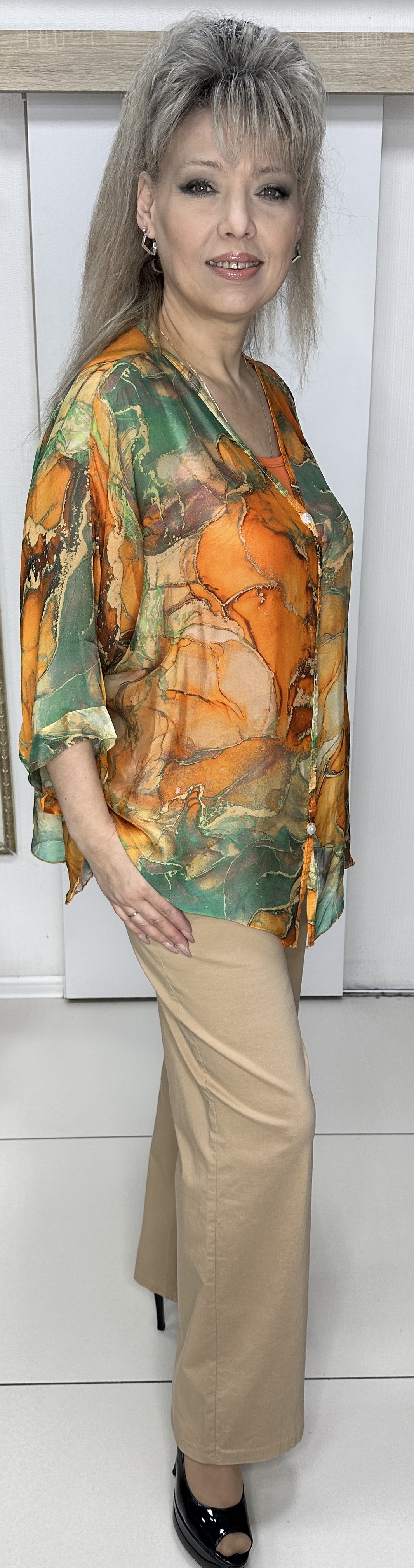 Любая женщина будет выглядеть в этой двойке шикарно! Двойной итальянский блузон: трикотажная маечка на тонких бретельках и шифоновый цветной блузон с рукавом – праздничная модель 3959. Свободный шифоновый блузон на пуговках и в тон вискозная маечка на тонких бретельках - смотрится очень воздушно и стильно. В наличии разные расцветки на фото вы видите с белой маечкой и с оранжевой.