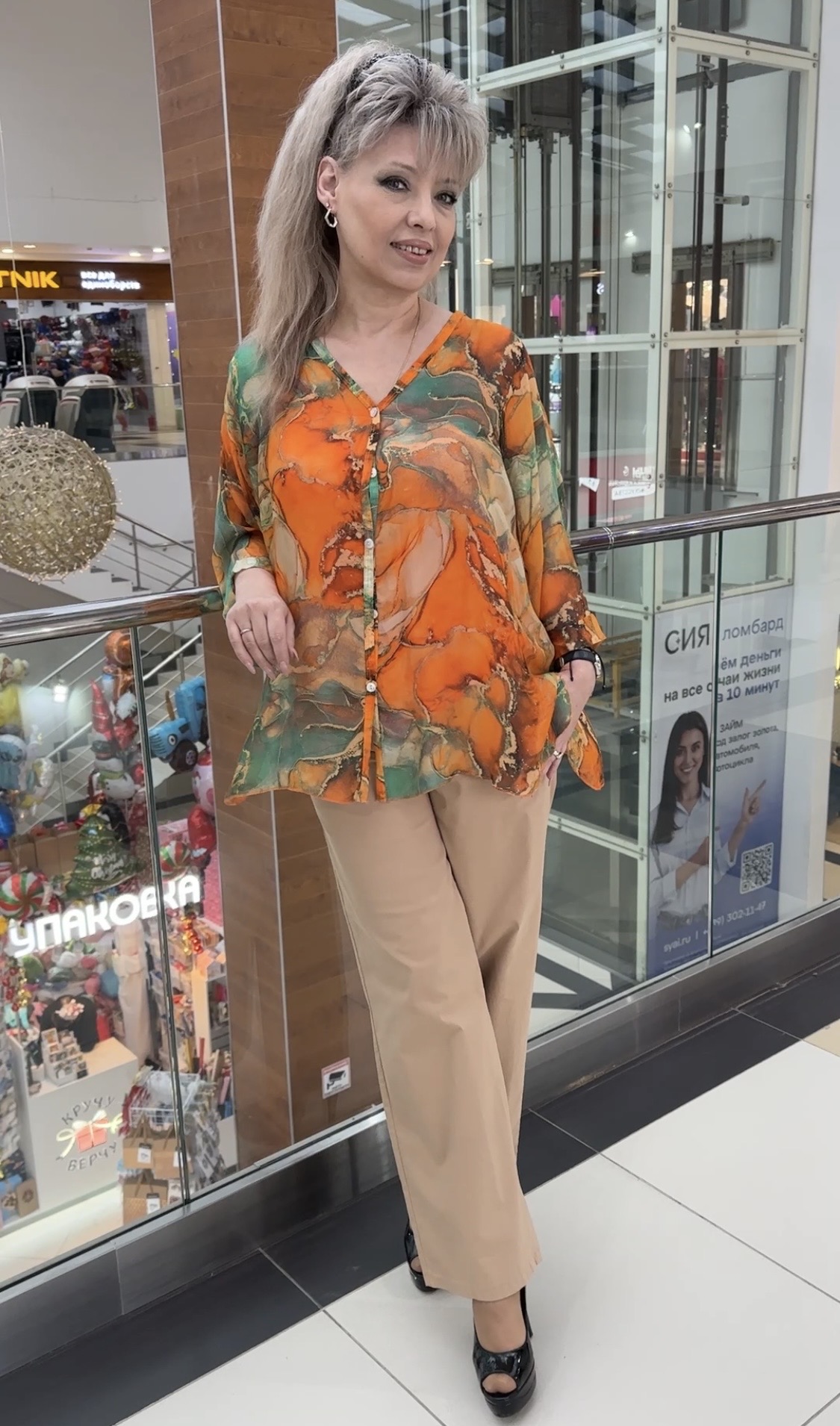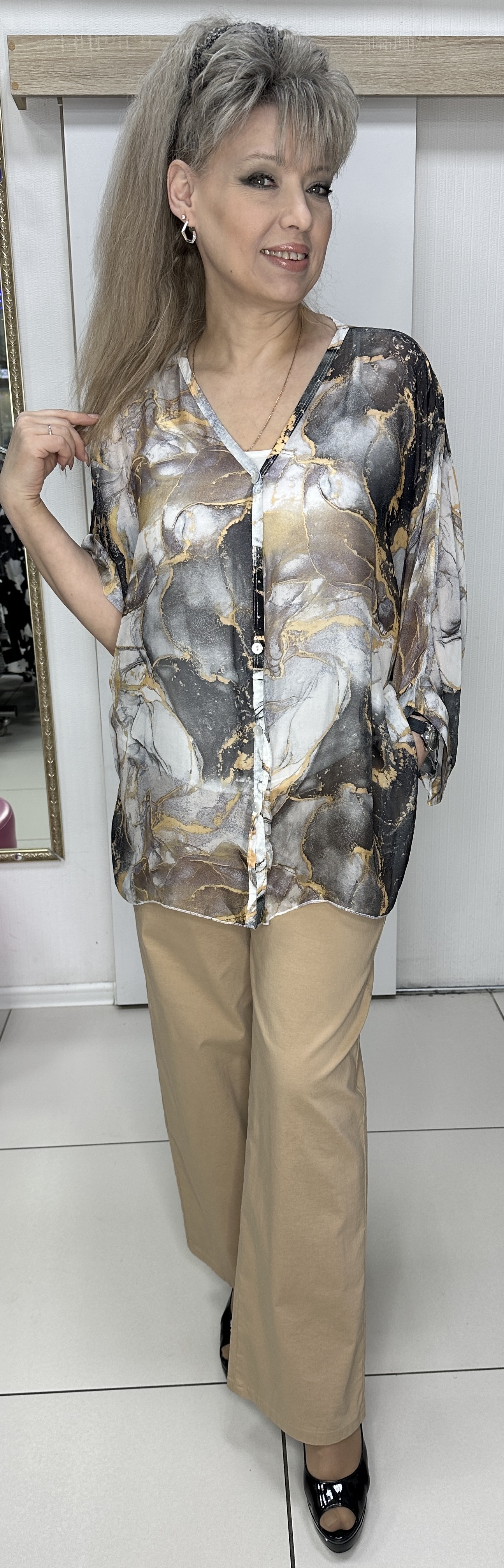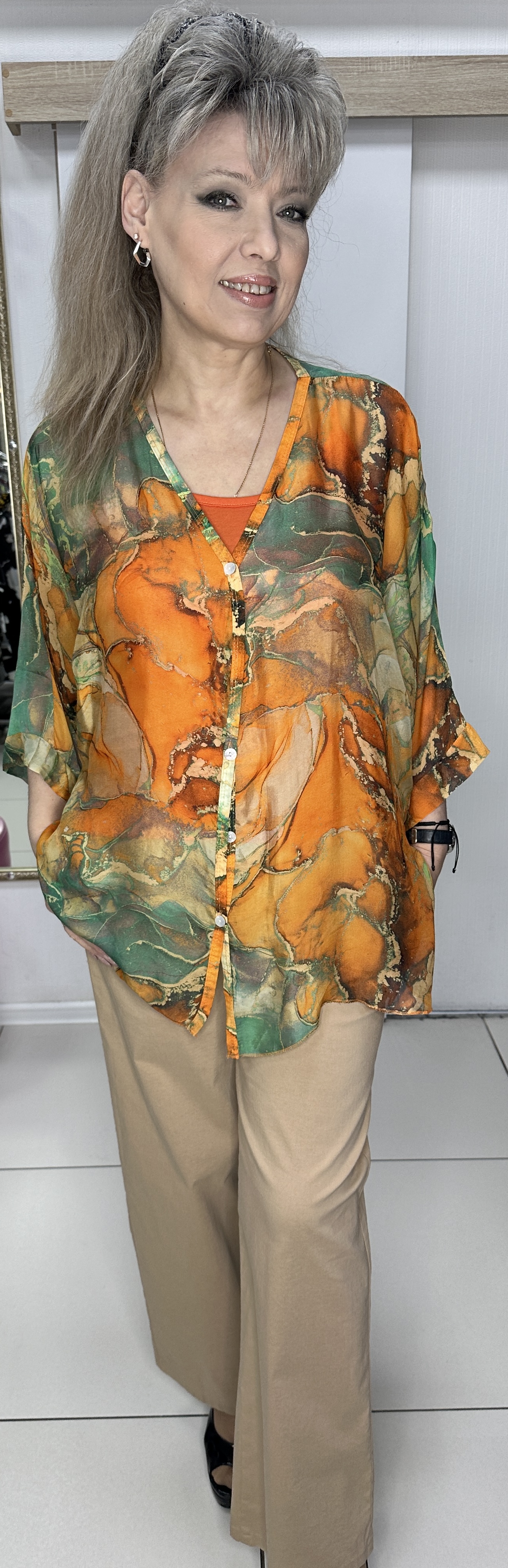 Любая женщина будет выглядеть в этой двойке шикарно! Двойной итальянский блузон: трикотажная маечка на тонких бретельках и шифоновый цветной блузон с рукавом – праздничная модель 3959. Свободный шифоновый блузон на пуговках и в тон вискозная маечка на тонких бретельках - смотрится очень воздушно и стильно. В наличии разные расцветки на фото вы видите с белой маечкой и с оранжевой.