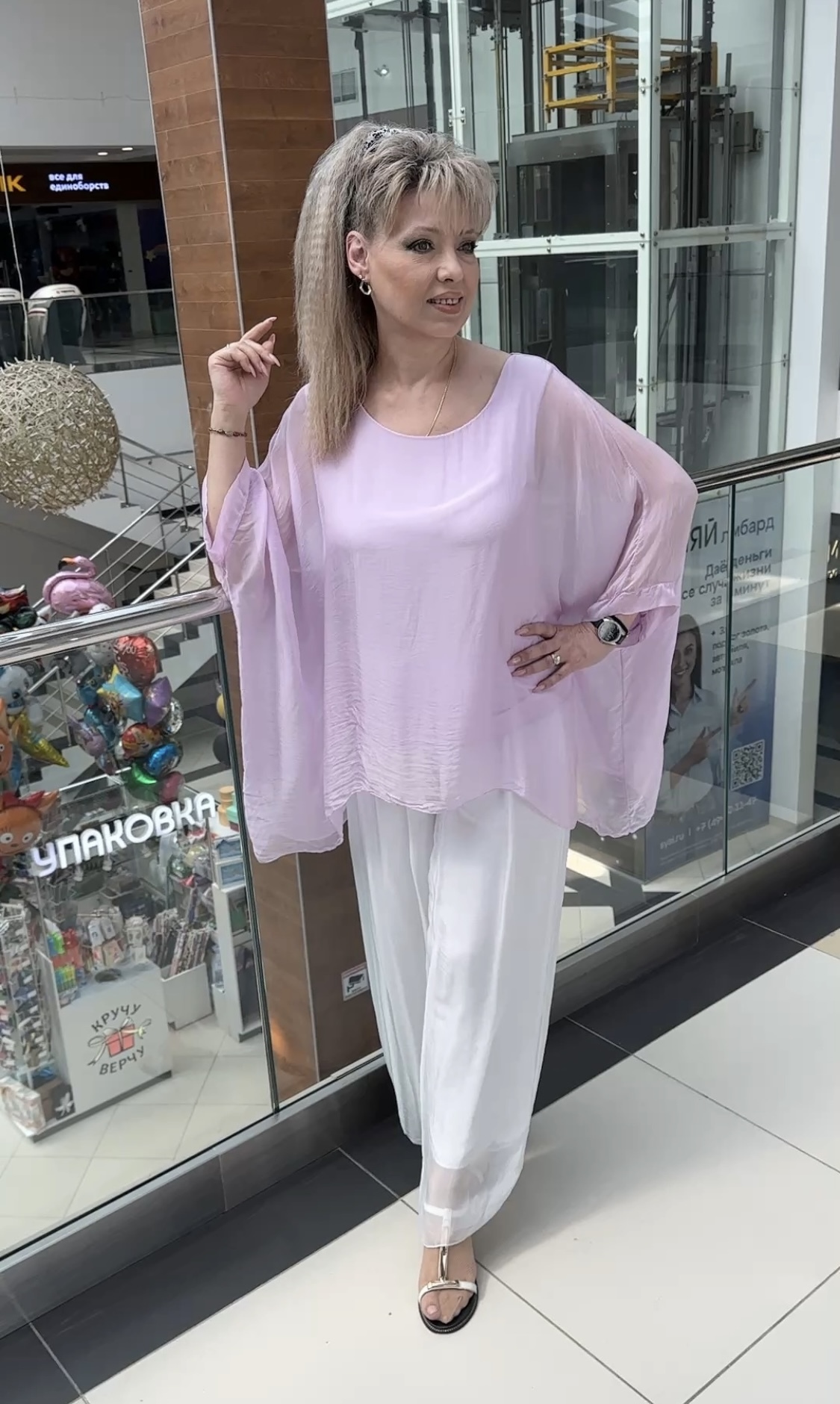 Красотища какая! Само очарование эта модель! На любые праздничные мероприятия - эта двойка-туника ваша палочка-выручалочка. Она шикарная и тактильно очень приятная - современная туника! В чем особенность туники – в способности скрыть полноту фигуры. Нижняя маечка по фигуре, а верхняя свободный фасон-пончо с удлинением по бокам. Рекомендуем эту «воздушную» вещь полным женщинам. В наличии: белый, сиреневый и джинсовый цвета.