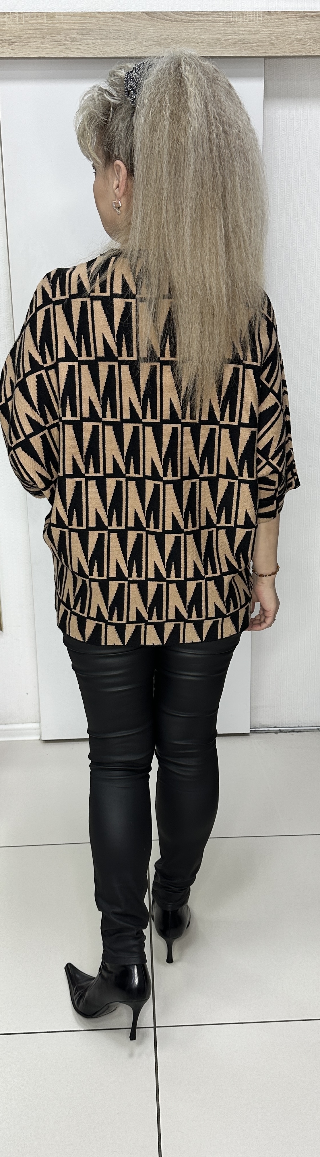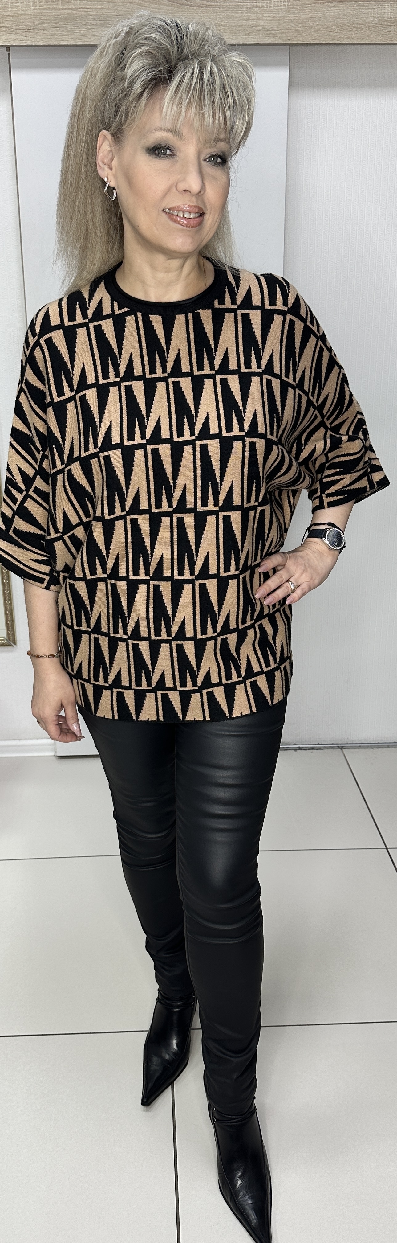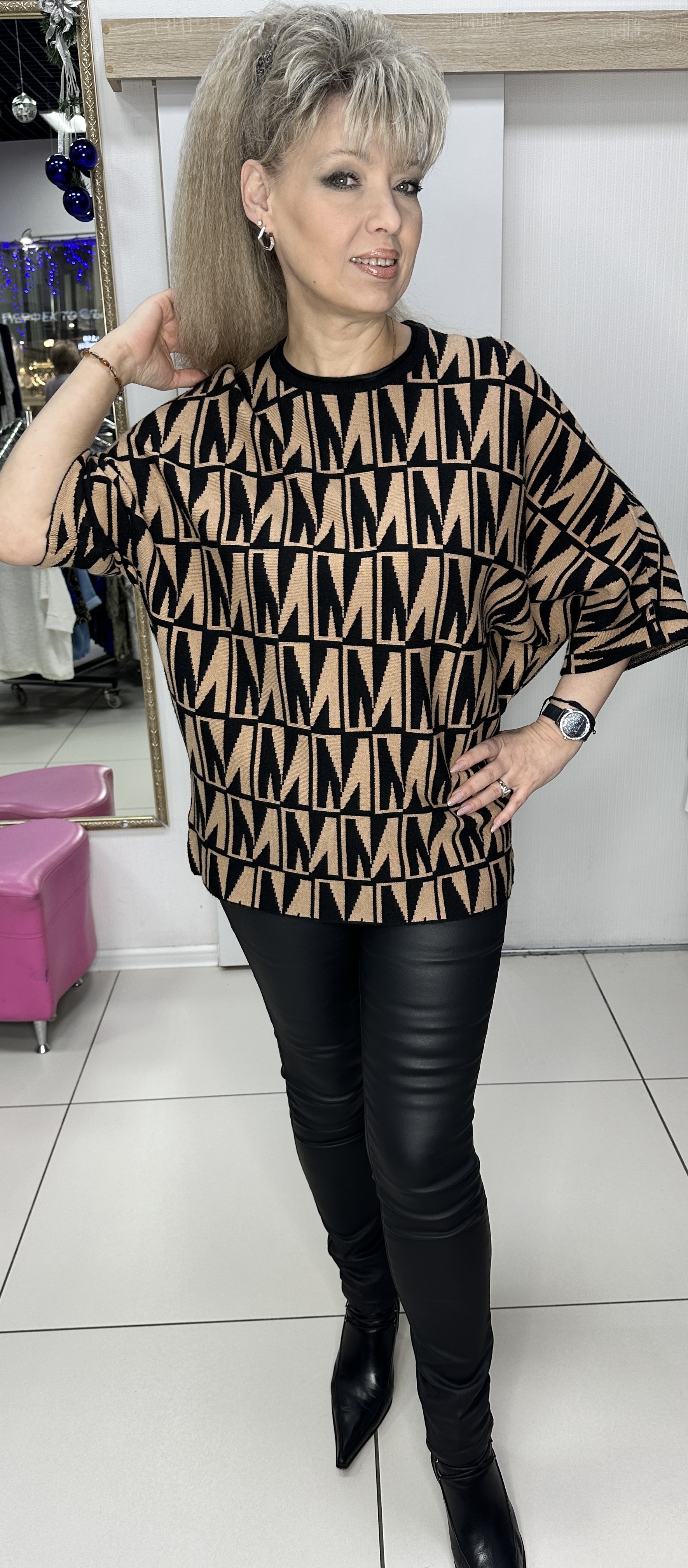 Посмотрите какой красивый джемпер. Трикотажный в капучино-черных тонах блузон-джемпер с фасоном "летучая мышь", модель 117 на каждый день. Модель смотрится очень стильно и тактильно она приятная. Рукава широкие и укороченные, а сам джемпер удлиненный.