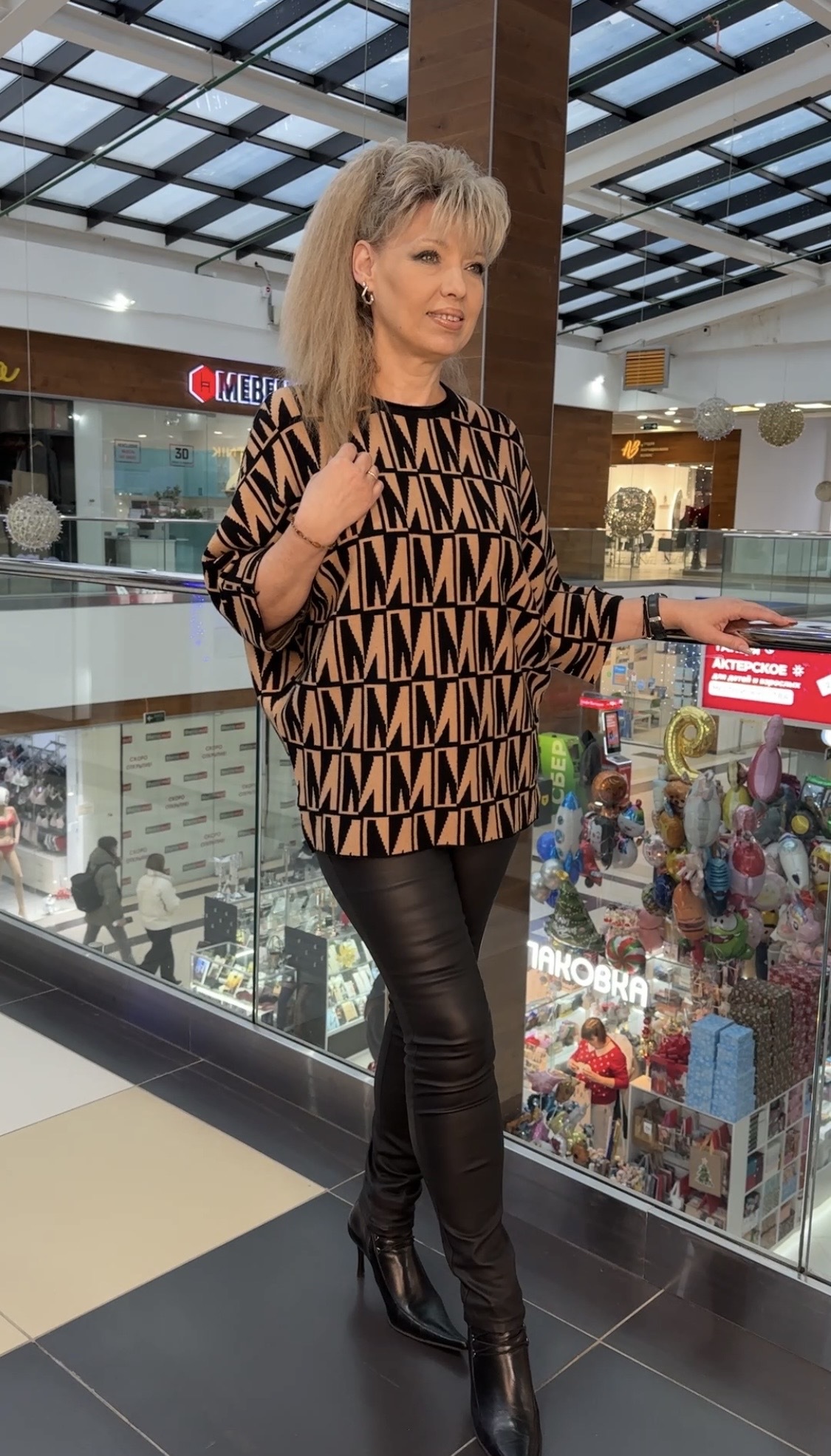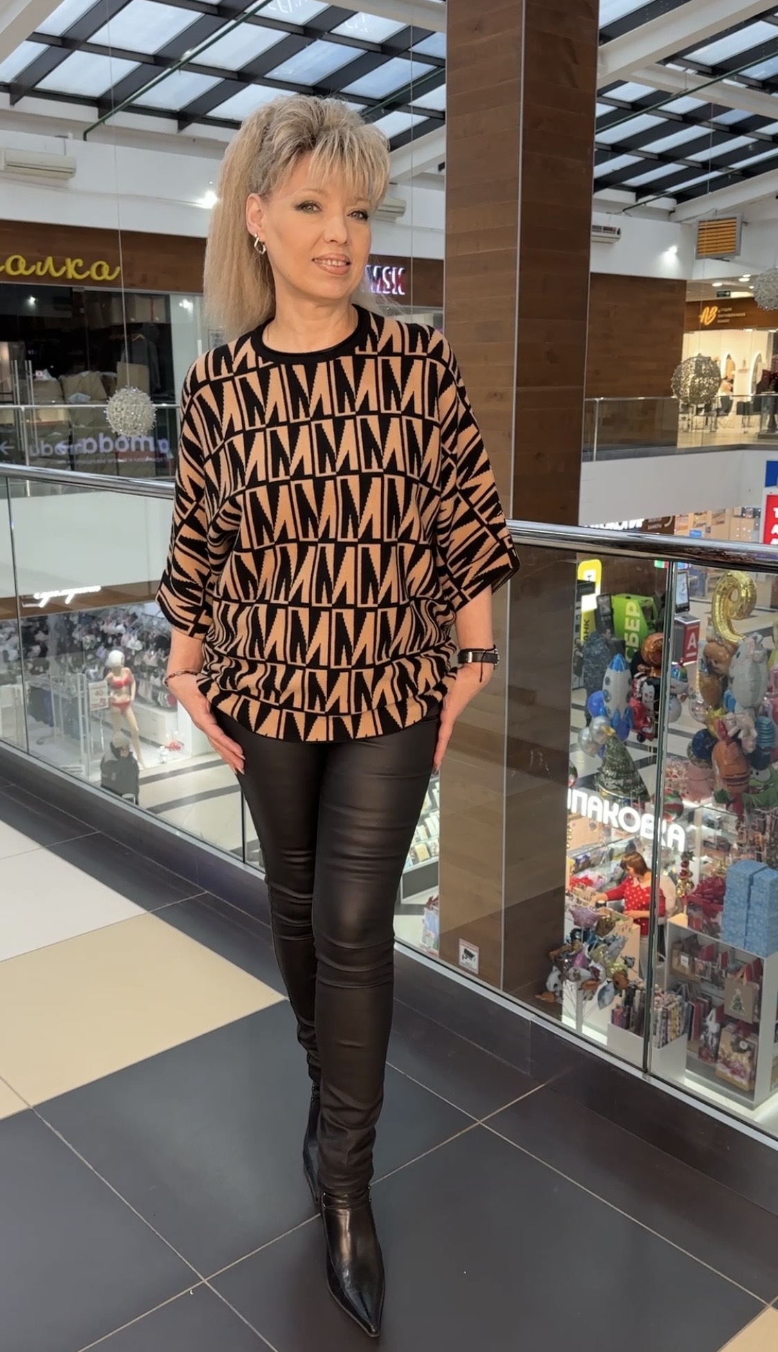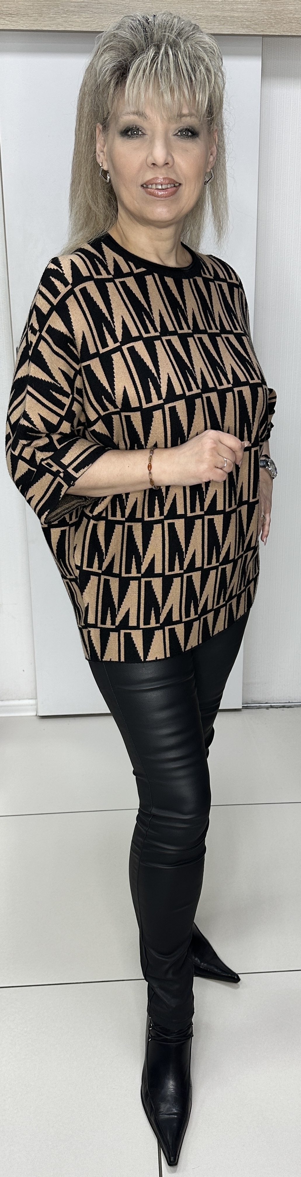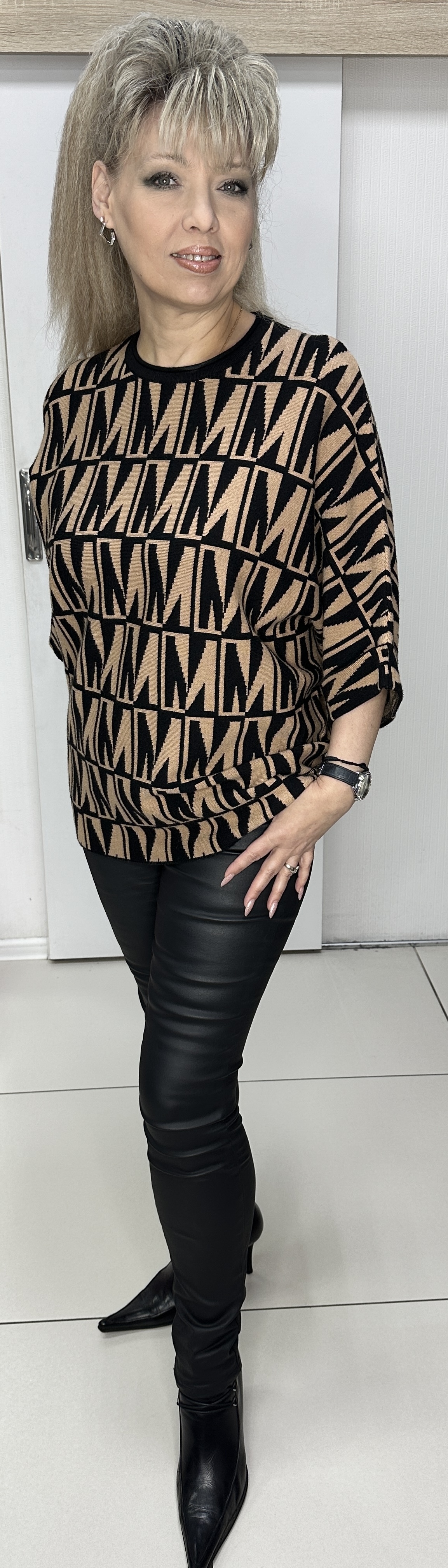 Посмотрите какой красивый джемпер. Трикотажный в капучино-черных тонах блузон-джемпер с фасоном "летучая мышь", модель 117 на каждый день. Модель смотрится очень стильно и тактильно она приятная. Рукава широкие и укороченные, а сам джемпер удлиненный.
