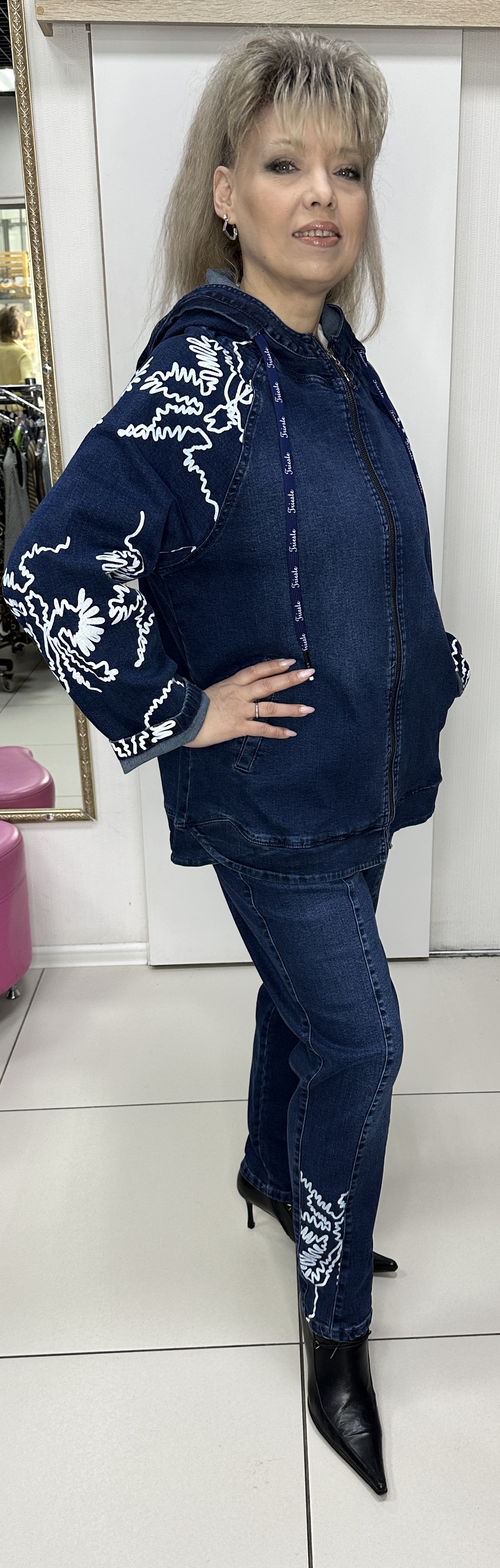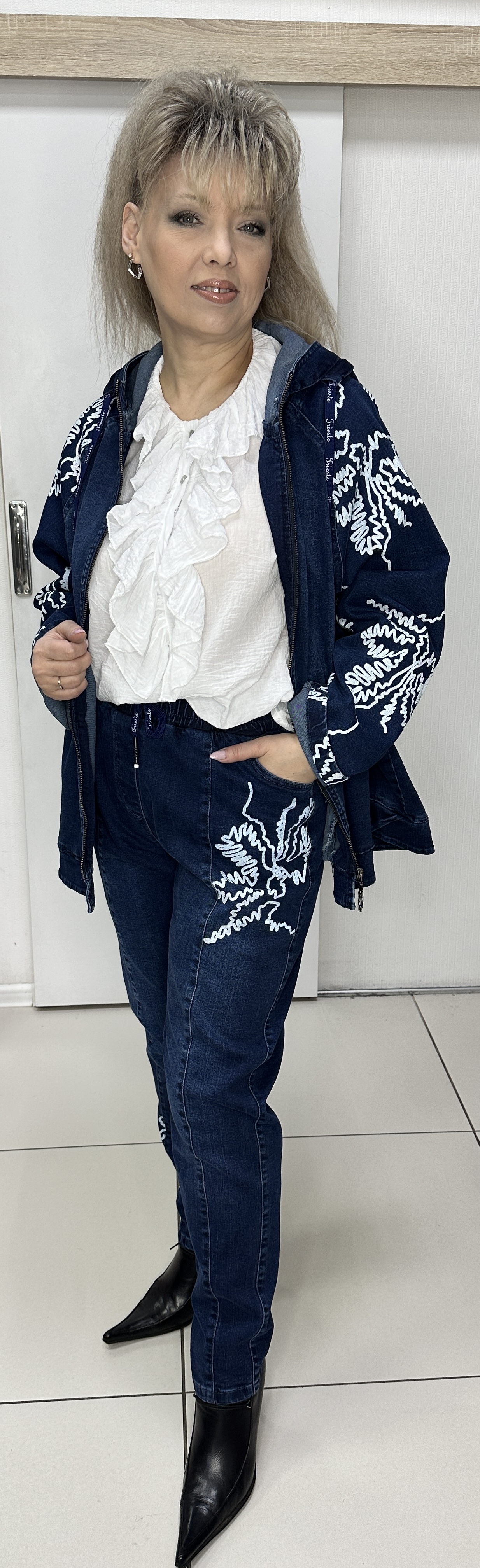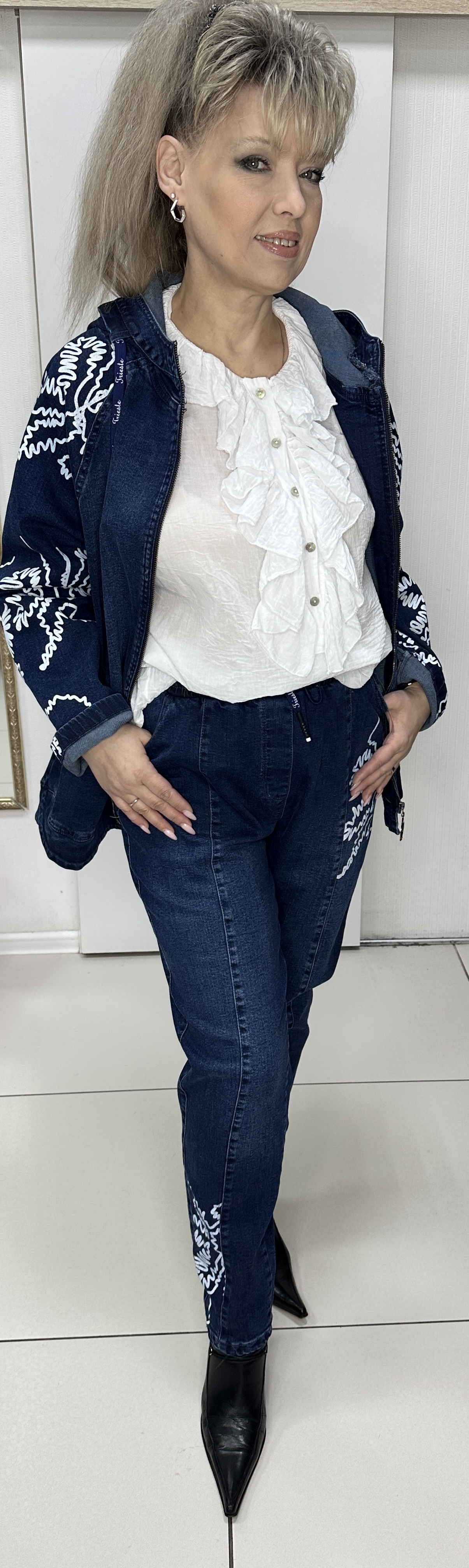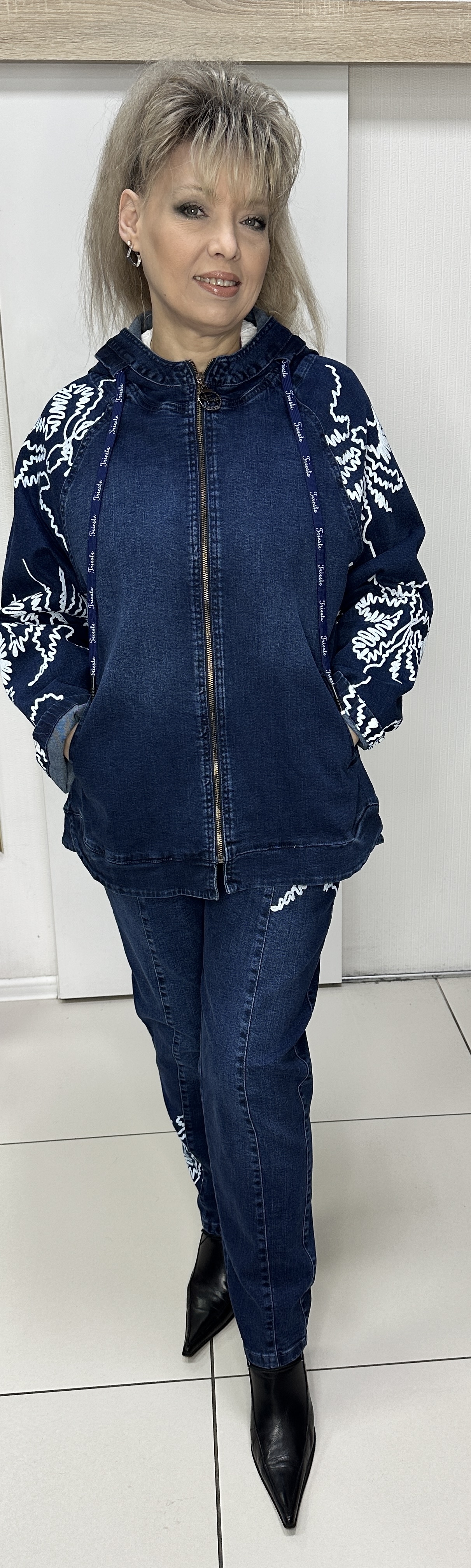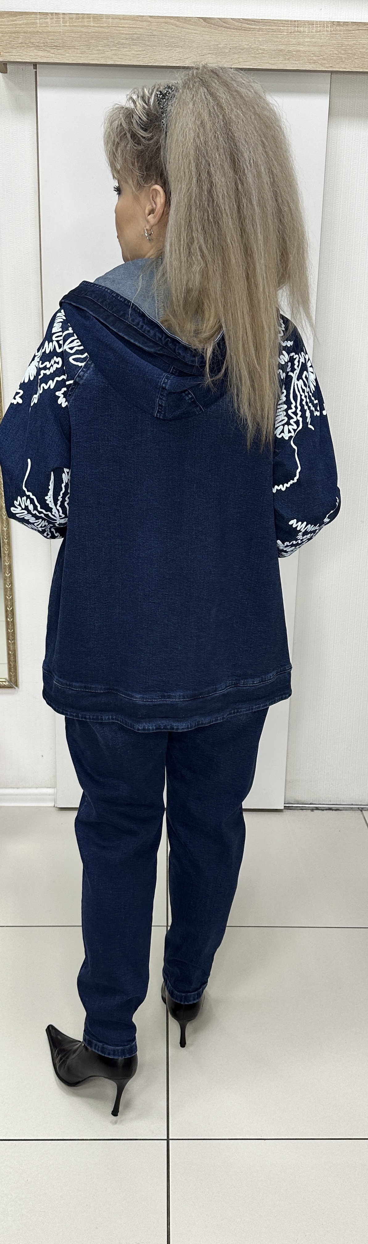Весенне-летний джинсовый костюм: ветровка + джинсы. Костюм с красивым орнаментом в виде принта-отделки модель 5647 именно то, что вам необходимо. Джинсы на круговой резинке с кармашками, с от строчками и белым принтом зауженные, выгодно дополняет прямой жакет-куртка с кармашками и капюшоном и таким же белым принтом. Костюм прекрасно подойдет для прогулок. И самостоятельно можно носить каждую вещь и вместе они бомбически смотрятся.