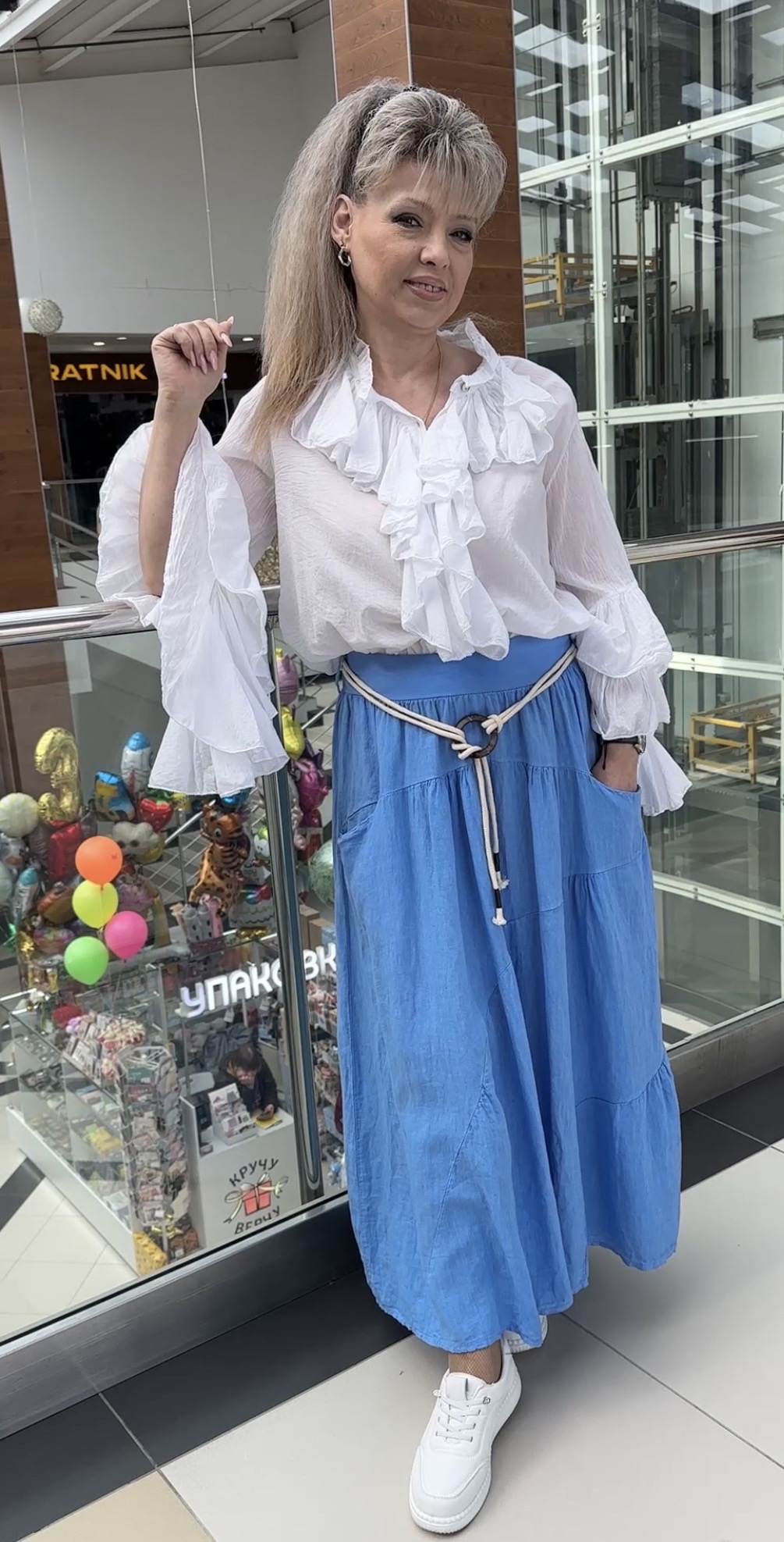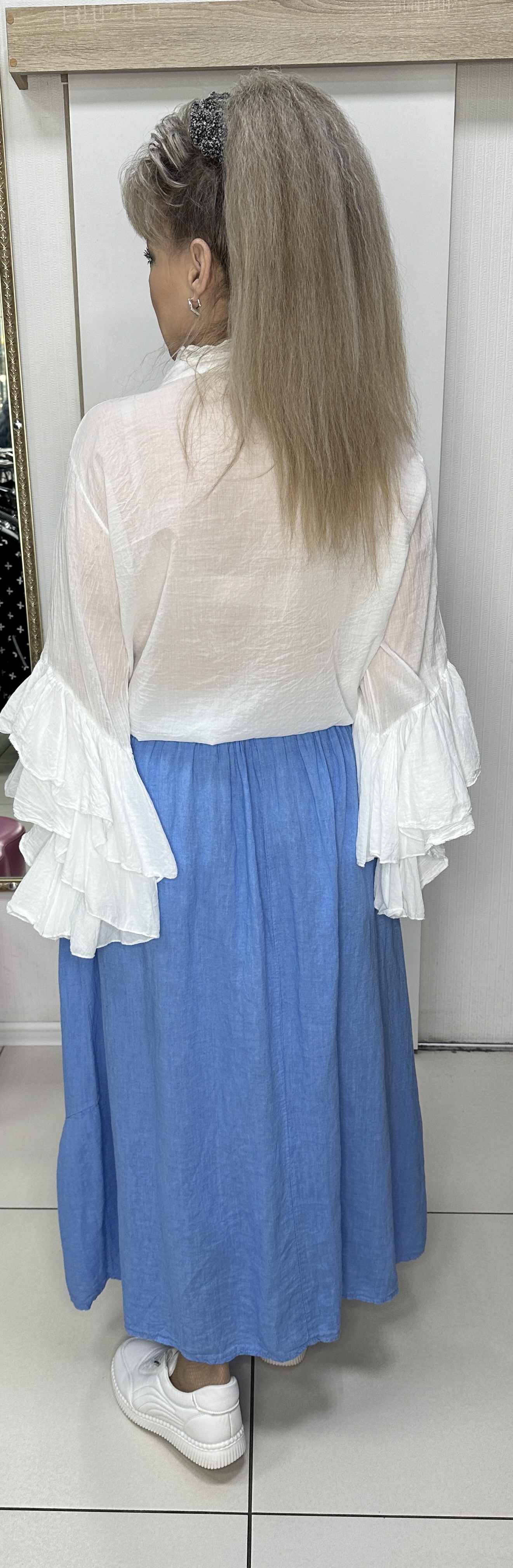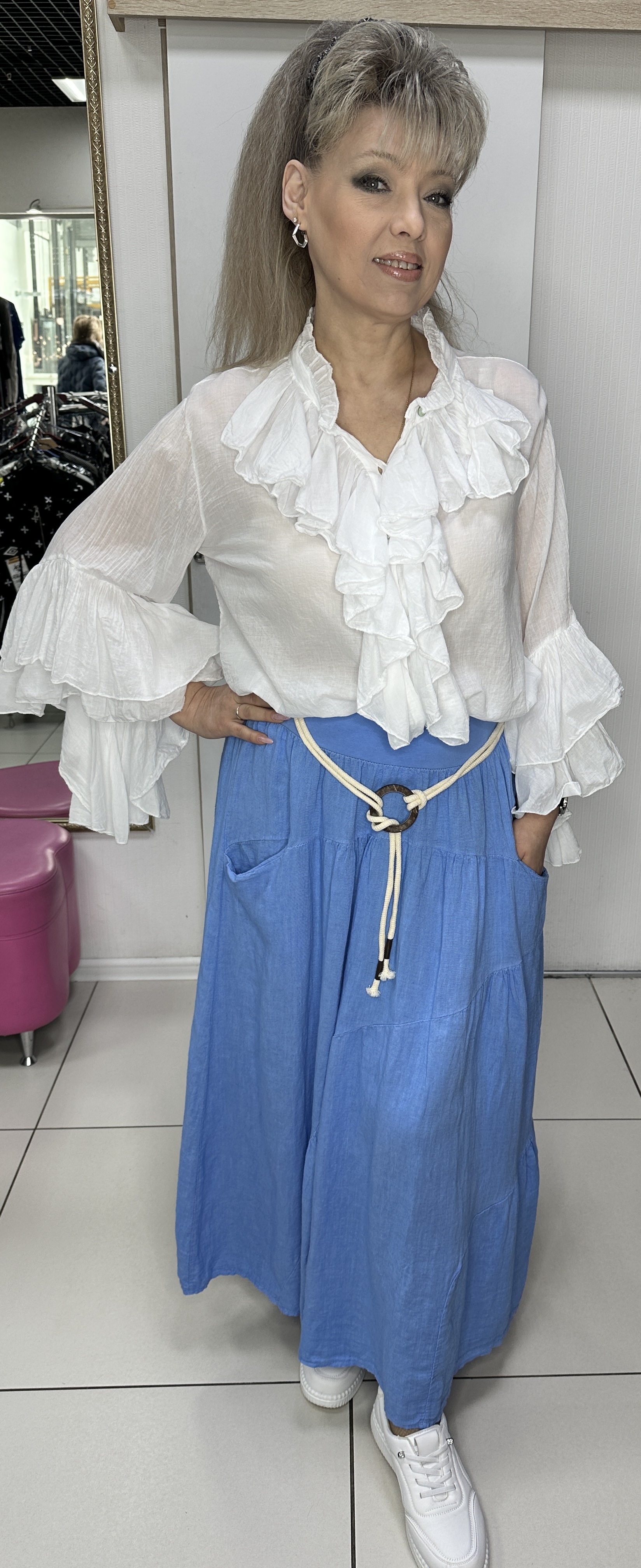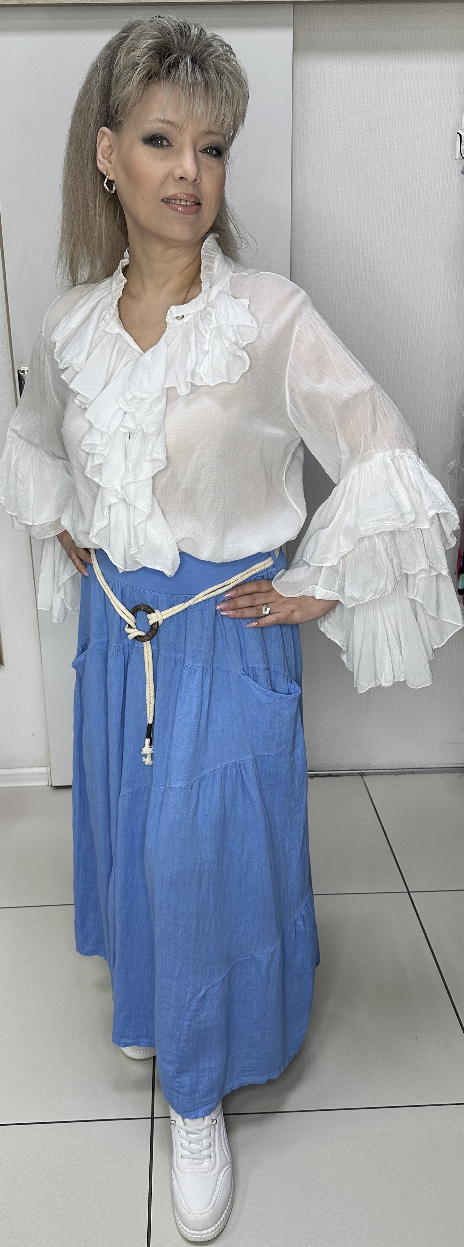 Льняная, длинная юбка с вертикальными "мягкими" складками на поясе-резинке модель 3229 с кармашками и ремешком-жгутом. Фасон юбки прямой, свободный. С правильно подобранной блузкой отличная альтернатива нарядному платью. В наличии: голубая, белая и оливковая.