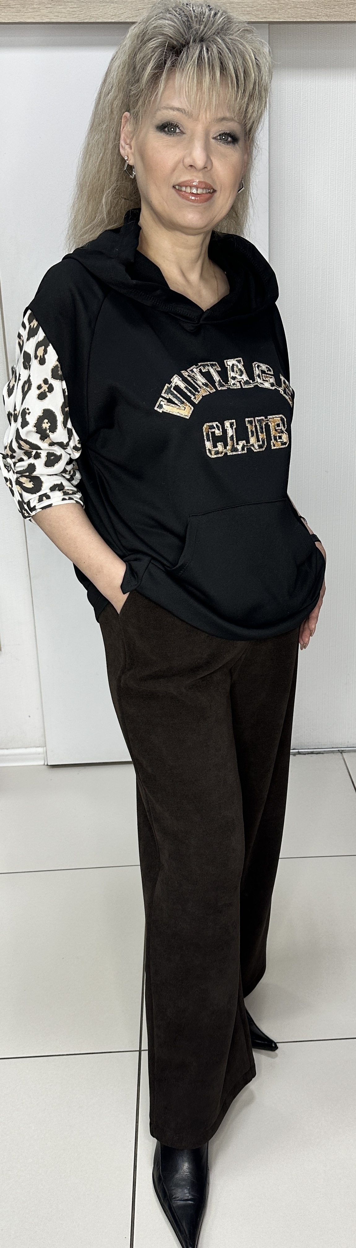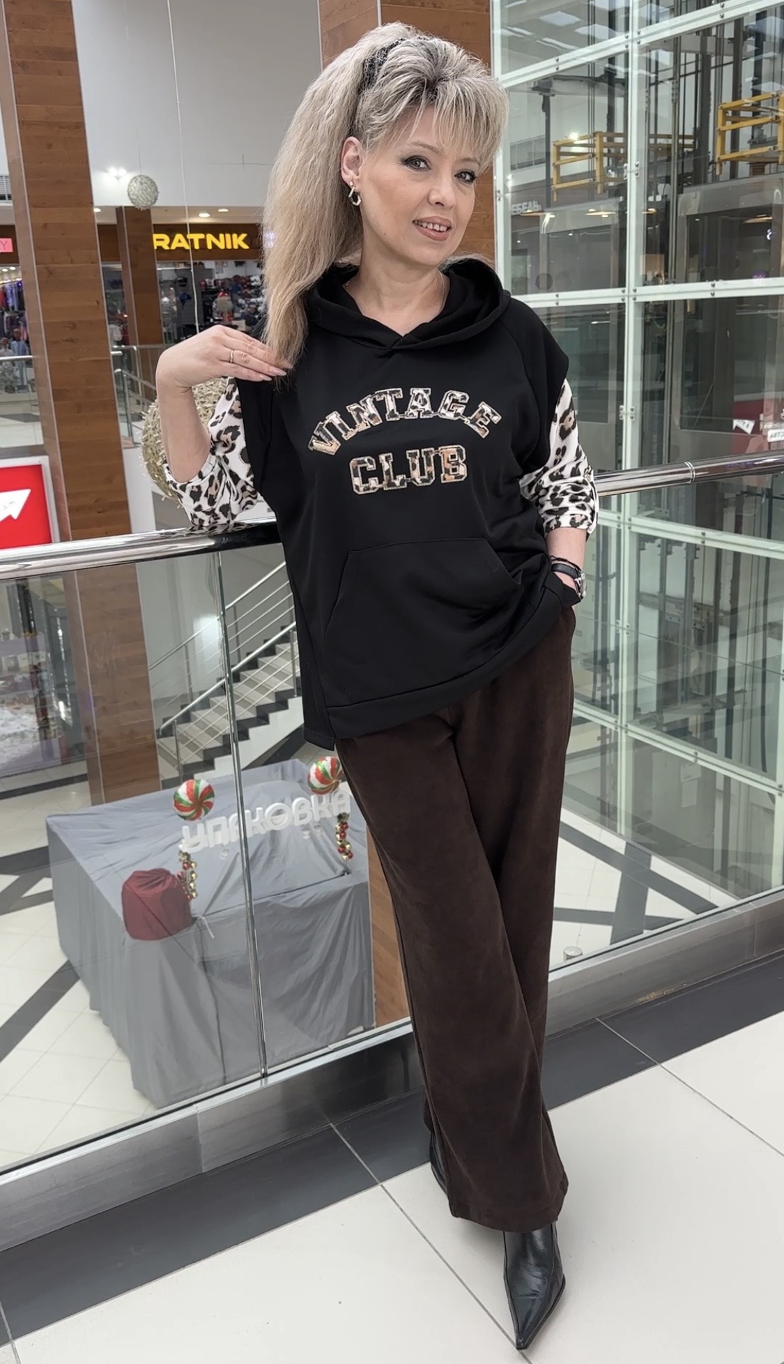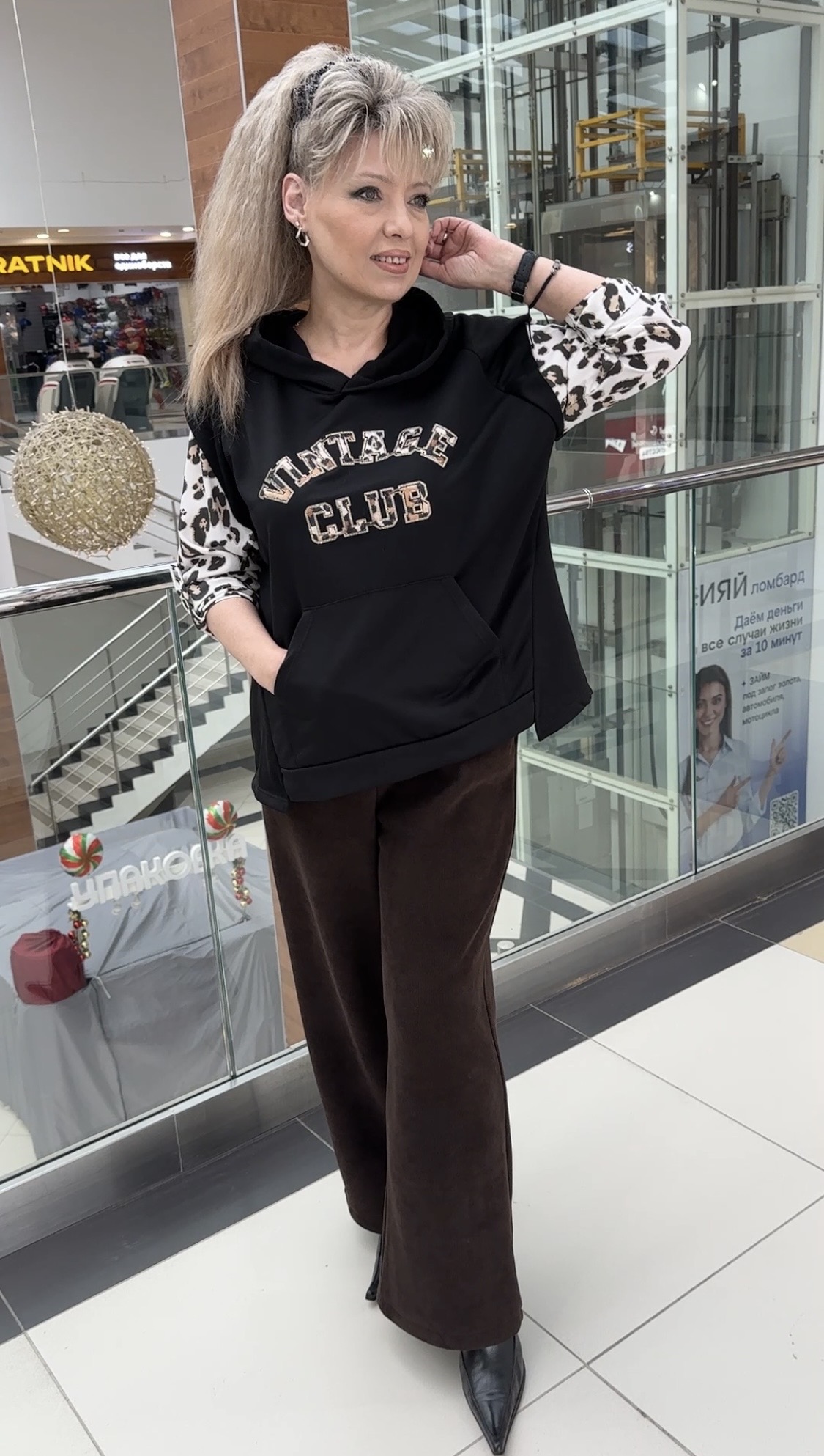 Классная комбинированная худи. Модель 83611 займет достойное место в вашем гардеробе. Одежда стиля спорт-шик все больше пользуется спросом в современном мире. Она функциональная, она удобная. Худи визуально состоит из двух вещей: черный жилет с кармашком и капюшоном и светлая рубашка с леопардовым принтом. Но это одна вещь! С капюшоном, с карманом "кенгуру" и латинскими буквами с леопардовым принтом - самый востребованный фасон.