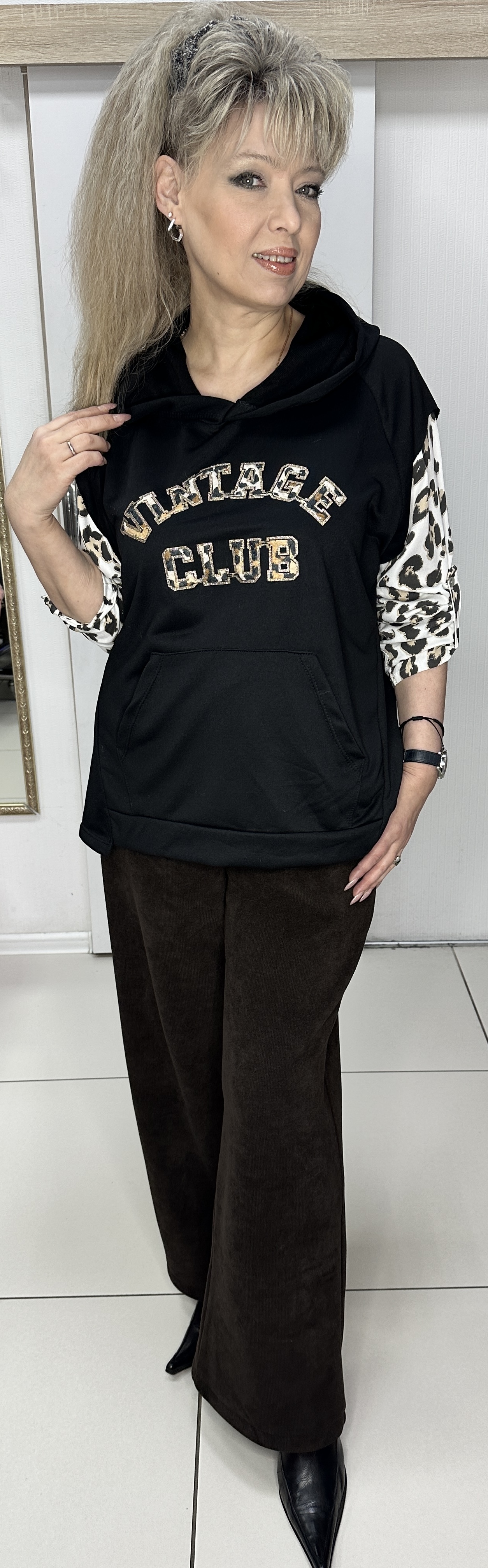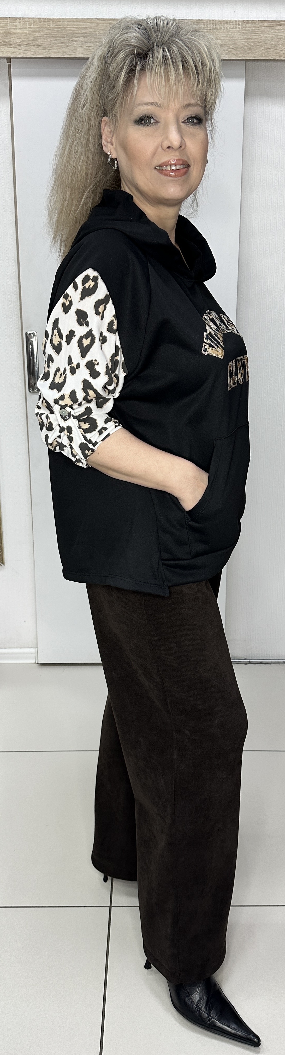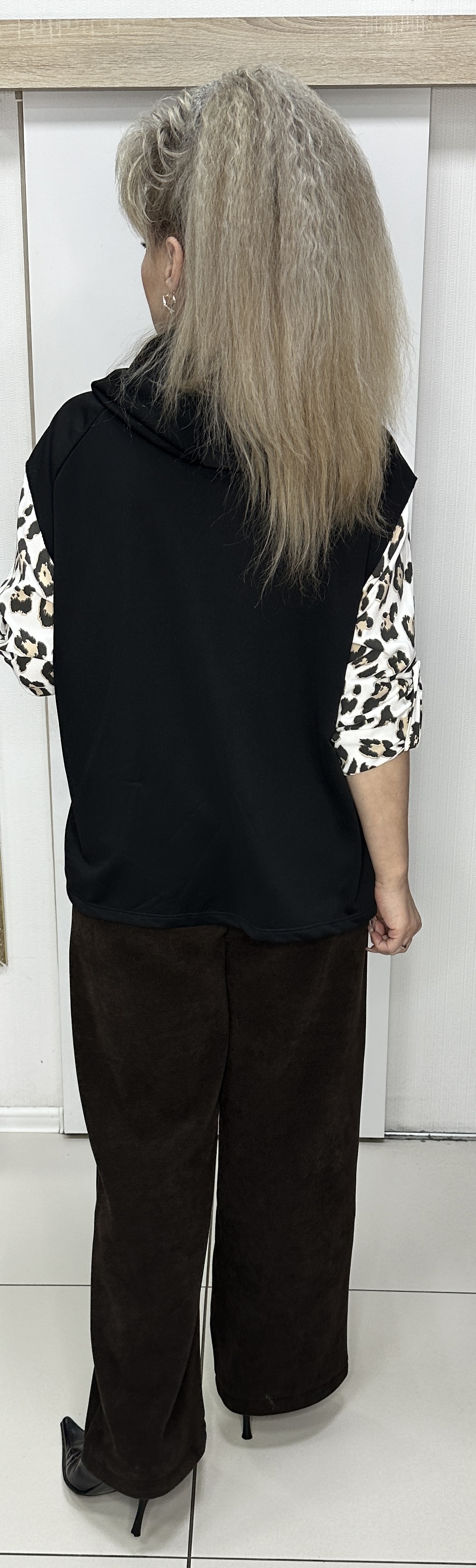 Классная комбинированная худи. Модель 83611 займет достойное место в вашем гардеробе. Одежда стиля спорт-шик все больше пользуется спросом в современном мире. Она функциональная, она удобная. Худи визуально состоит из двух вещей: черный жилет с кармашком и капюшоном и светлая рубашка с леопардовым принтом. Но это одна вещь! С капюшоном, с карманом "кенгуру" и латинскими буквами с леопардовым принтом - самый востребованный фасон.
