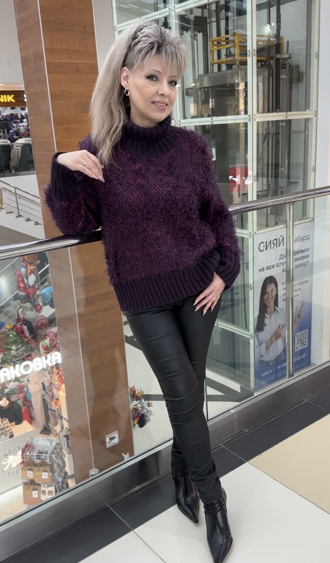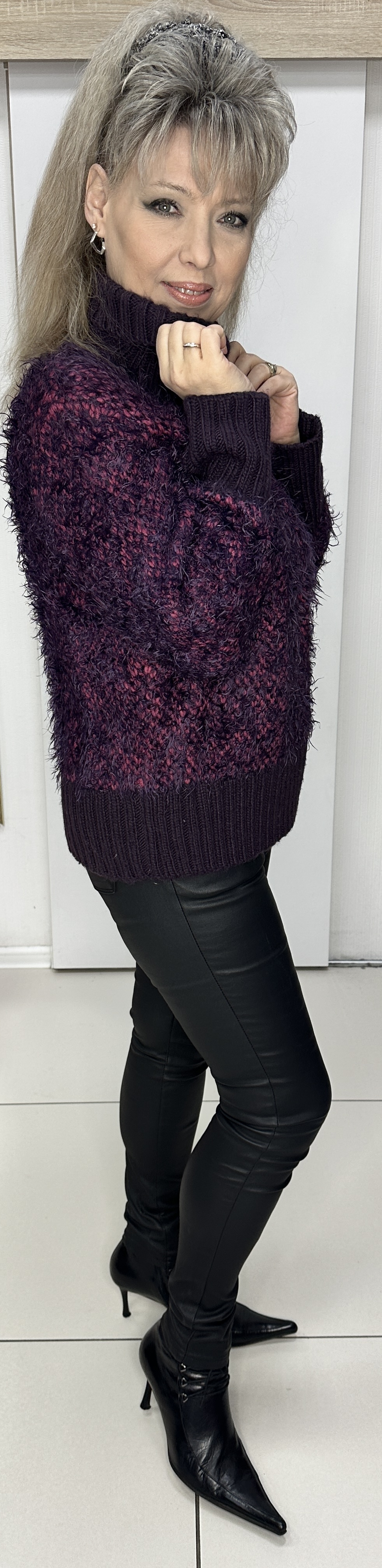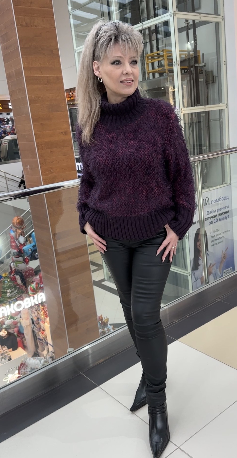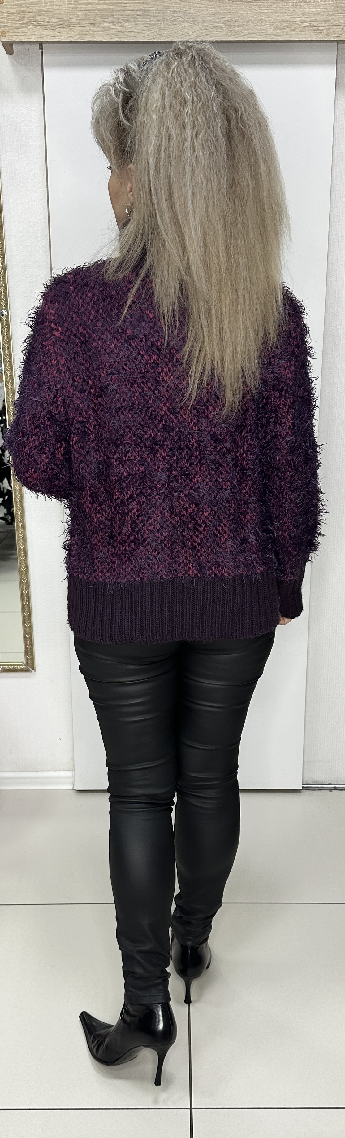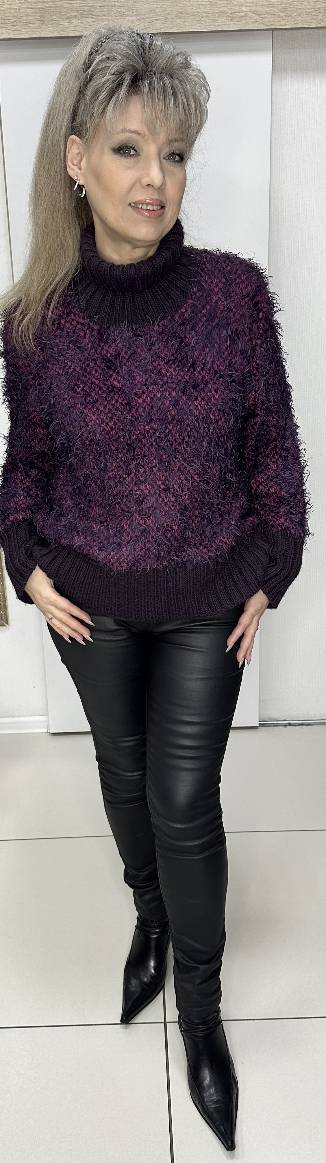 Короткий бордово-фиолетовый теплый свитер с ворсистой отделкой - модель 828630 от бренда немецкого DOLORES способна украсить любую женщину. Однотонного бардового цвета резинка и воротник-хомут. Свитер хорошо подойдет к любому низу. Достойный вариант теплой одежды.