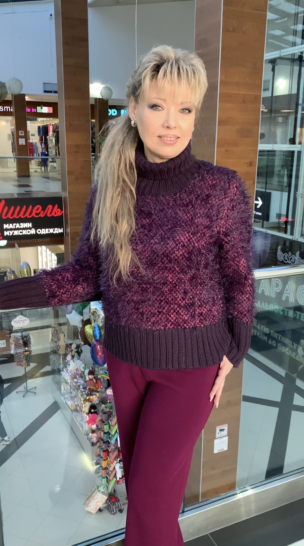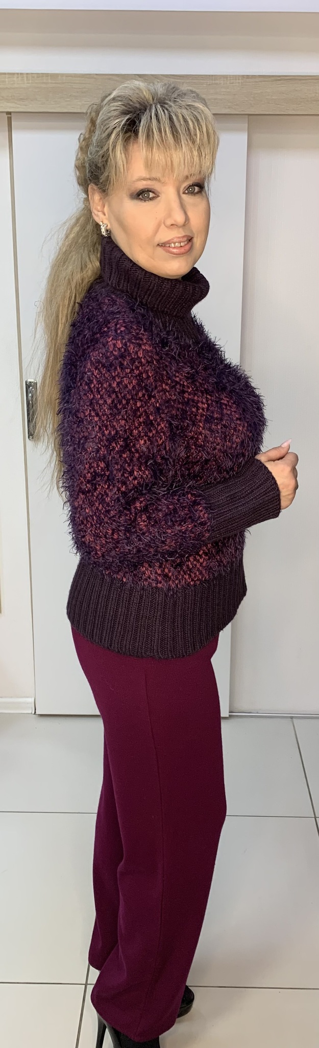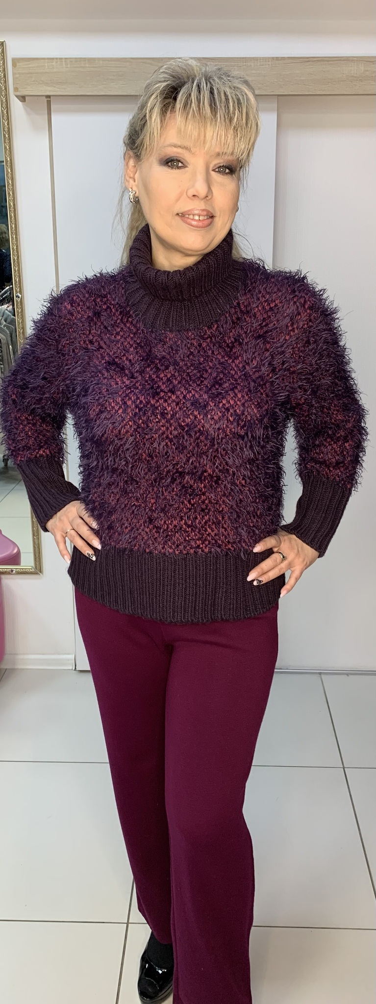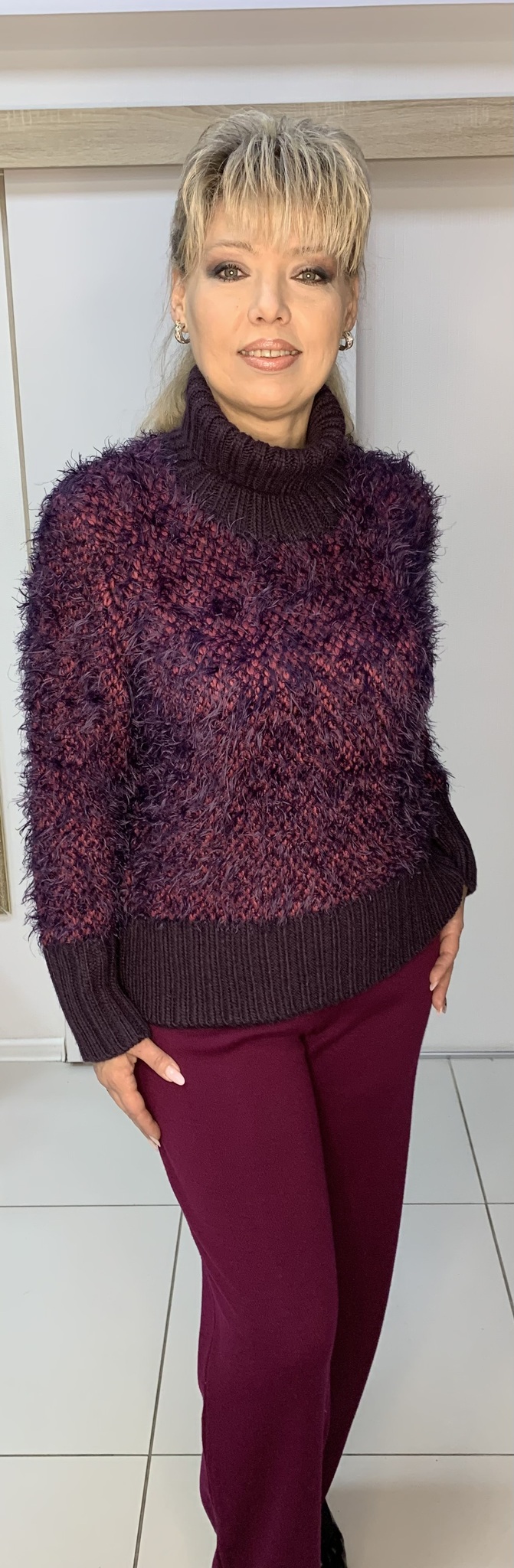 Короткий бордово-фиолетовый теплый свитер с ворсистой отделкой - модель 828630 от бренда немецкого DOLORES способна украсить любую женщину. Однотонного бардового цвета резинка и воротник-хомут. Свитер хорошо подойдет к любому низу. Достойный вариант теплой одежды.