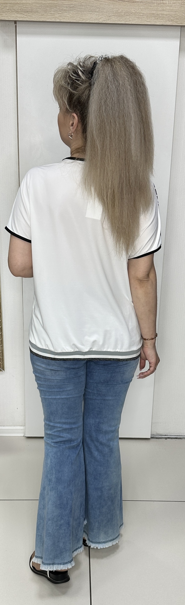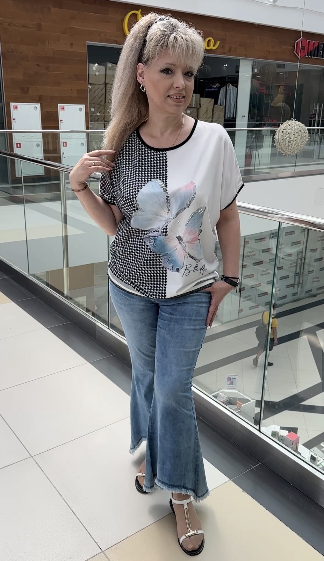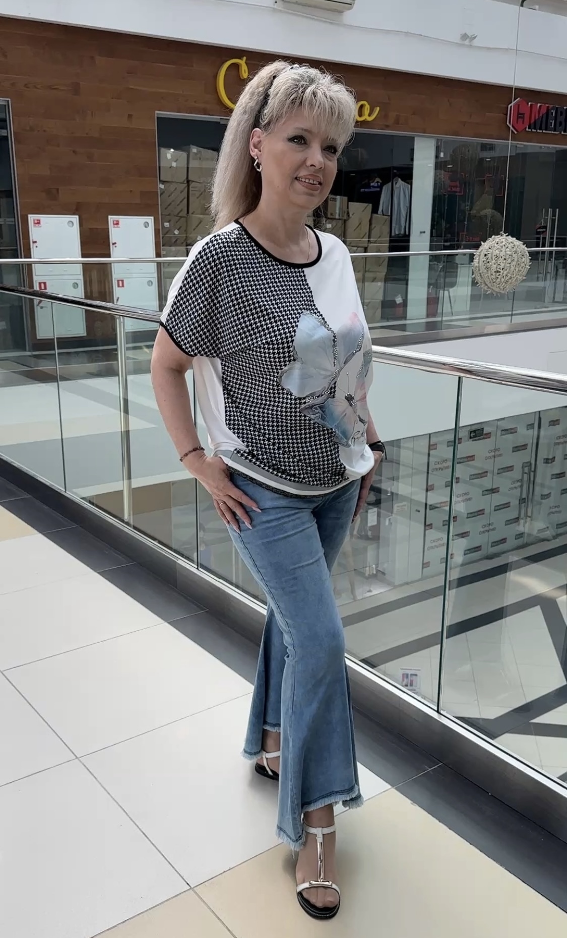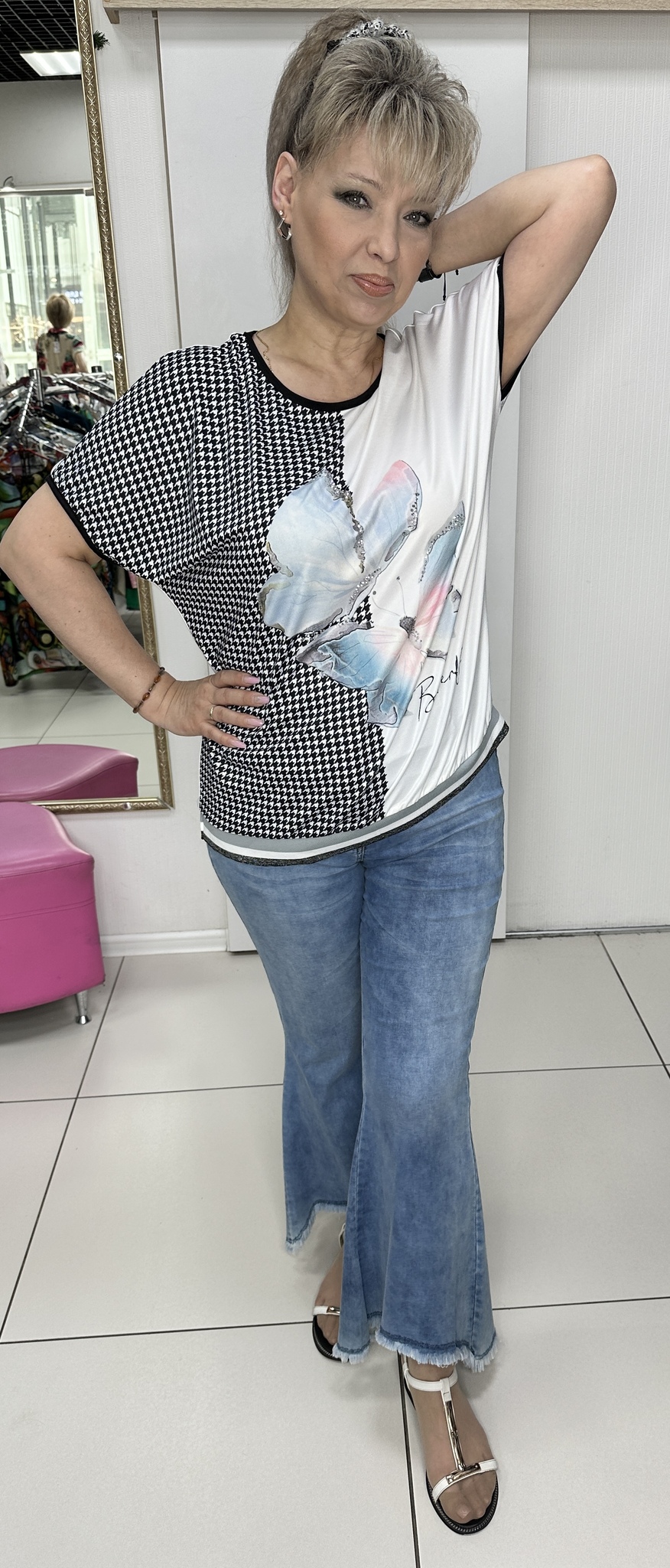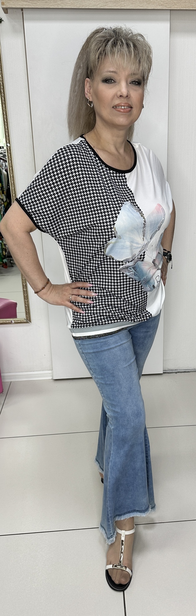 У этого блузона 2 разные половинки, одна: это "гусиная лапка", а другая: белая и объединяют их стразовые бабочки. Модель 2426 подойдет для любых мероприятий. Слегка заужен к низу, круглое декольте, короткий спущенный рукав. Рекомендуем полным женщинам. Блузон ищет свою хозяйку.