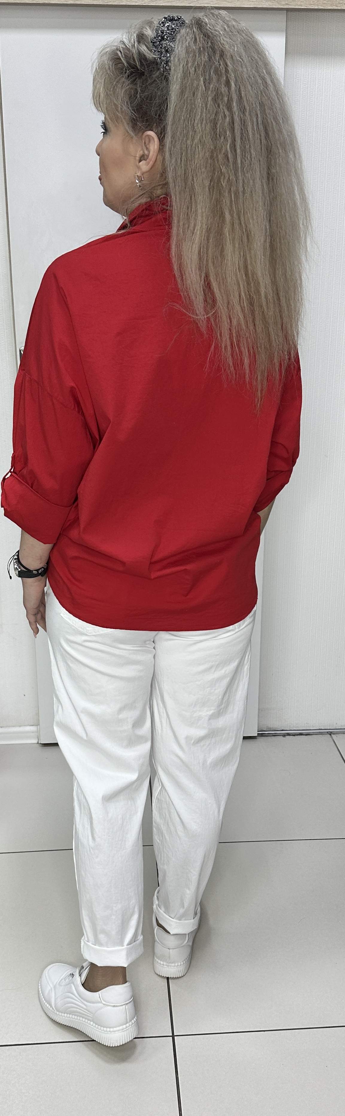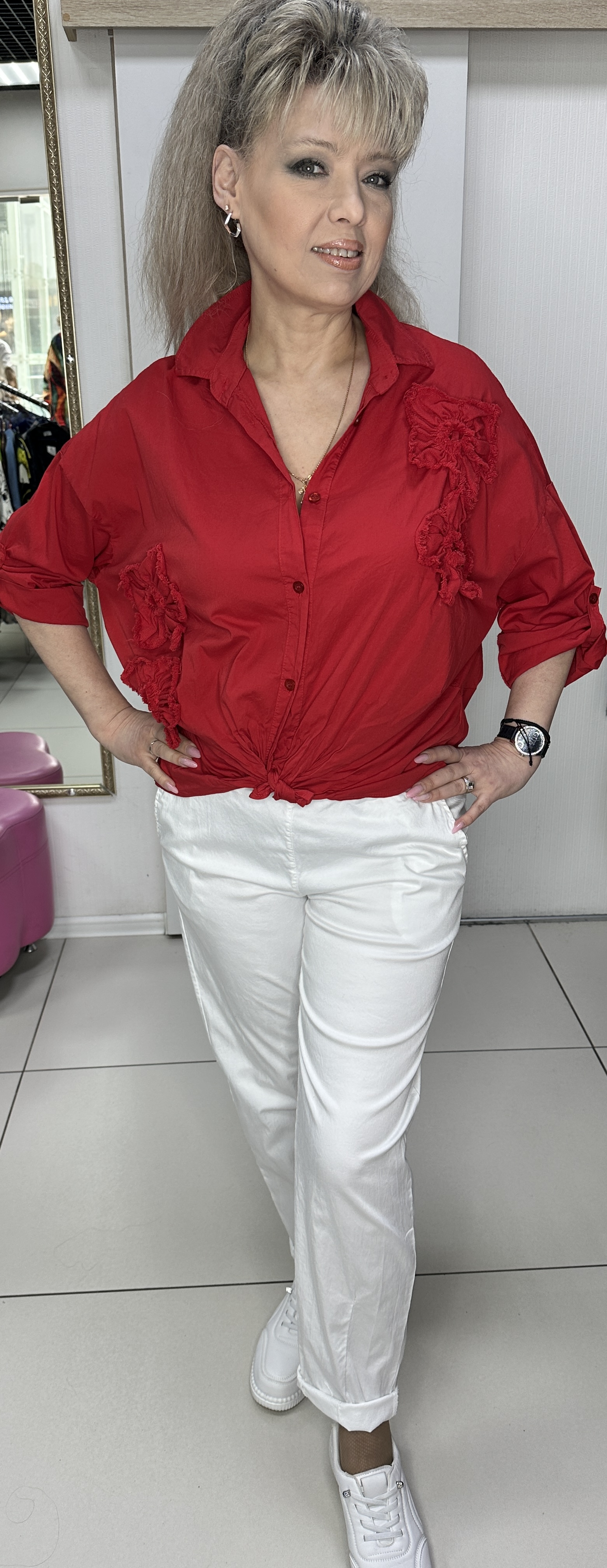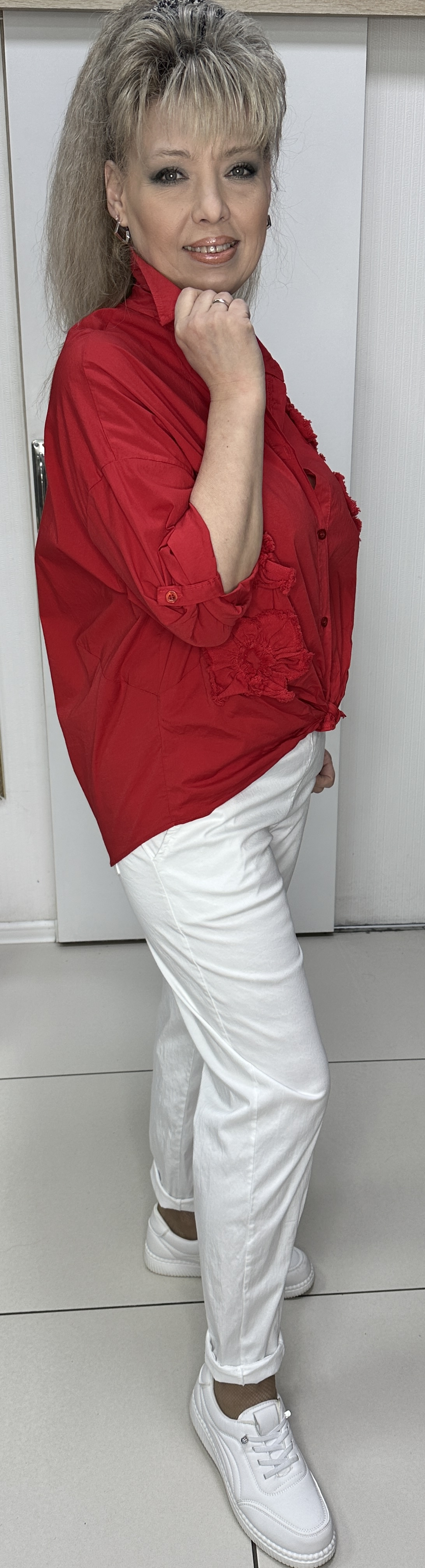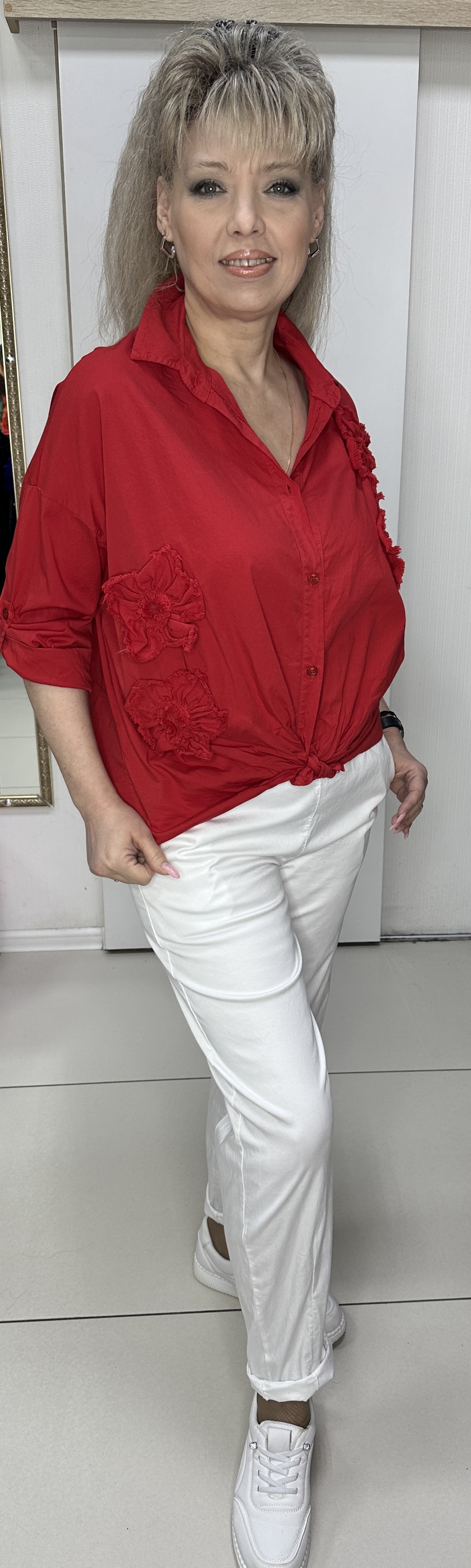Красная, яркая, итальянская рубашка. Фасон: прямой свободный, длинный рукав. Для лета это самый востребованный фасон и модель 6677 на каждый день. Рубашка на пуговицах, со спущенным плечом и регулировкой длины рукавов, и разной длиной по низу рубашки. Изюминка: по лицевой стороне нашиты цветочки в тон рубашки. Очень стильная, яркая рубашка.