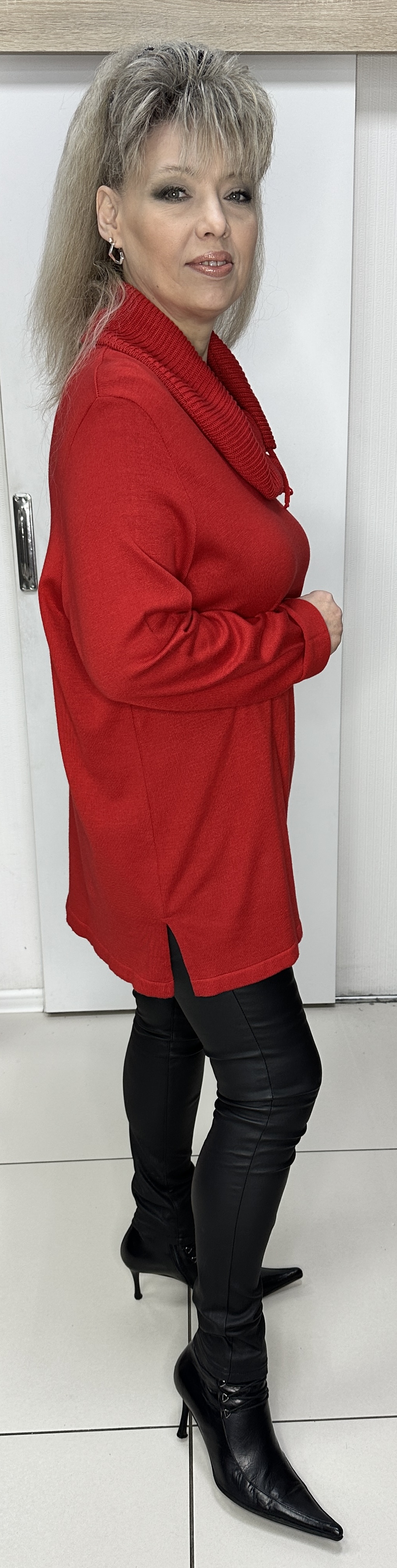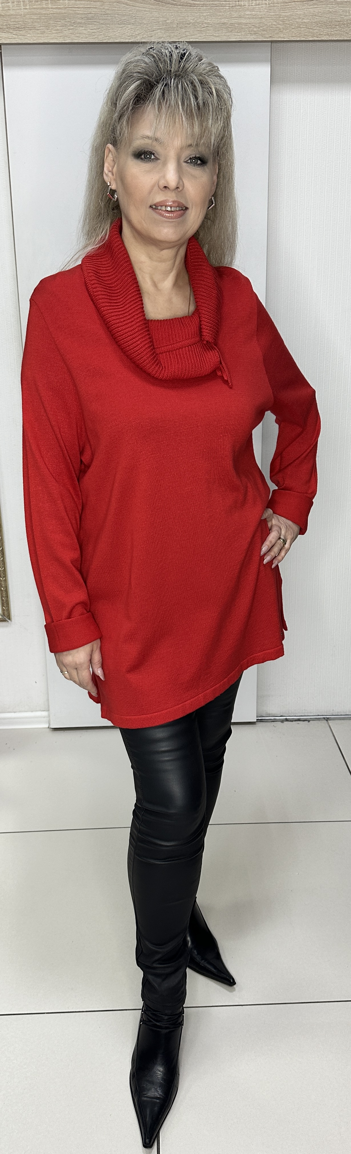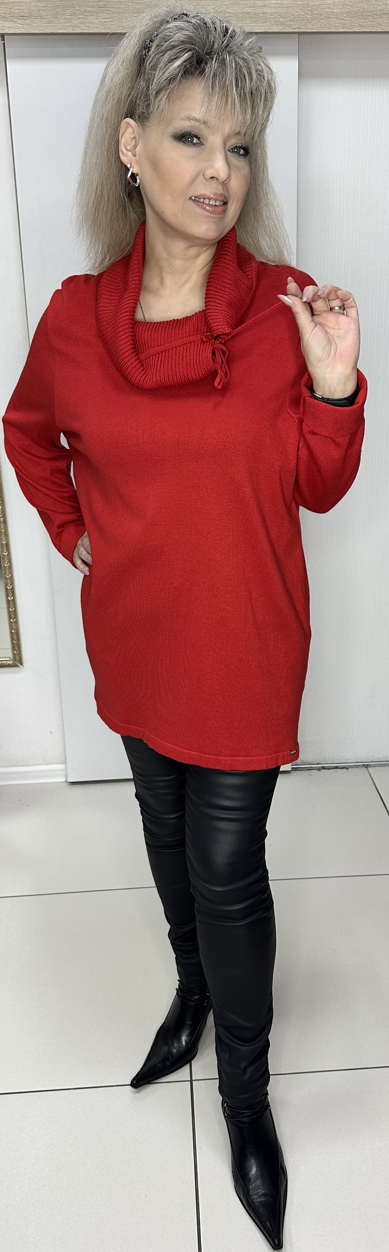 Красный трикотажный джемпер оригинального дизайна модель 1845 от немецкого бренда CHALOU на каждый день. Оригинальный ворот-хомут с веревочками. Прямой крой, разрезы по бокам, длинный рукав. Джемпер изготовлен из акрила и хлопка, что делает эту вещь универсальной для прохладной погоды. Джемпер хорошо сочетается с темным низом.