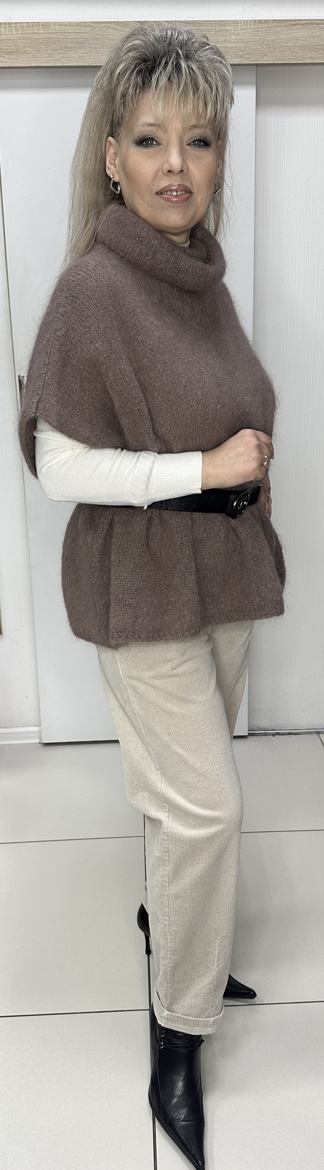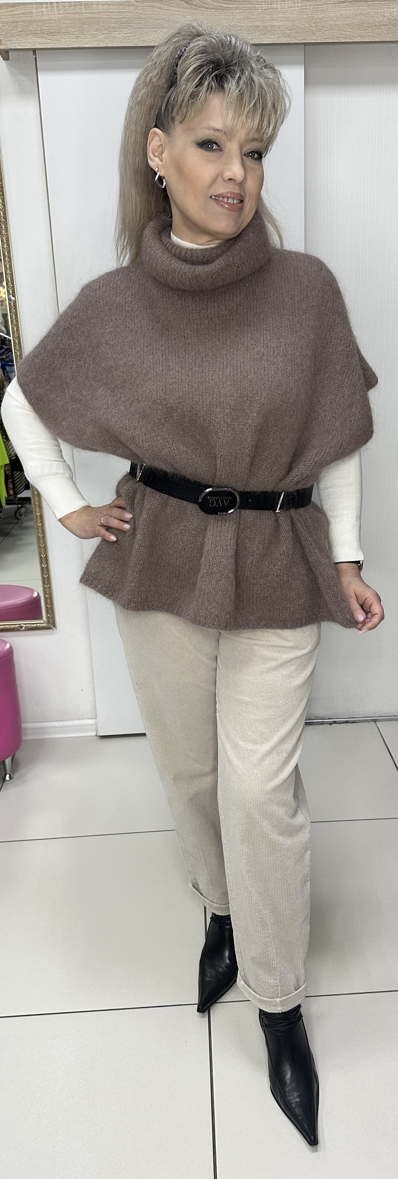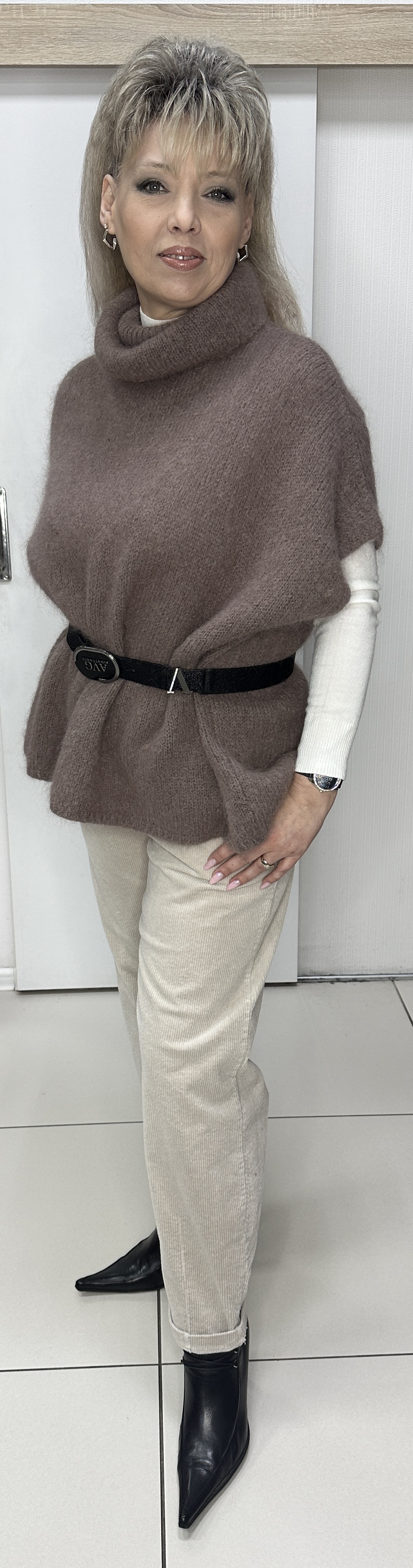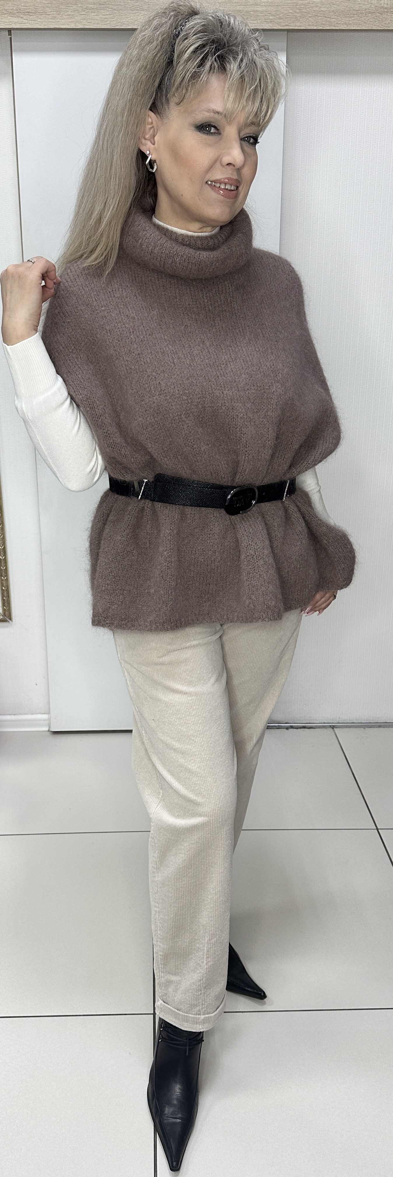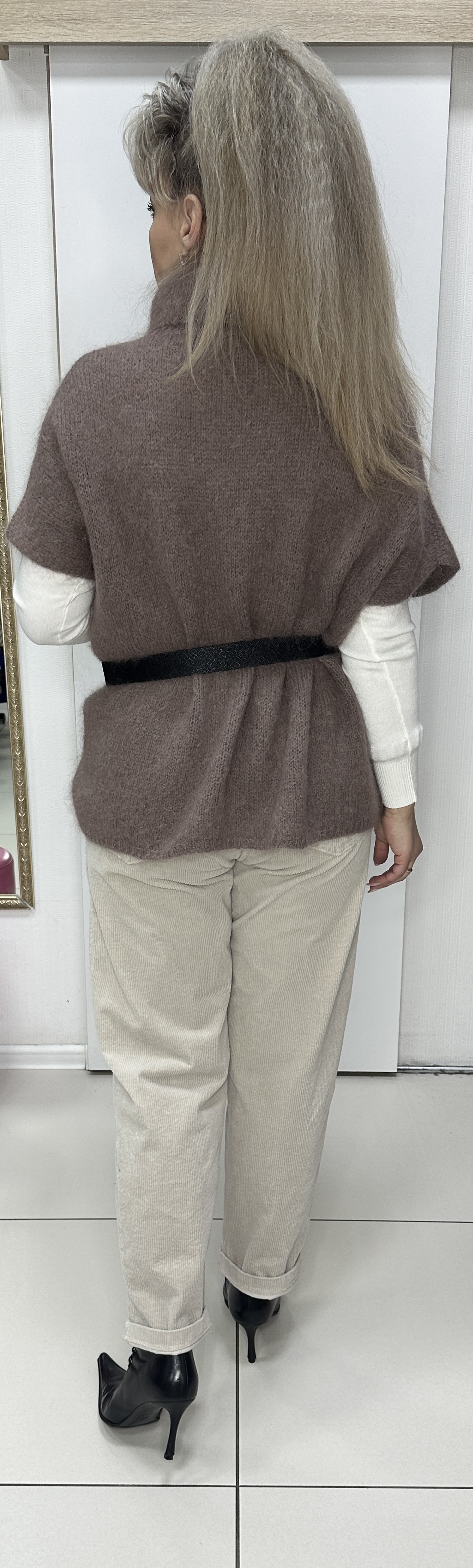 Этот жилет и внешне красив и тактильно очень приятен. Модель 23100 отличный выбор для прохладной погоды на каждый день. У жилета горло-водолазка с отворотом. Теплая и "уютная" модель приятного цвета капучино. Отлично смотрится как второй слой одежды. В продаже большие размеры. Ремень это наш аксессуар для сьемки.