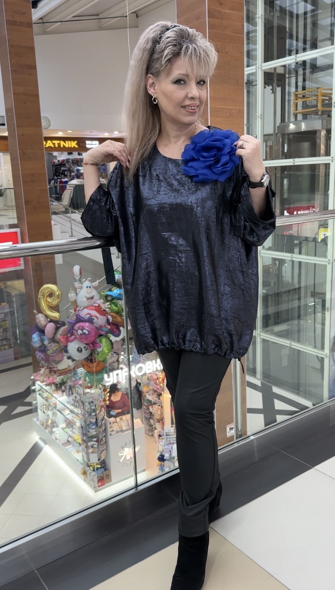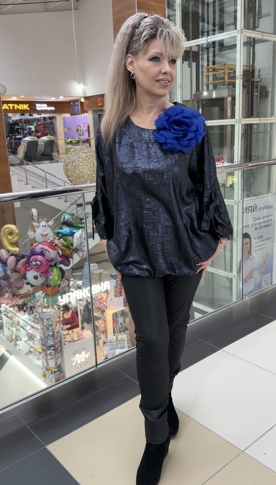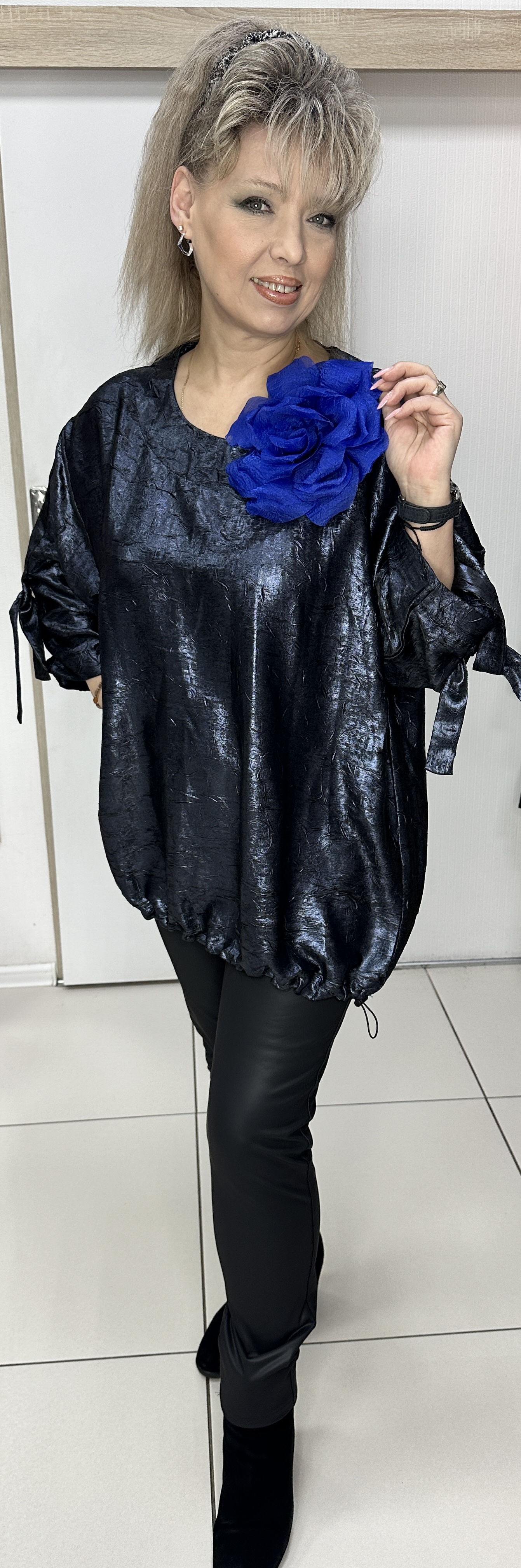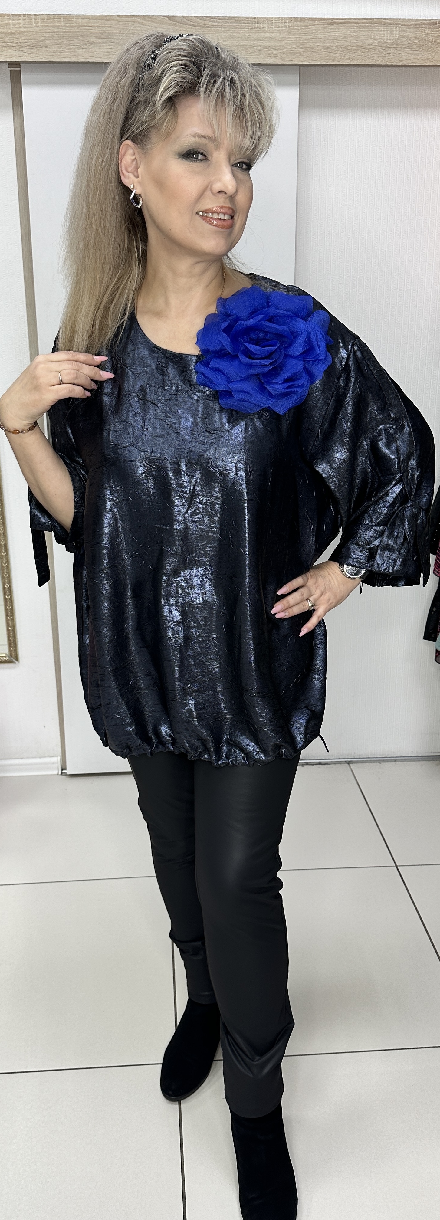 Блузон-туника на большие размеры для праздничных мероприятий, модель 3091 сделает привлекательной любую девушку(женщину). Изюминка: ткань жатка с атласным блеском, свободный фасон с широкими в тачными рукавами и кулиской по низу. Здесь бонусом идет съёмная брошь в виде капронового цветка. Эффектно и стильно смотрится обладательница в этой тунике. Спешите сделать себе такой красивый подарок!