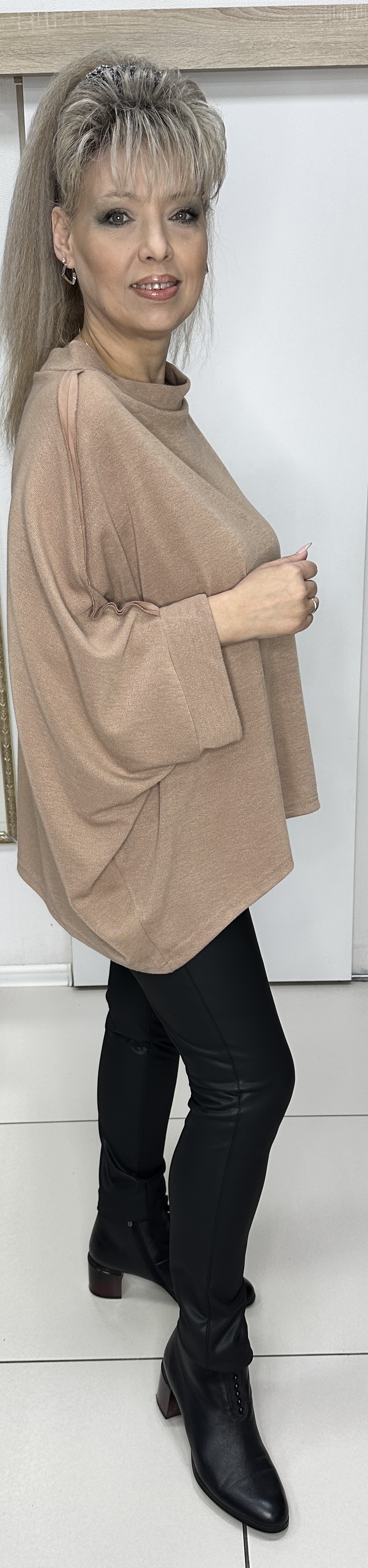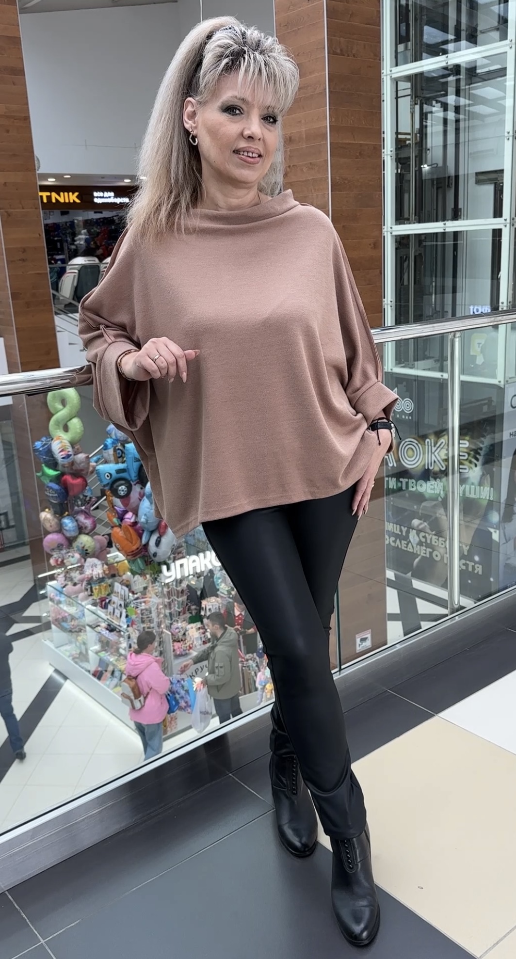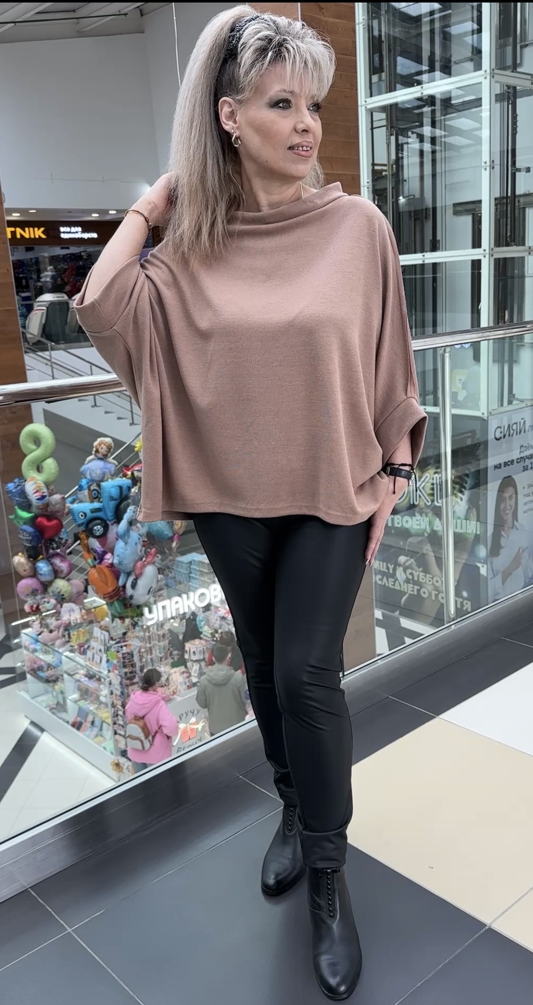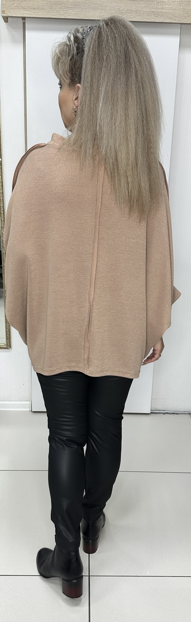 Простота и изящество, так хочется презентовать этот итальянский блузон-пончо. Любая женщина будет выглядеть в нем нарядно. Модель 21138 на праздничное мероприятие. Фасон "летучая мышь", не давящий на горло хомут и вынутые наружу швы. Легкий блеск, который придает изделию шик. В наличии: капучино и темно-синий цвета.