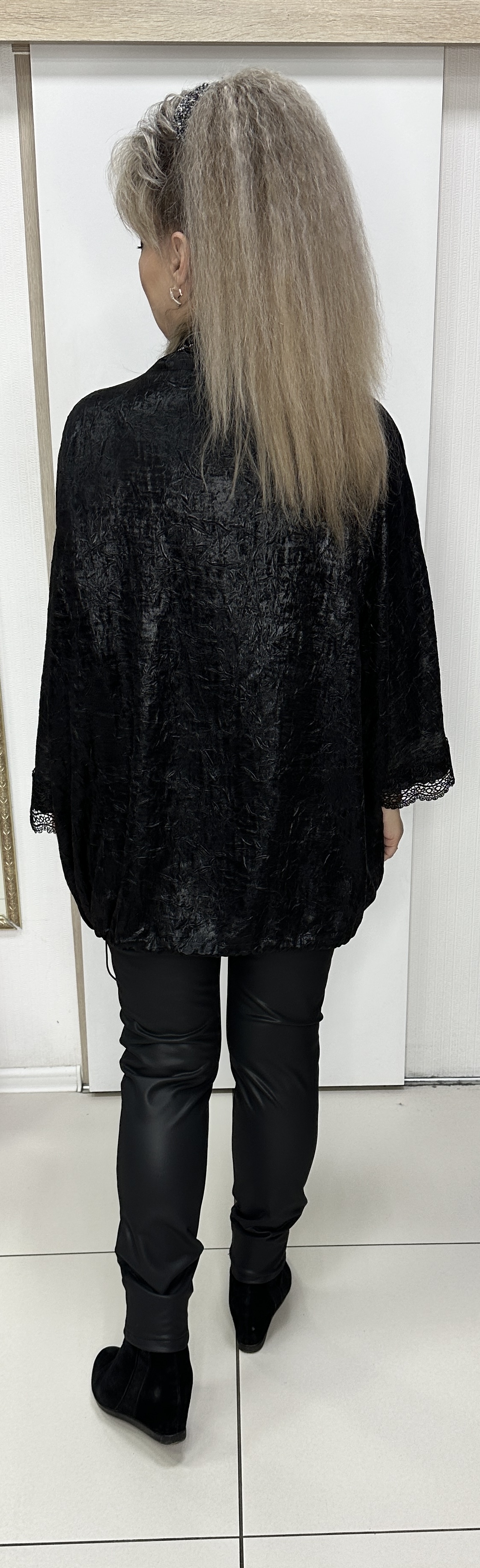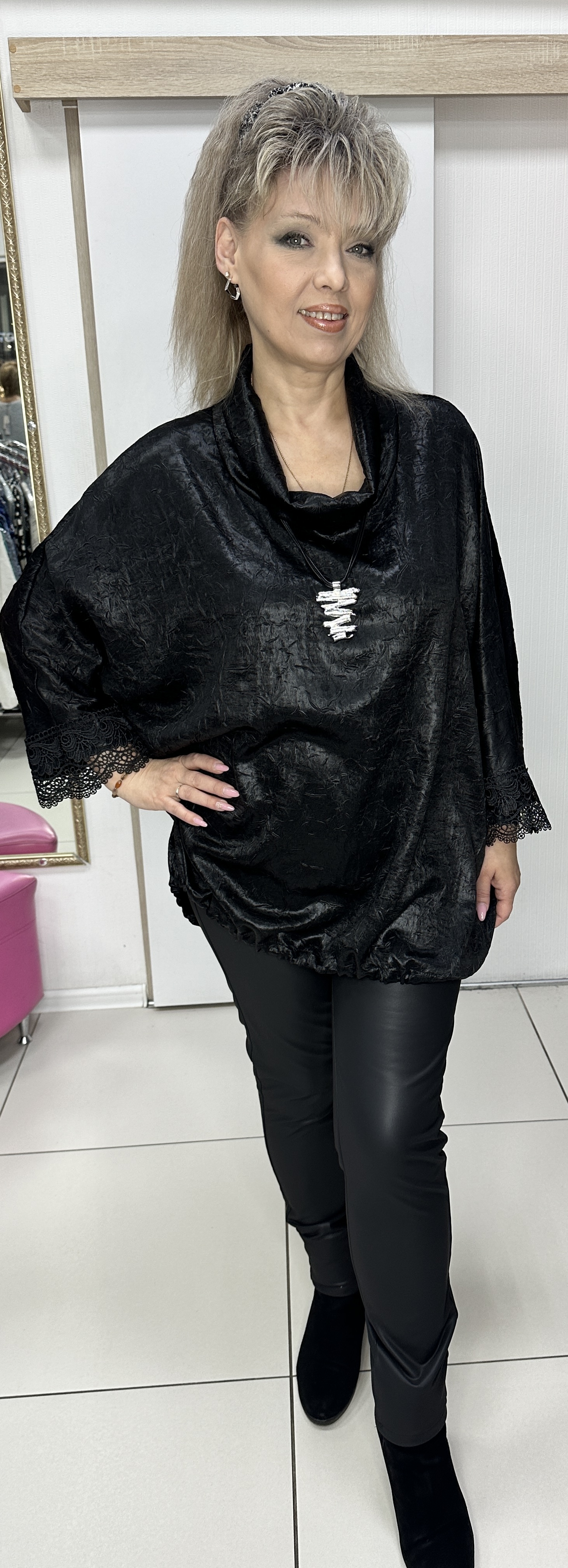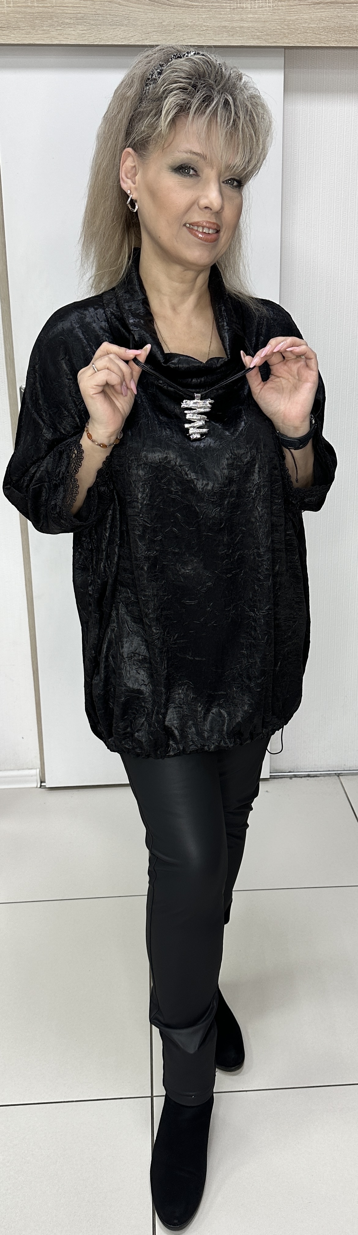 Черный блузон-туника на большие размеры, с красивым блеском для праздничных мероприятий, модель 3090 сделает привлекательной любую девушку(женщину). Изюминка: ткань жатка свободный фасон с хомутом и широкими рукавами. Изюминка: нарядность этой тунике придают черные кружева по рукавам и кулиска по низу. Здесь бонусом идет подвеска. Эффектно и стильно смотрится обладательница в этой тунике. Спешите сделать себе такой красивый подарок!