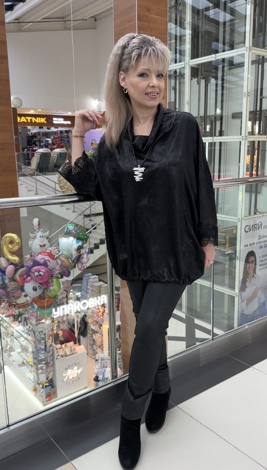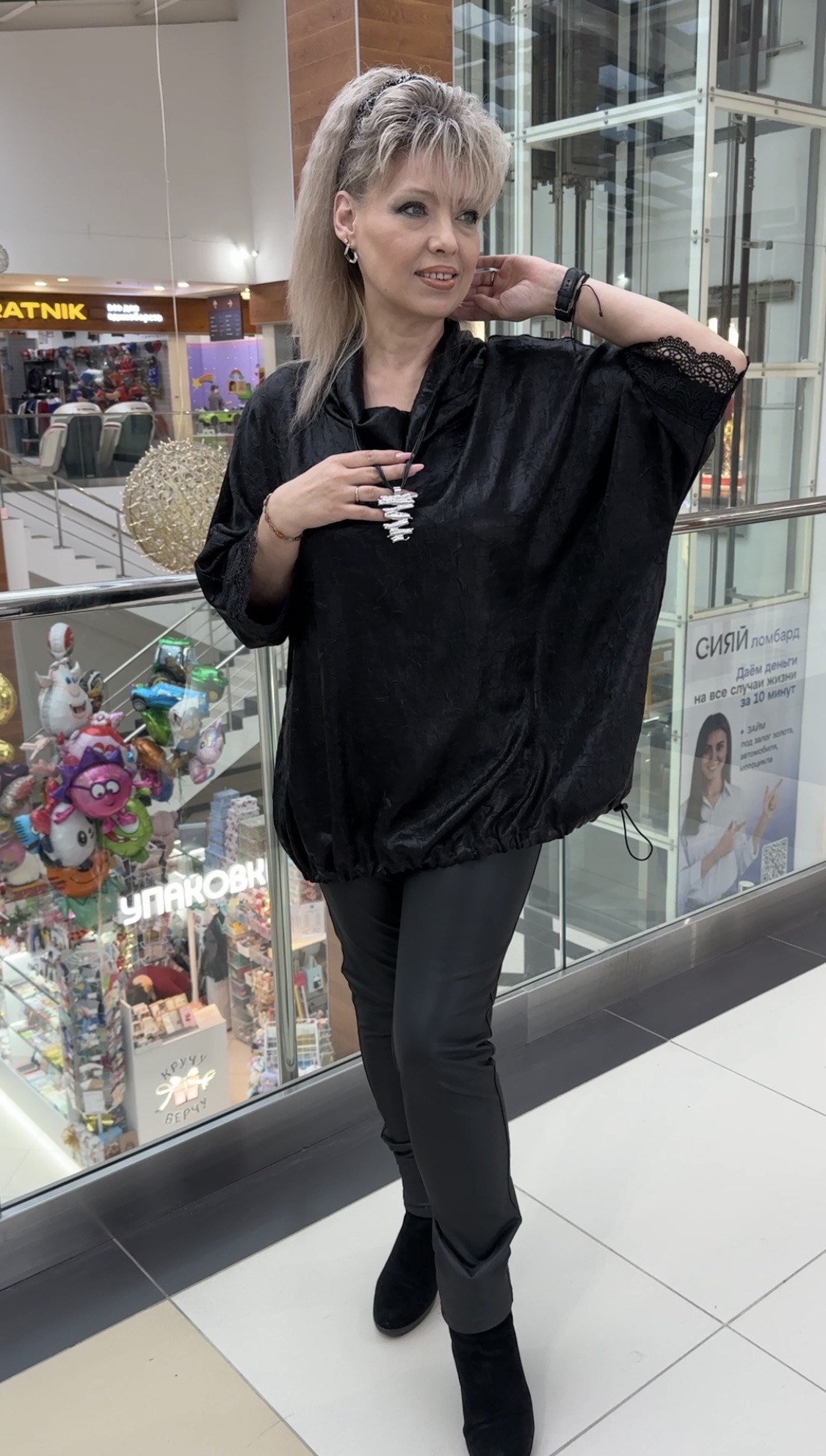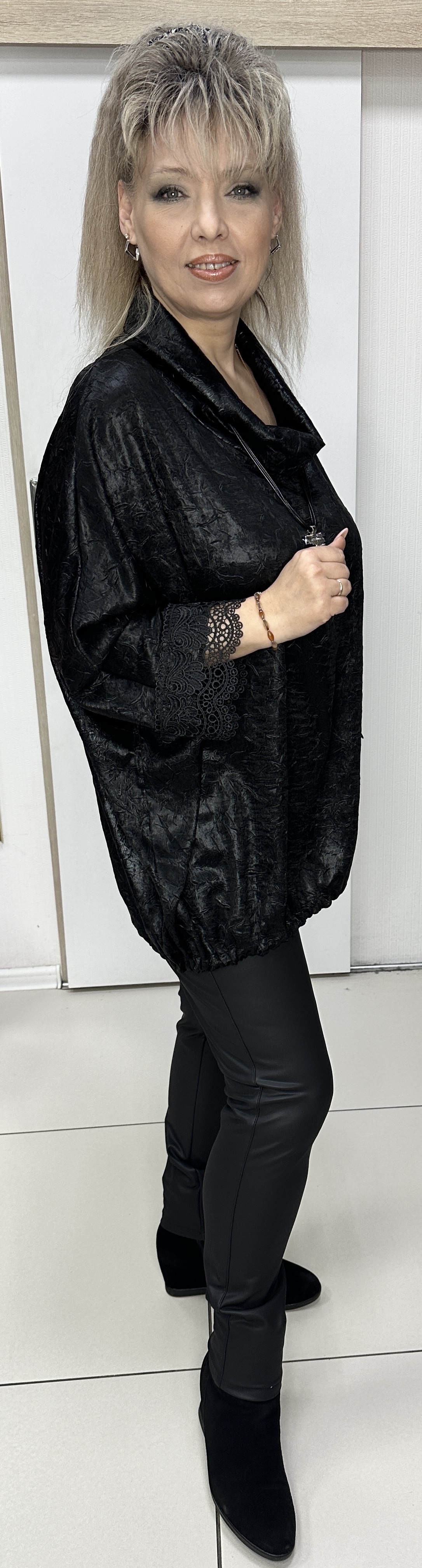 Черный блузон-туника на большие размеры, с красивым блеском для праздничных мероприятий, модель 3090 сделает привлекательной любую девушку(женщину). Изюминка: ткань жатка свободный фасон с хомутом и широкими рукавами. Изюминка: нарядность этой тунике придают черные кружева по рукавам и кулиска по низу. Здесь бонусом идет подвеска. Эффектно и стильно смотрится обладательница в этой тунике. Спешите сделать себе такой красивый подарок!