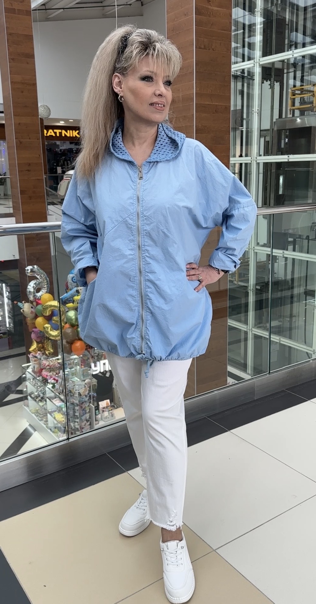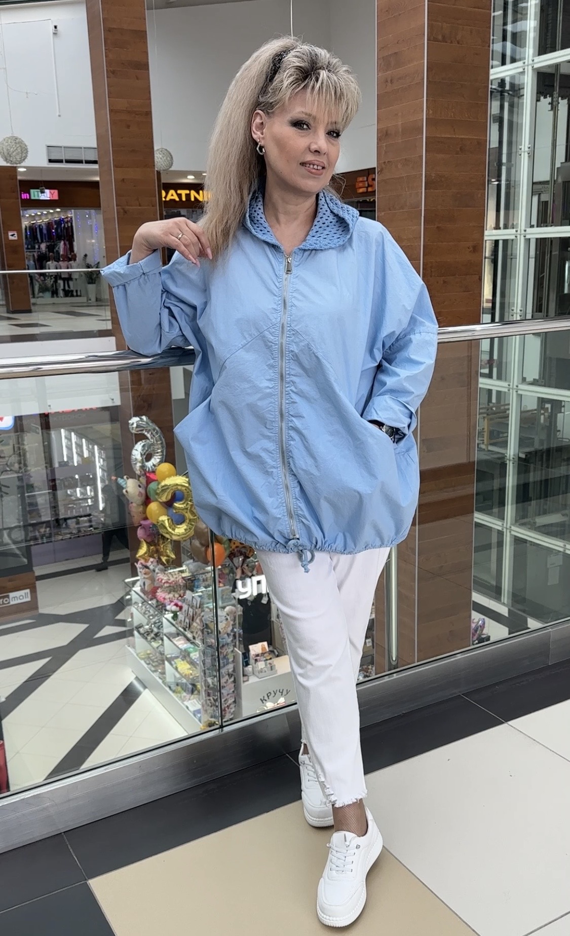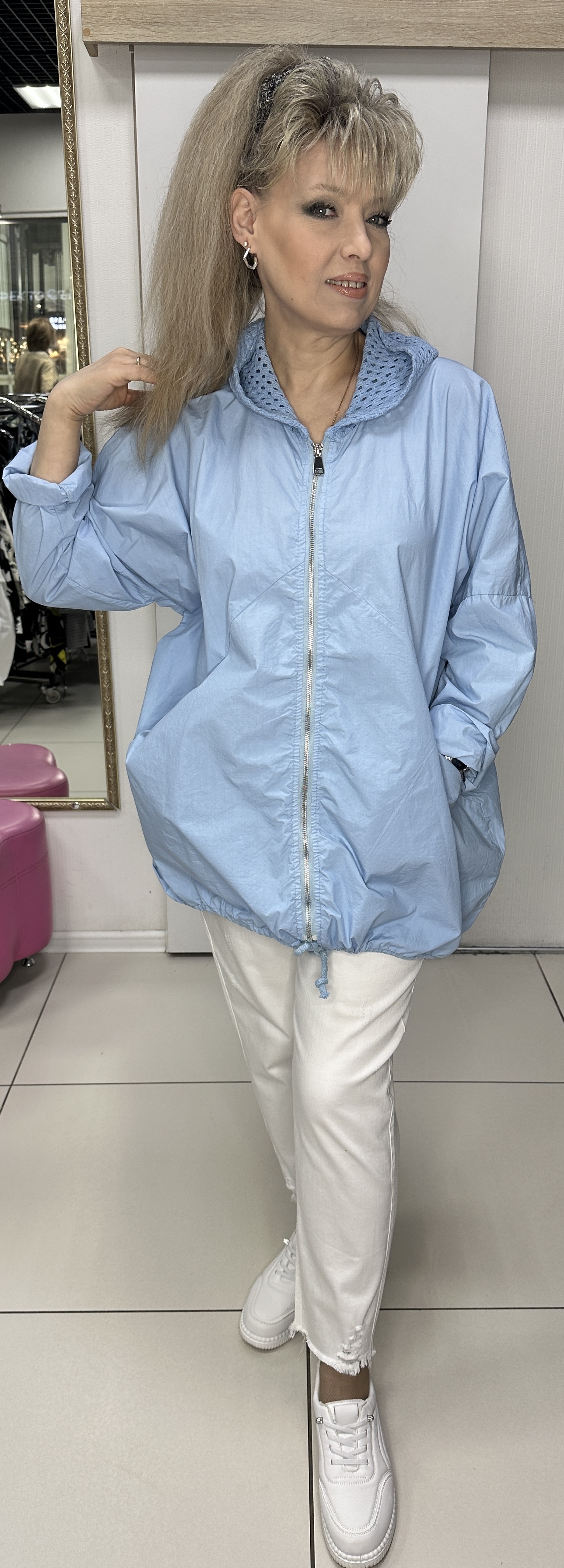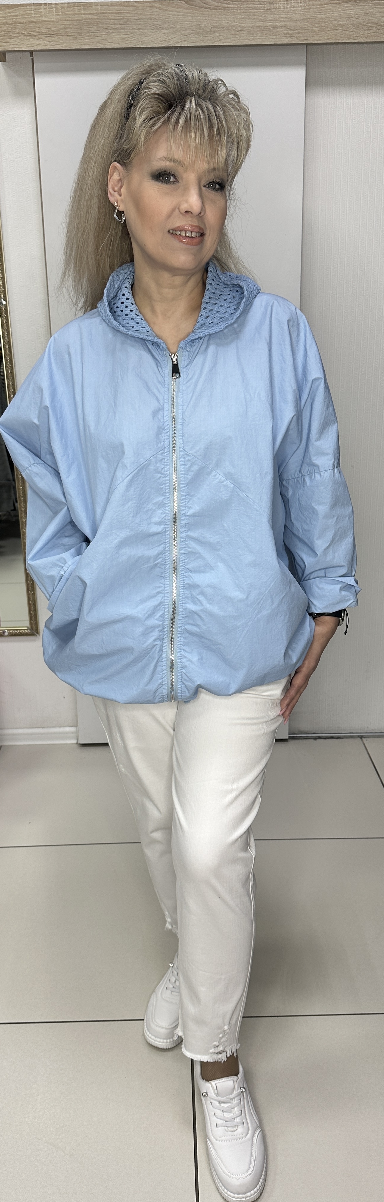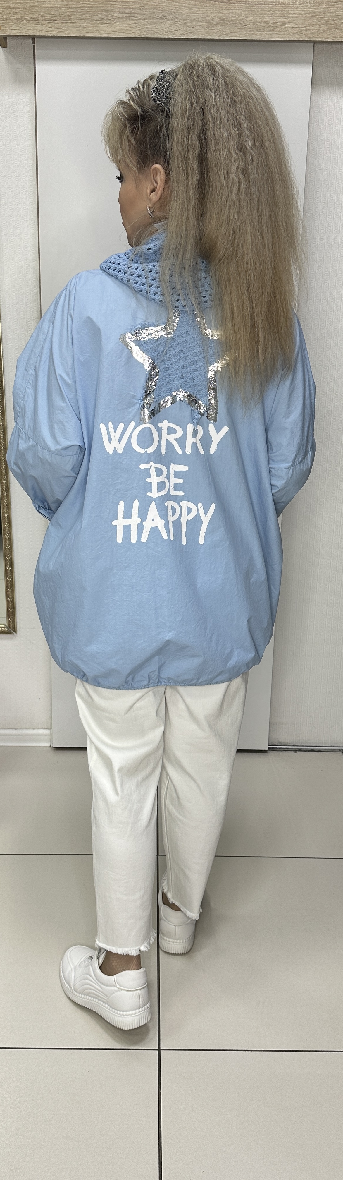 Хлопковый итальянский пыльник-ветровка c застежкой на молнии, с сетчатым трикотажным капюшоном, с кулиской, с кармашками и блестящим принтом в виде надписи и звезды по спине, модель 29402 для прохладных весенне-летних дней. В наличии: голубой, белый и оливковый цвета. В наличии большие размеры.