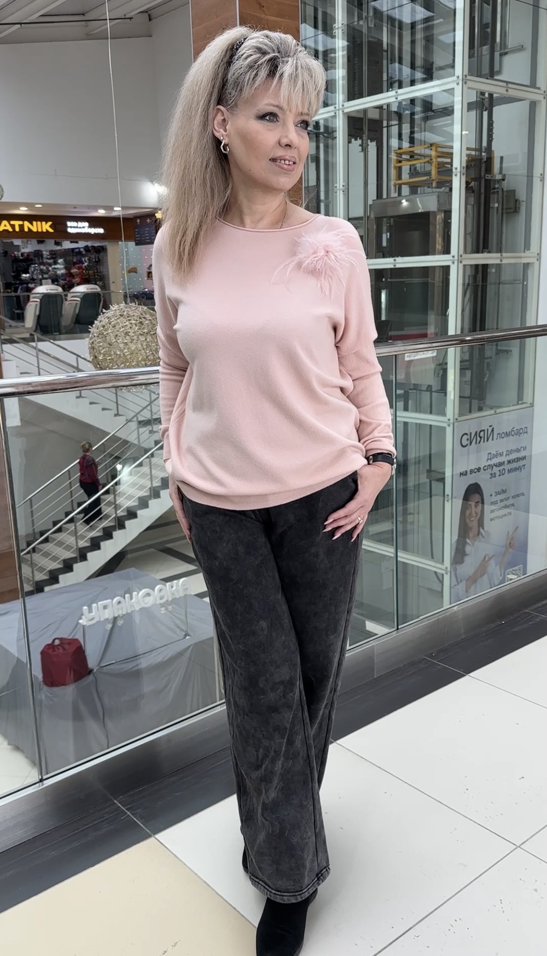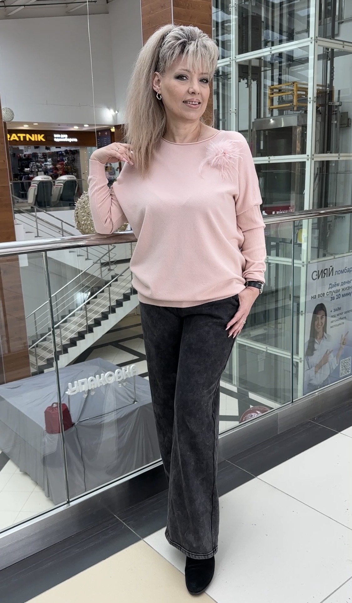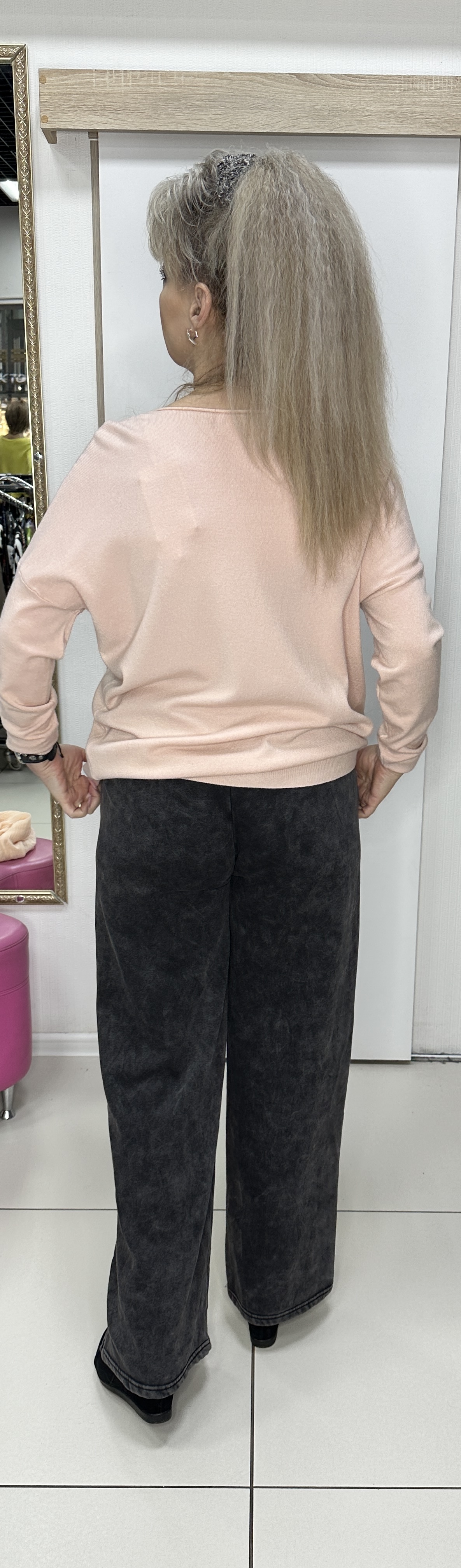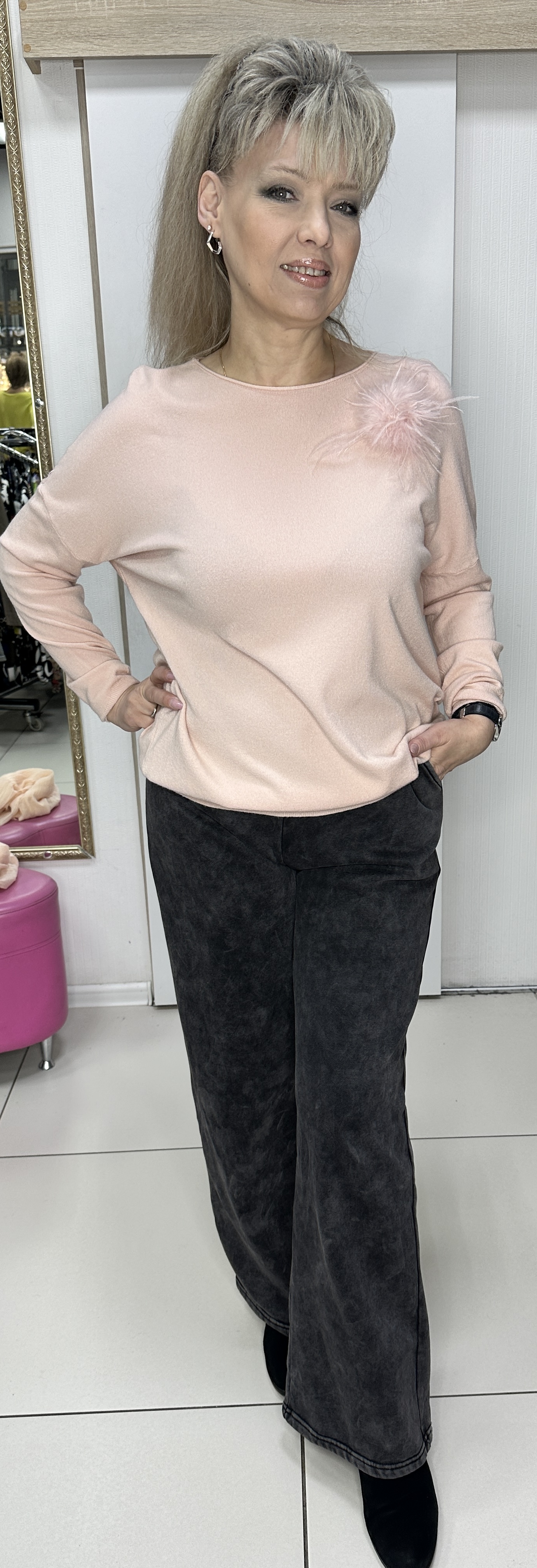 Сама нежность по тактильности этот джемпер и визуально очень приятный в пастельных розово-пудровых тонах он. Фасон у джемпера "летучая мышь", модель 81309 самая трендовая вещь в этом сезоне! Этот блузон подойдет для любого мероприятия. Бонусом идет съёмная брошка-перышко. Прекрасно смотрится в любом ансамбле.
