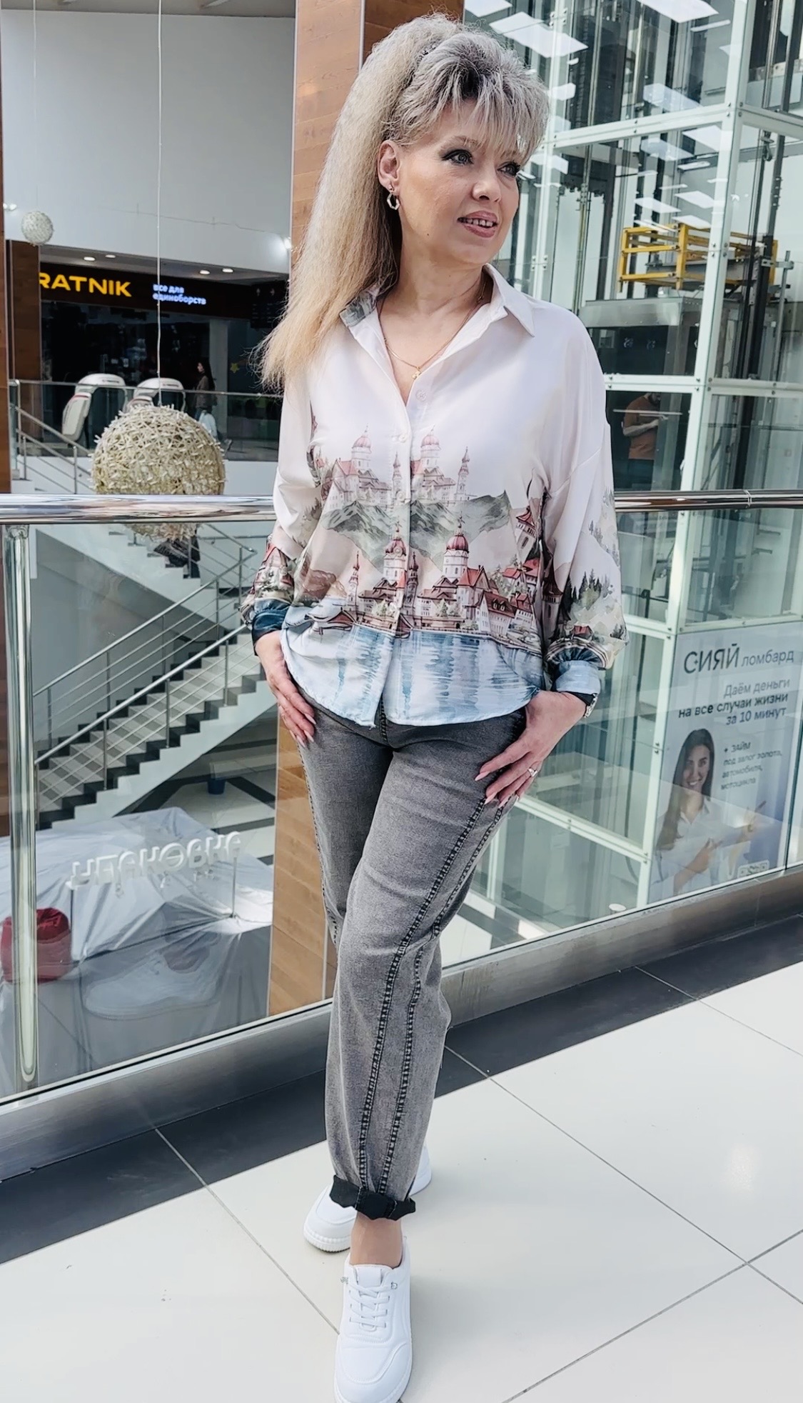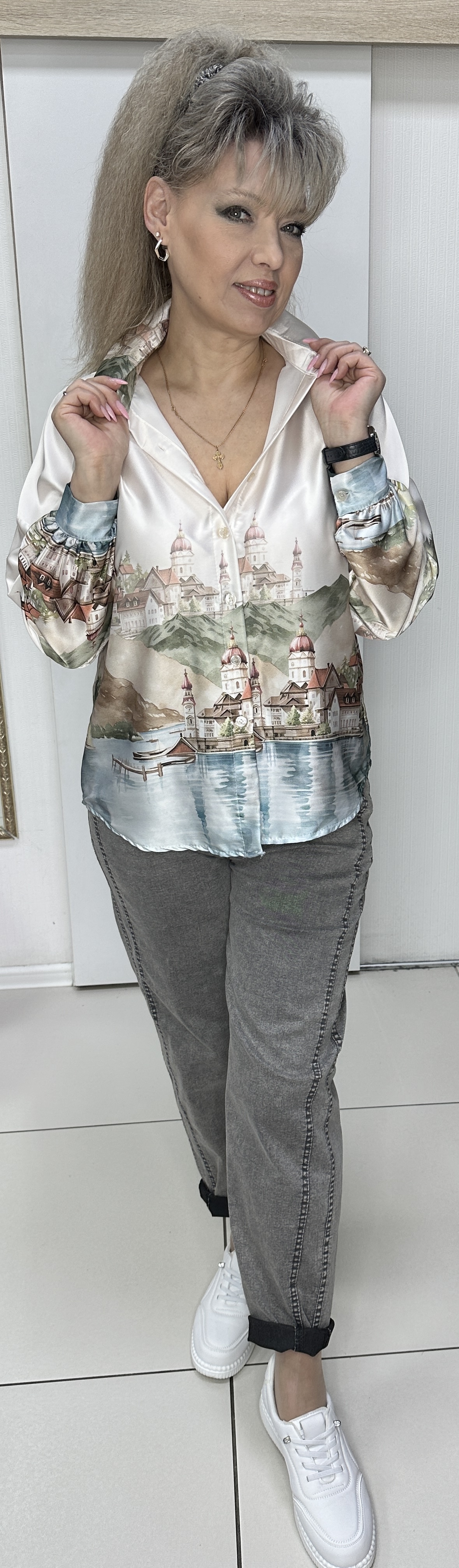 Красивая и модная рубашка с атласным блеском! Любая женщина будет выглядеть нарядно если у нее в гардеробе есть несколько свежих современных блузонов. Блузон-рубашка с цветным изображением города, модель 13239 на каждый день. Рукав длинный с манжетом, застежка на пуговицах по всей длине рубашки. Модель смотрится очень стильно и актуально.
