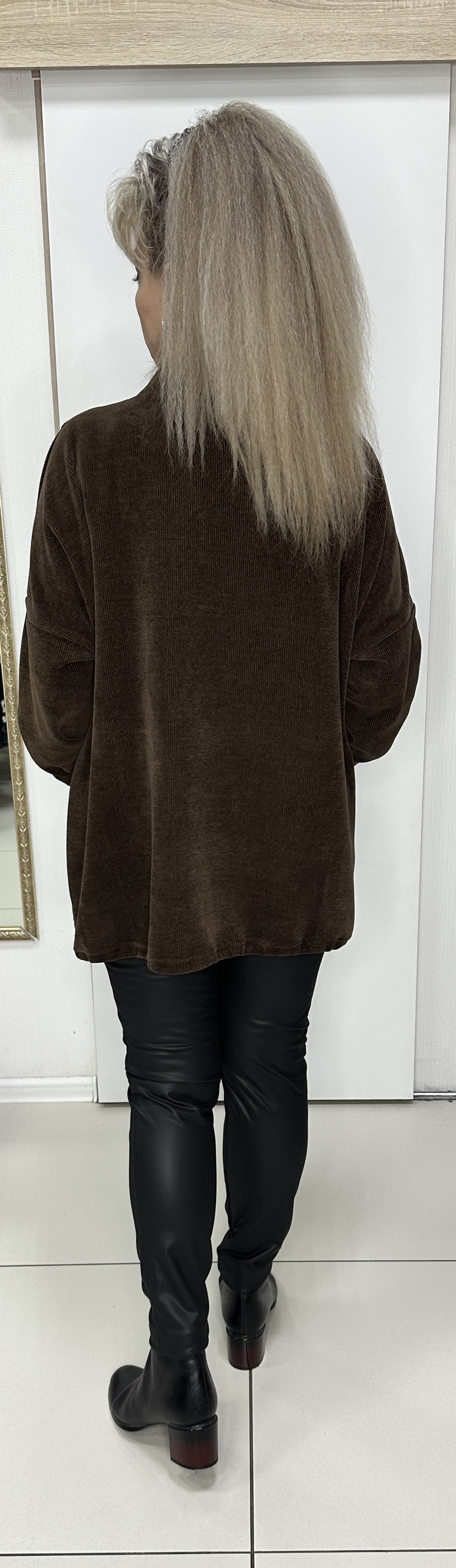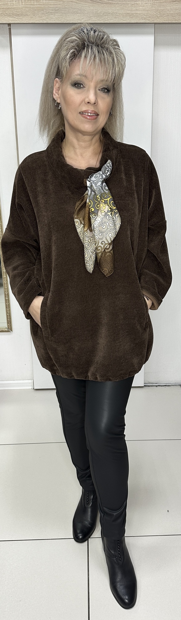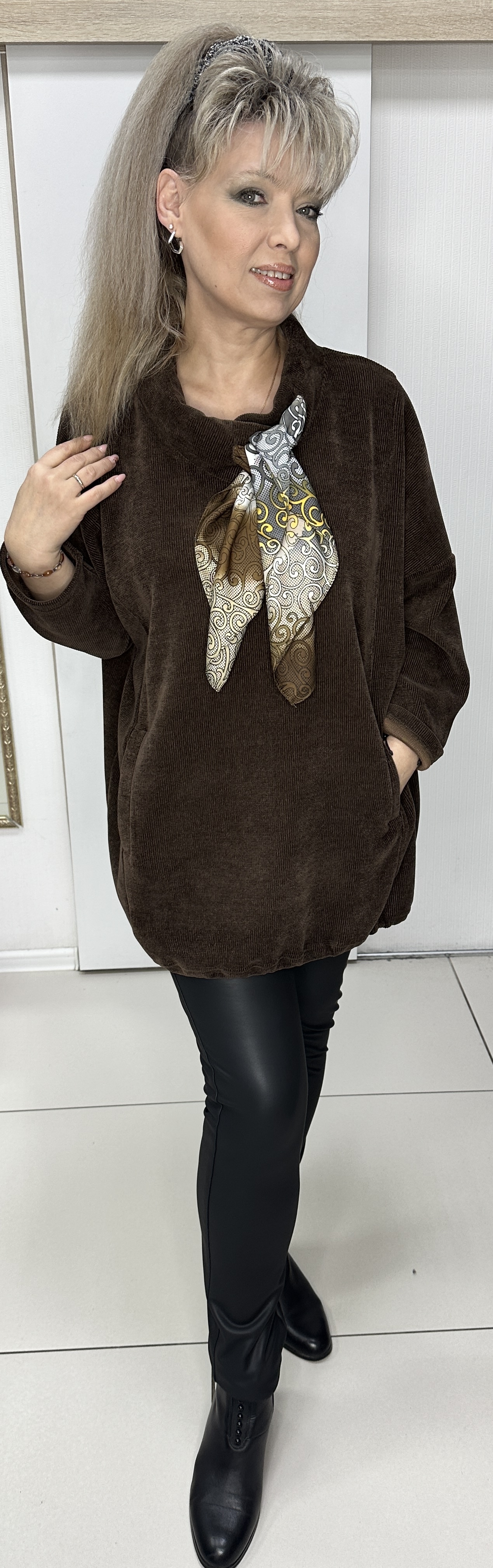 Красивый шоколадный цвет, шикарная туника из микро вельвета в принтом в виде галстука в хомуте. Блузон-туника с хомутом и галстуком в нем модель 2978 сделает привлекательной любую девушку(женщину). Свободный фасон с кармашками и кулиской по низу, тактильная нежность ткани. Спешите сделать себе такой красивый подарок!