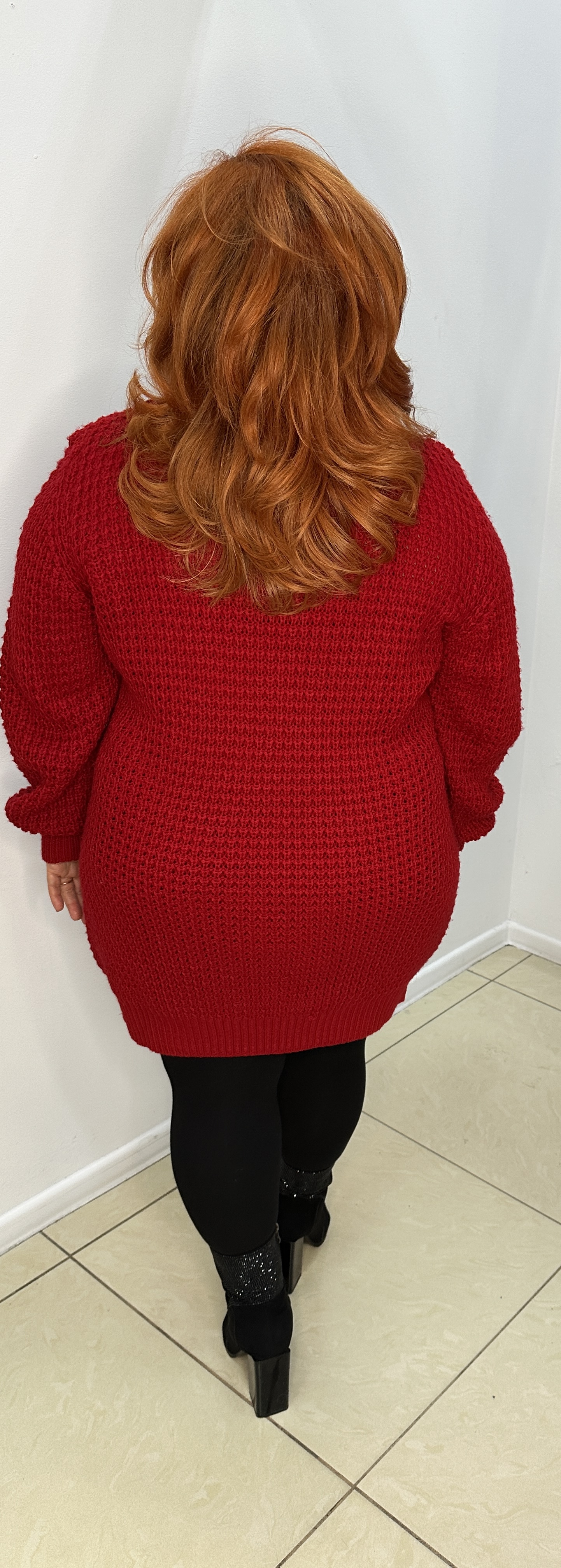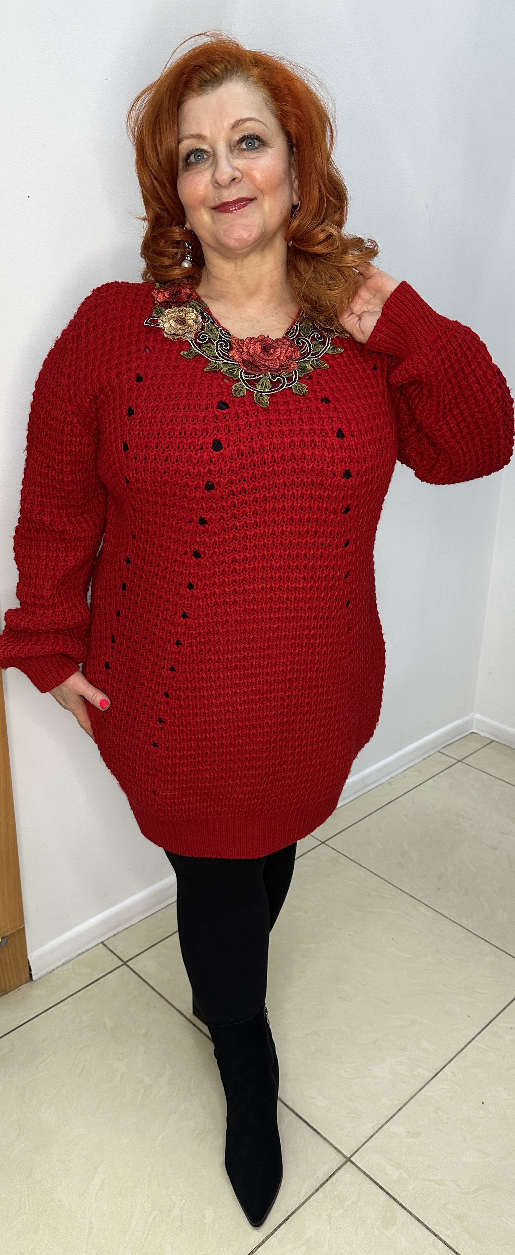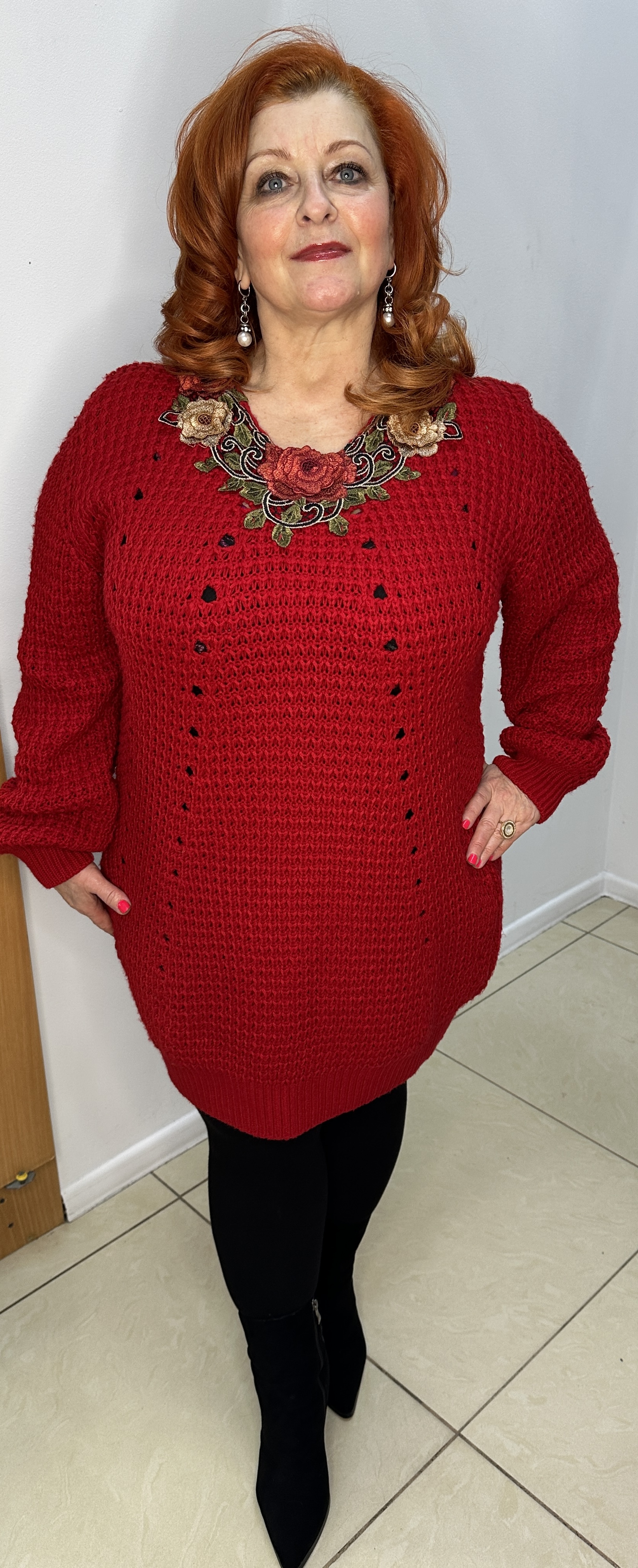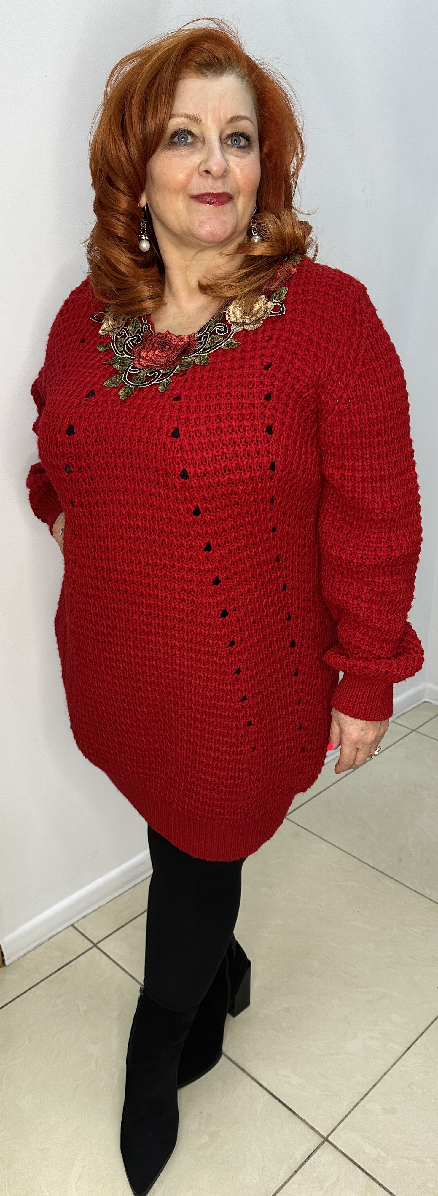 Теплый, приятный на ощупь, красный длинный свитер-платье модель 582 на каждый день – достойное приобретение в гардероб современной женщины. Модель выполнена крупной вязкой, что делает ее комфортной и удобной при ношении. Вышитые цветочки по горловине изделия и пришитые придают ему нарядный вид. Один размер остался.