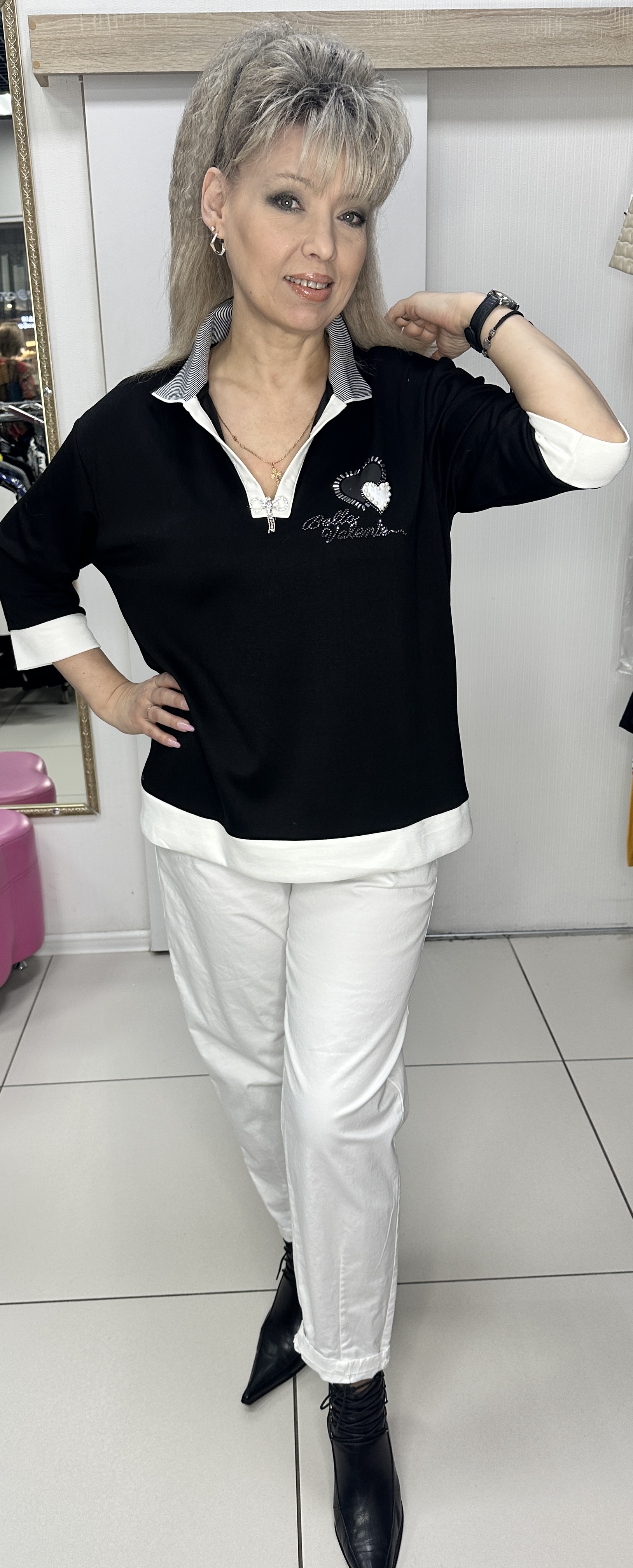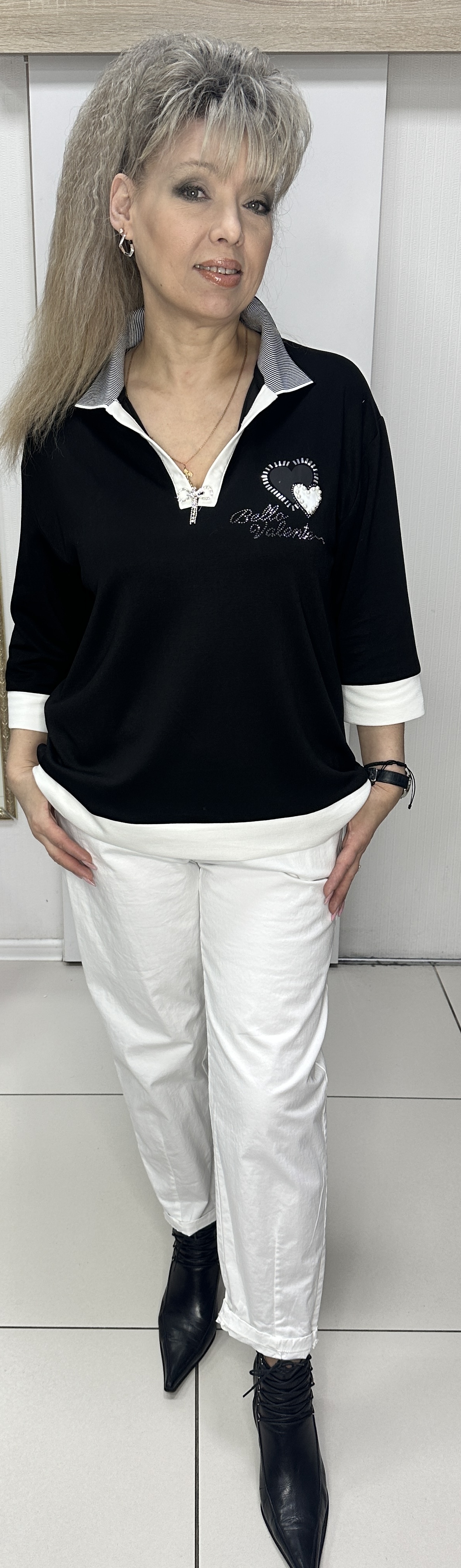 Рассмотрите этот трикотажный черный блузон с полосатым воротничком. Модель 3024, за счет белой отделки, нашивок, стразовых принтов и застежки в виде стразовых стрекоз, одна из самых эффектных. В ней визуально скрадывается размер, тактильно она очень приятная - удачное приобретение для любого сезона. Блузон смотрится очень стильно. В наличии есть черный и белый цвета.