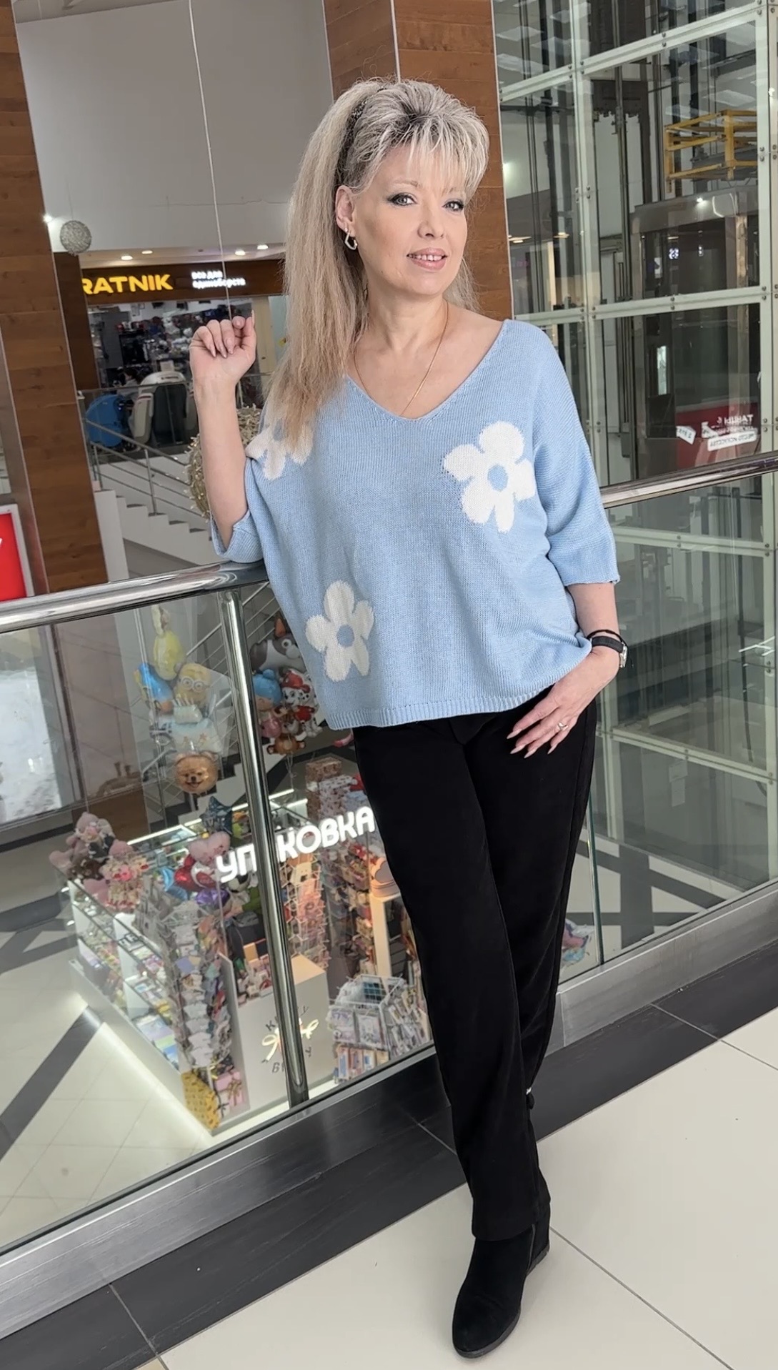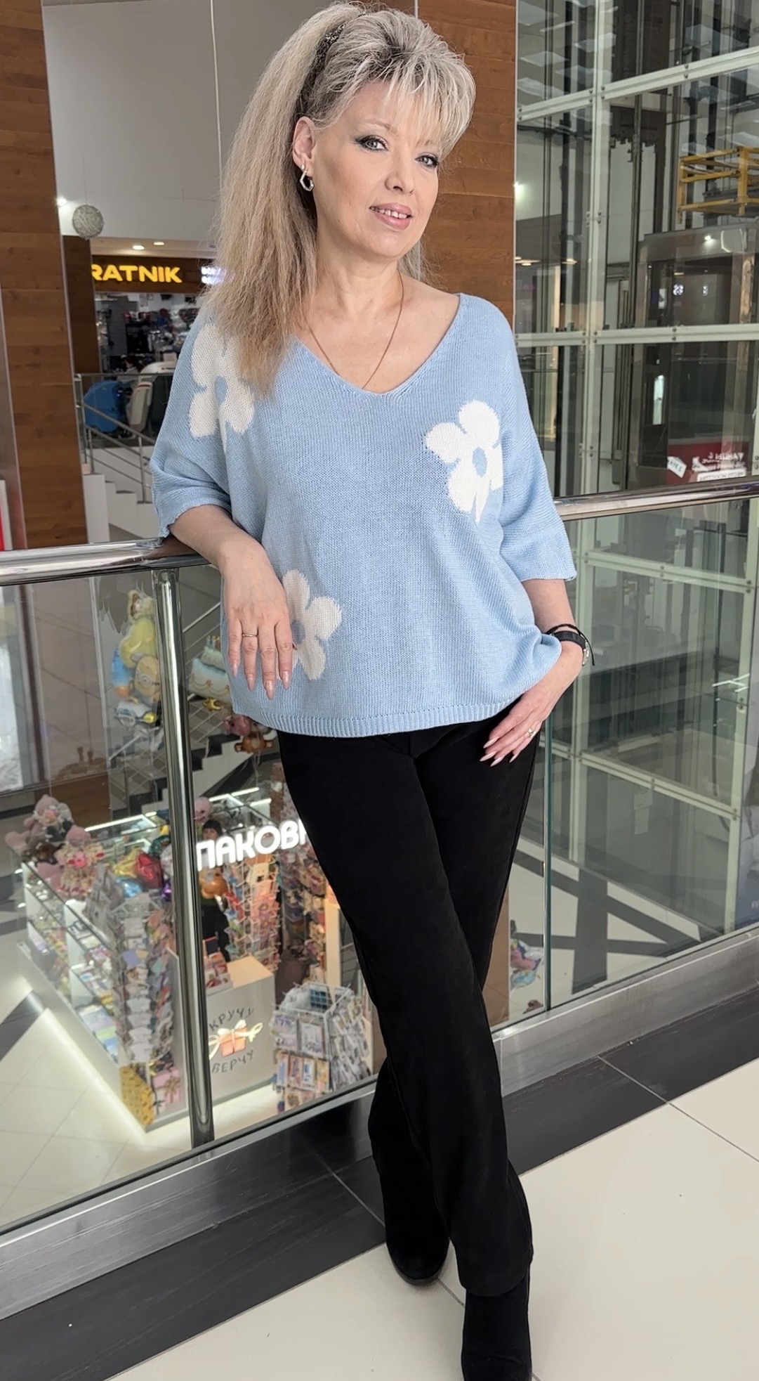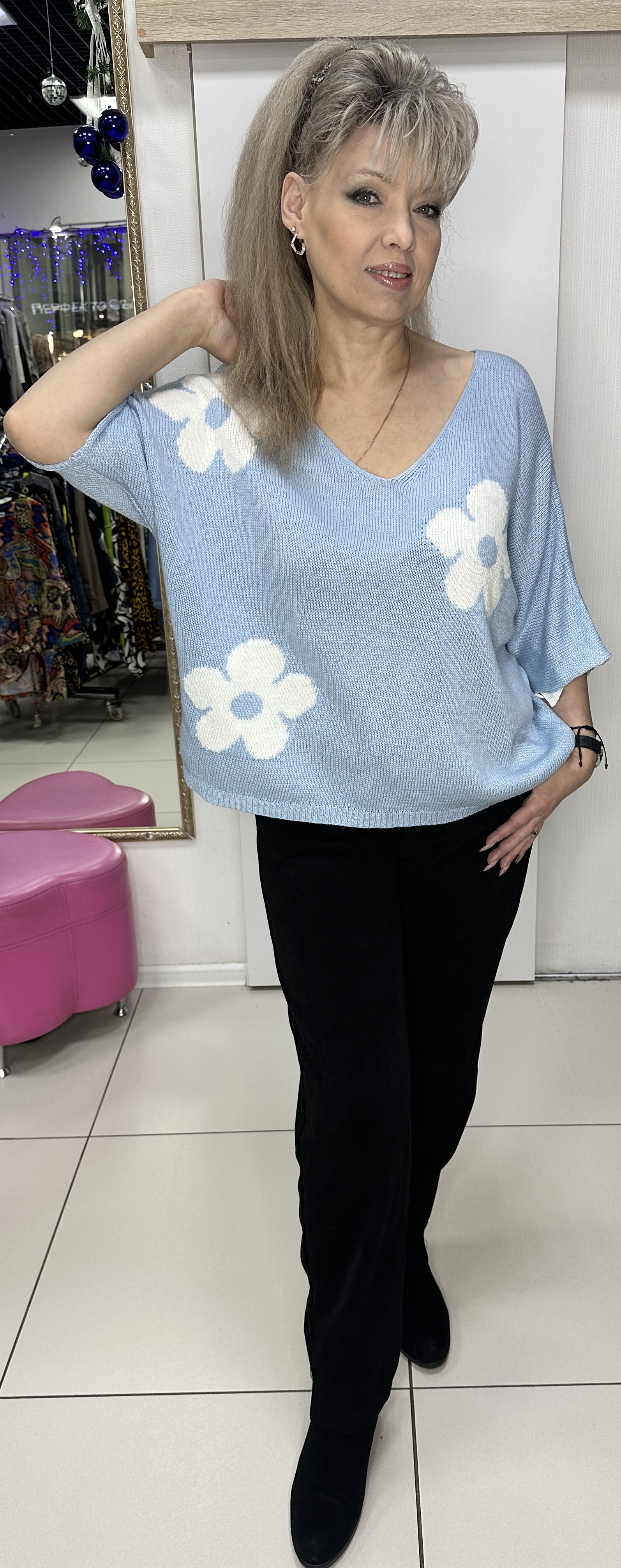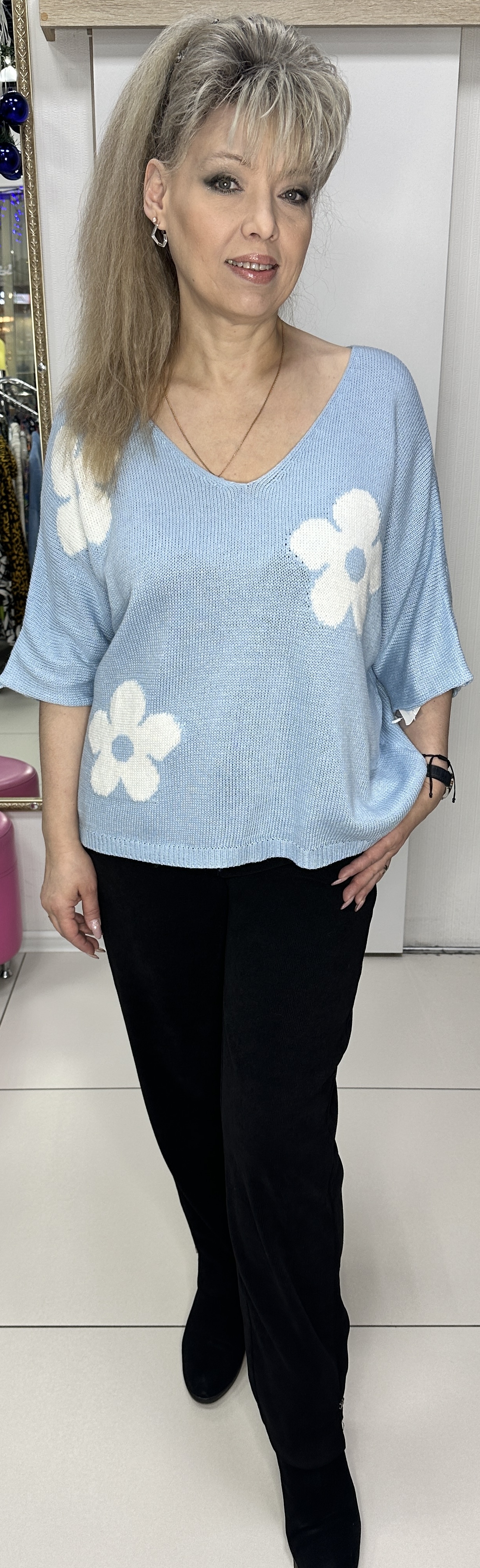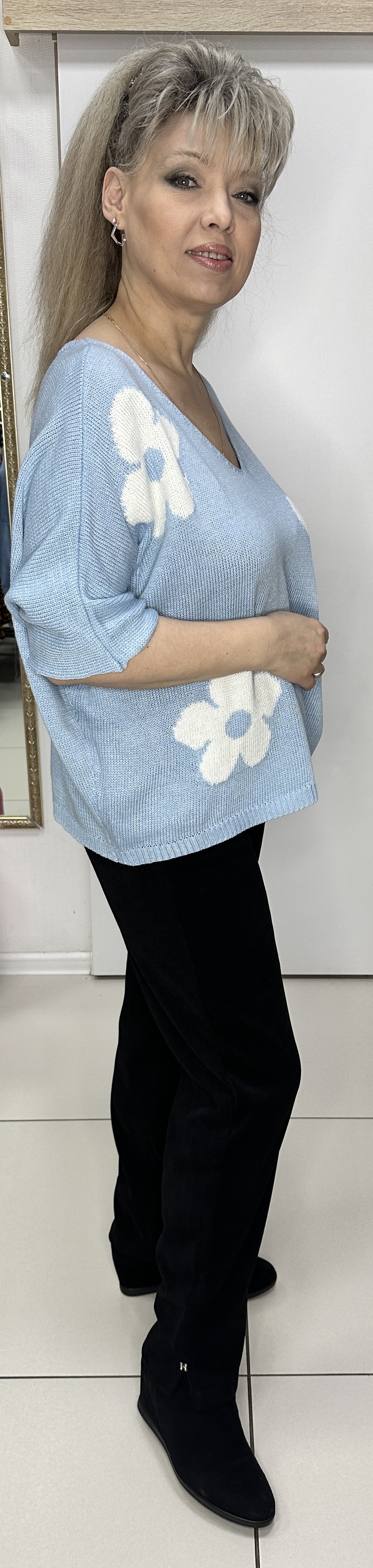 Голубой трикотажный джемпер-блузон модель 32447сделает привлекательной любую девушку(женщину). Изюминка: белые цветы по лицевой стороне. У джемпера прямой фасон заужен "летучая мышь". Изображение может быть разным, мы показали несколько из нашего ассортимента. В наличии: голубой, бирюзовый и оливковый цвета.