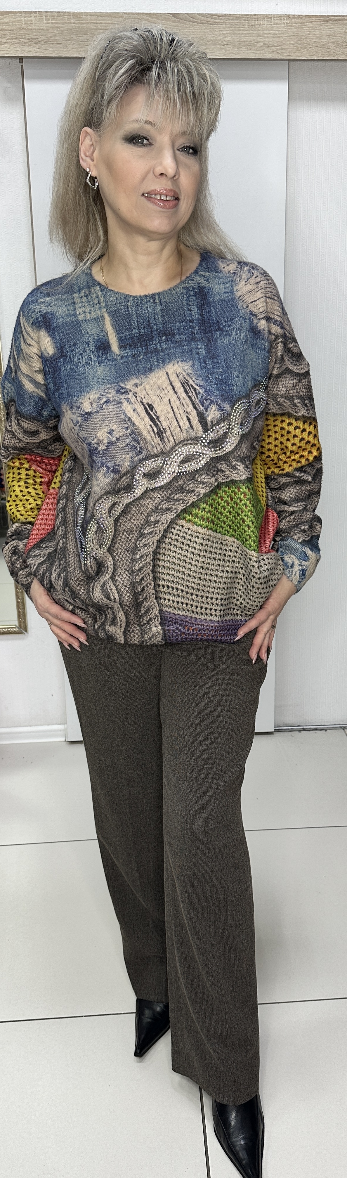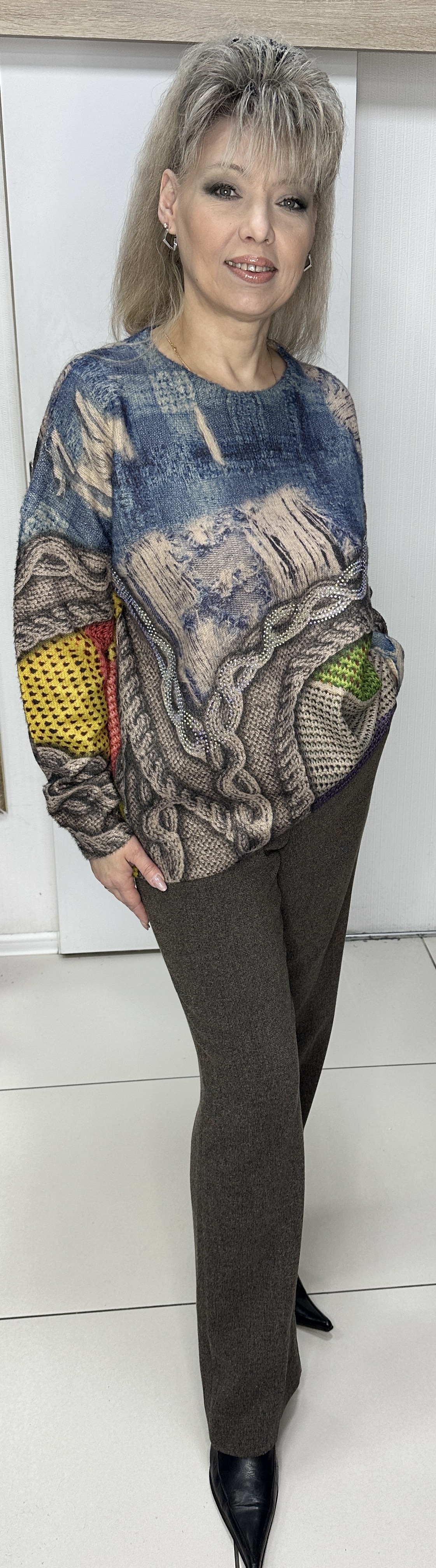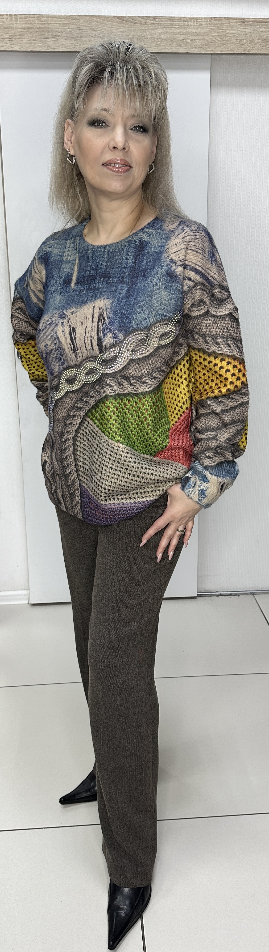 Теплый, цветной джемпер с красивым рисунком. У джемпера по лицевой стороне имеется стразовый принт модель 35194, который должна иметь каждая модница! Тактильно очень приятный и визуально тоже и вам будет всегда комфортно в нем. Рекомендуем стильным девушкам.