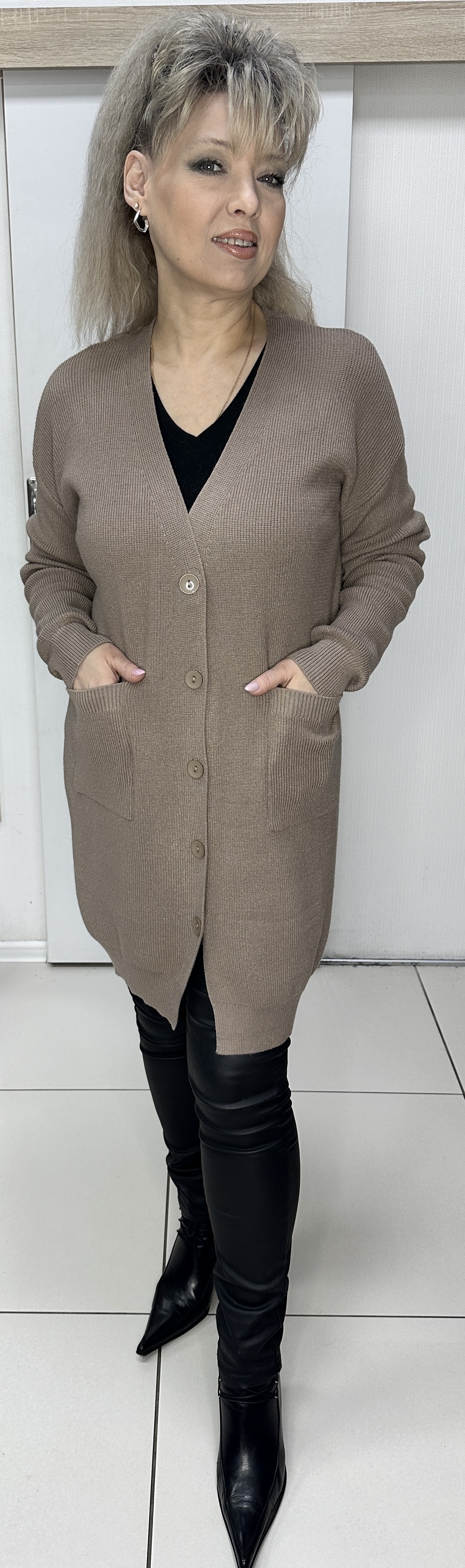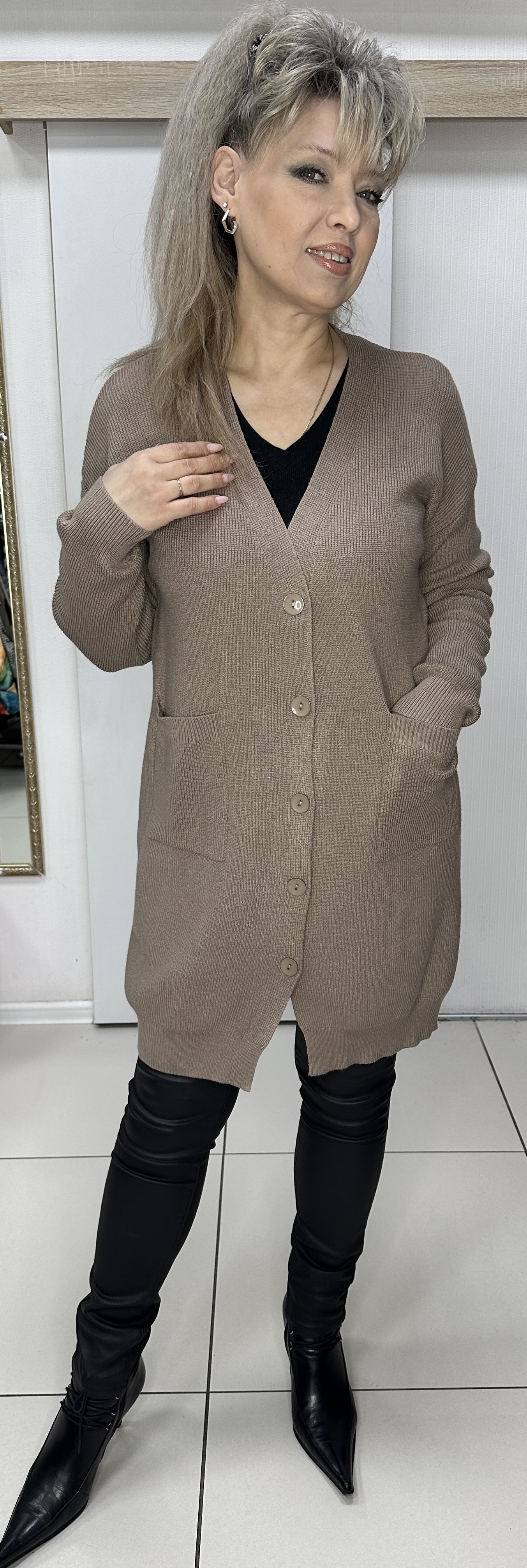 Трикотажный удлиненный жакет-кардиган модель 6019 именно то, что вам необходимо в прохладное время. На застежке-пуговицы, с кармашками, спущенное плечо, длинный рукав. Изделие хорошо сочетается с любым низом. В таком жакете вы будете прекрасно выглядеть и в театре, и во время деловой встречи.