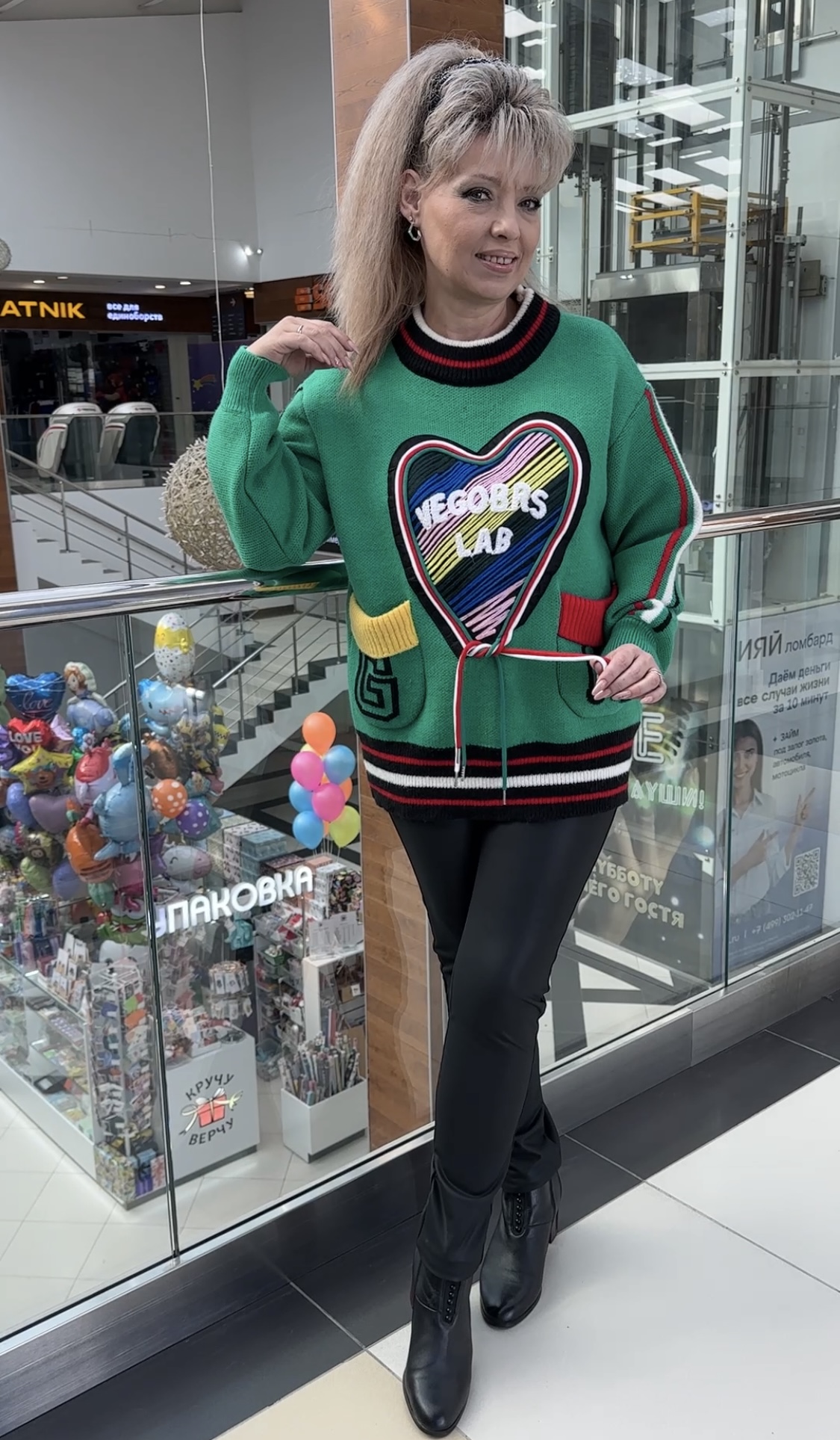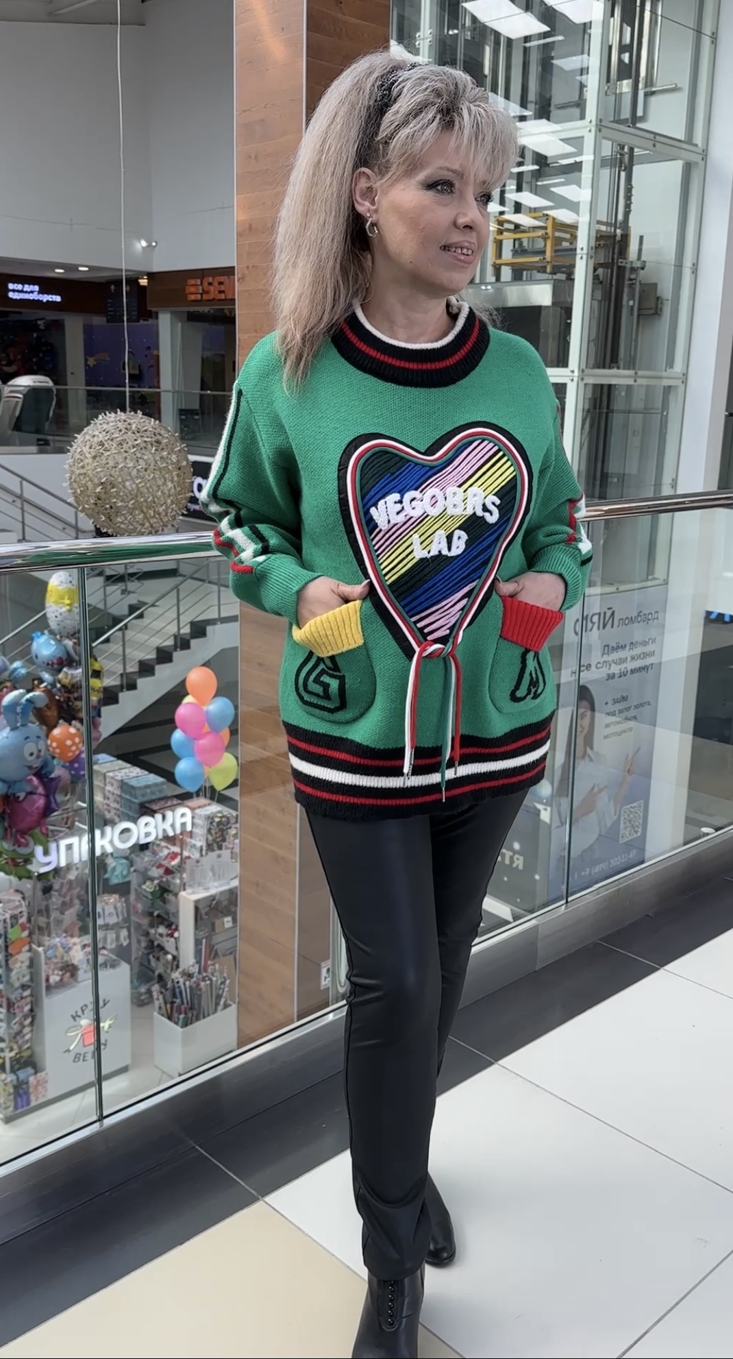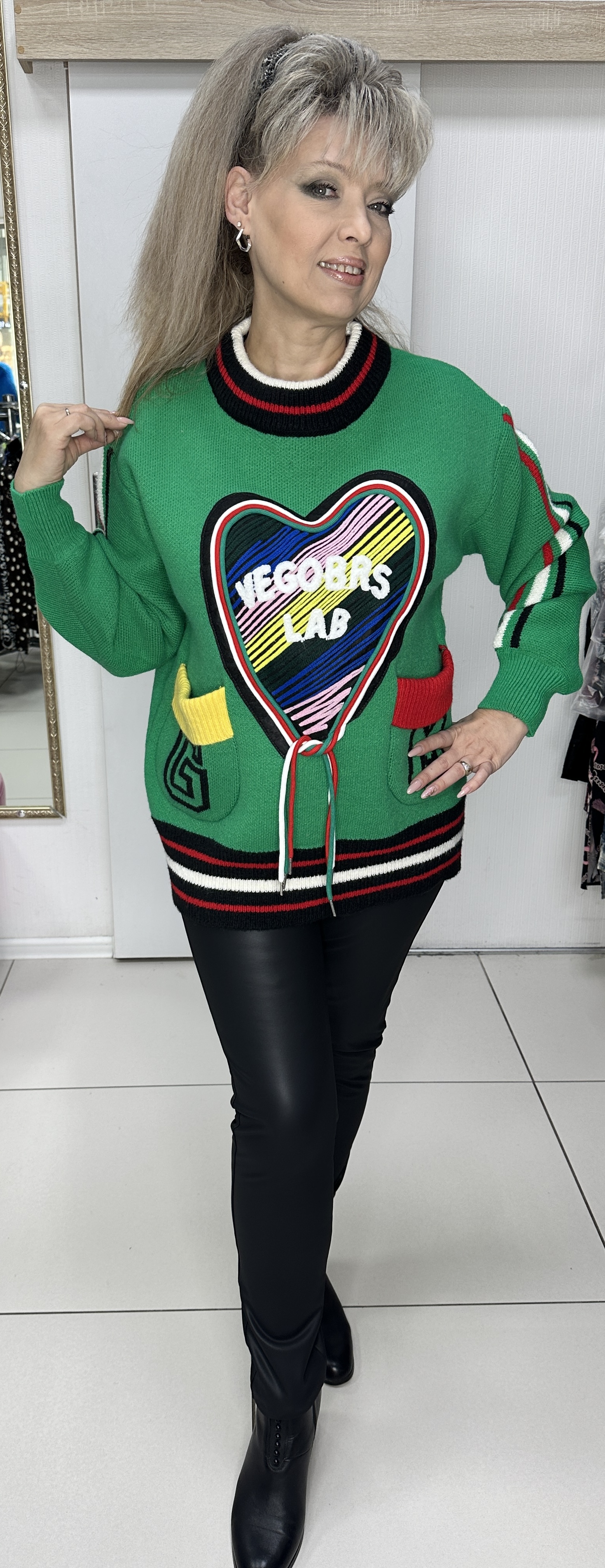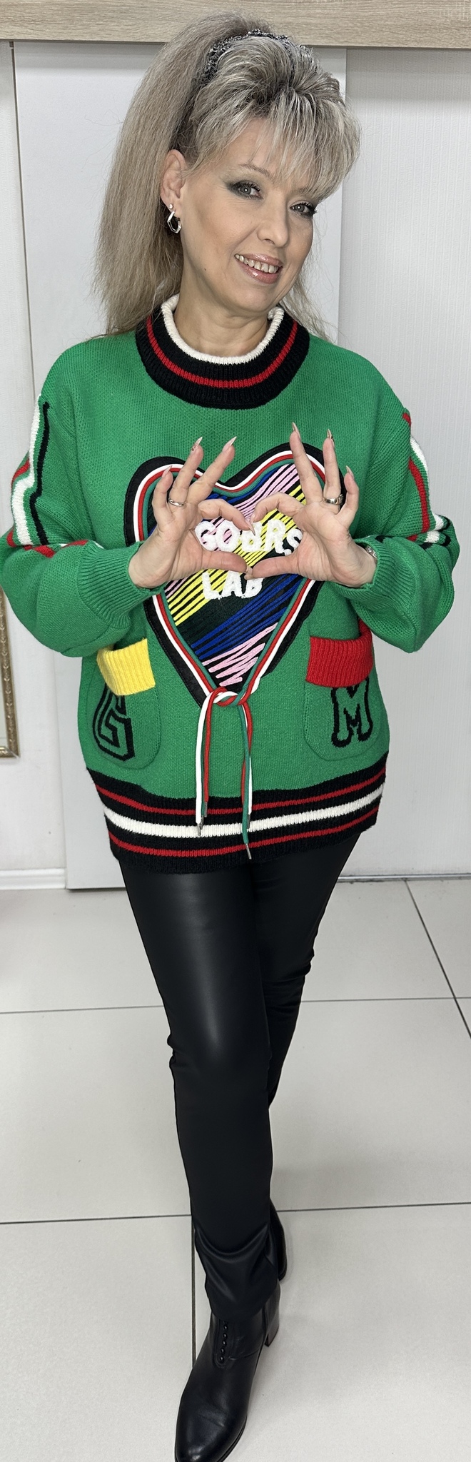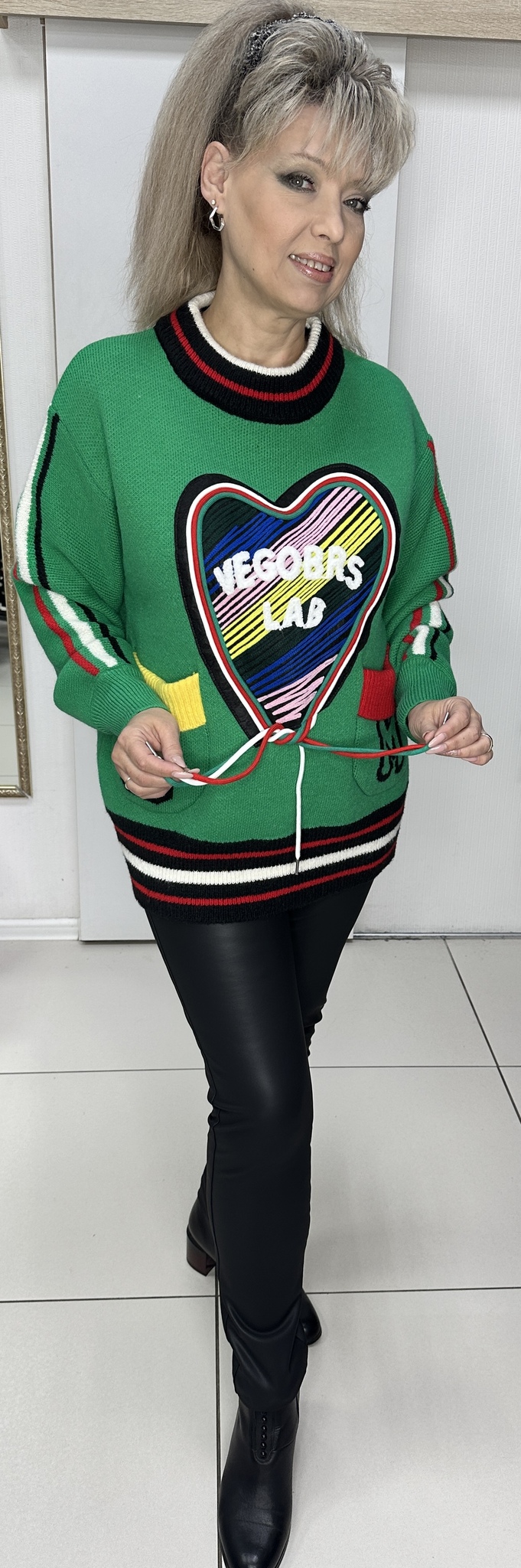 В таком джемпере трудно остаться без внимания. Очень яркий и невероятно нежный на ощупь джемпер модель 3399, который должна иметь каждая модница в этом сезоне! Красивое сочетание разных цветов на ярком зеленом цвете. Изюминка: в самой простоте вязке этого джемпера и очень оригинального принта с цветными шнурками и кармашками. Отличный вариант одежды для прохладного сезона.